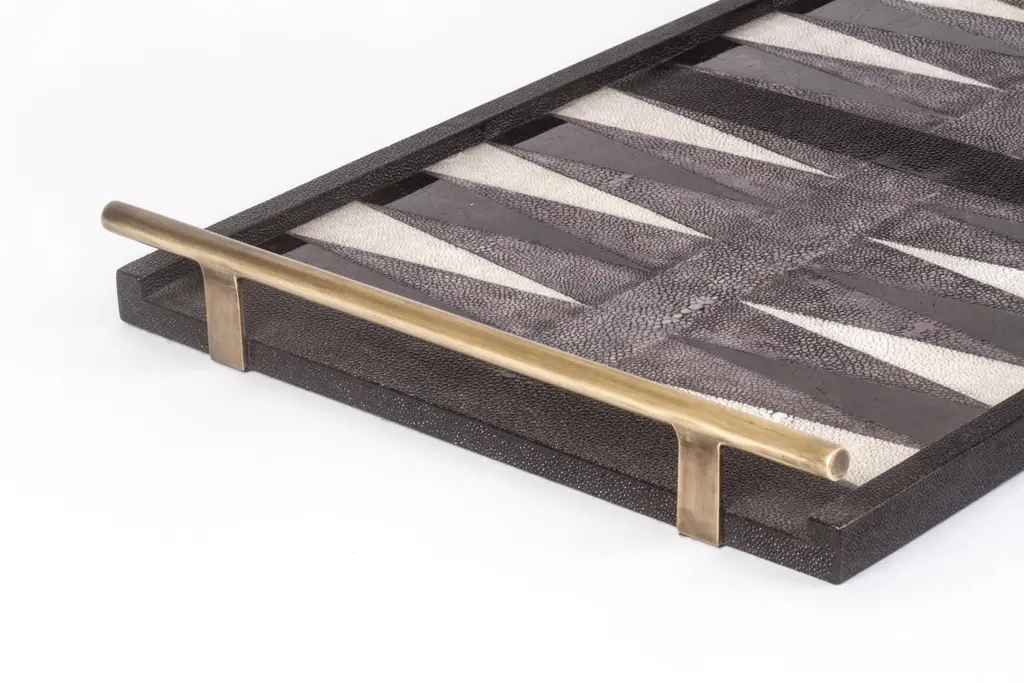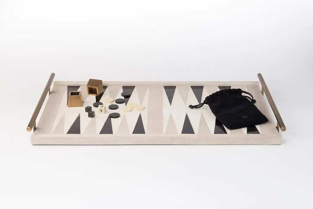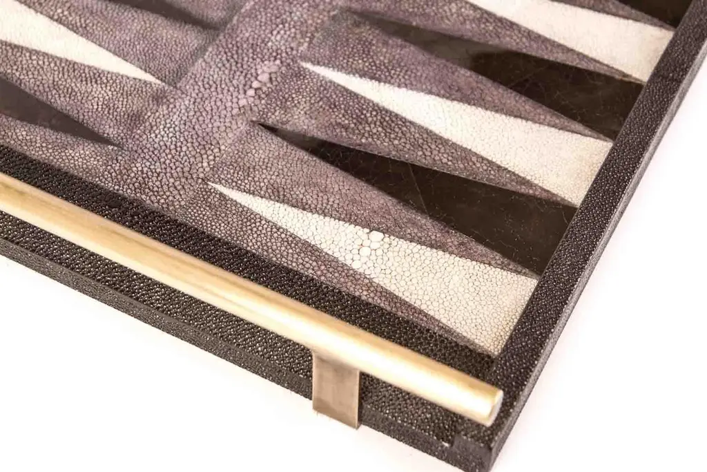 The Paris based label has distinguished themselves since their launch, with their iconic use of shagreen mixed with brass and other exotic materials. All furniture is handcrafted by skilled artisans, ultimately making each piece unique, designed in Paris and produced in the Philippines.The Kifu Paris Backgammon game tray is the ultimate luxury game. Accented with a mixture of shagreen, pen shell and bronze-patina brass this piece comes with all game parts in a velvet pouch. Available in a light or dark color-way. The dimensions of this piece are 60 x 34.5 x 5 cm All Kifu Paris pieces are handmade by artisans, ultimately making each piece unique.Custom color/sizing available on request.Wipe clean with soft dry cloth.Although inspired by her parents, her collection of Home Accessories and Furniture is a distinct identity of its own. Kifu uses handmade techniques of elaborate inlay patterns of shagreen, shells, semi-precious stones, materials she experienced as a child growing up in her parent’s studio, but interpreted in a younger quirkier way reflecting her youth. From her "jewelry inspired knobs" on decorative boxes, gold bar boxes and an extravagant inlay pattern mix of shagreen and shell inspired by galactic constellations, as seen on her enormous round mirror, is refreshing to see. Kifu embodies whimsical elements throughout her collection and is not afraid to be daring and unexpected in her approach to design. All shagreen-covered items should be kept out of direct sunlight, color variants may occur on the stingray and other exotic finishes, but this showcases the Parisian label's commitment to creating authentic luxurious products using natural components.