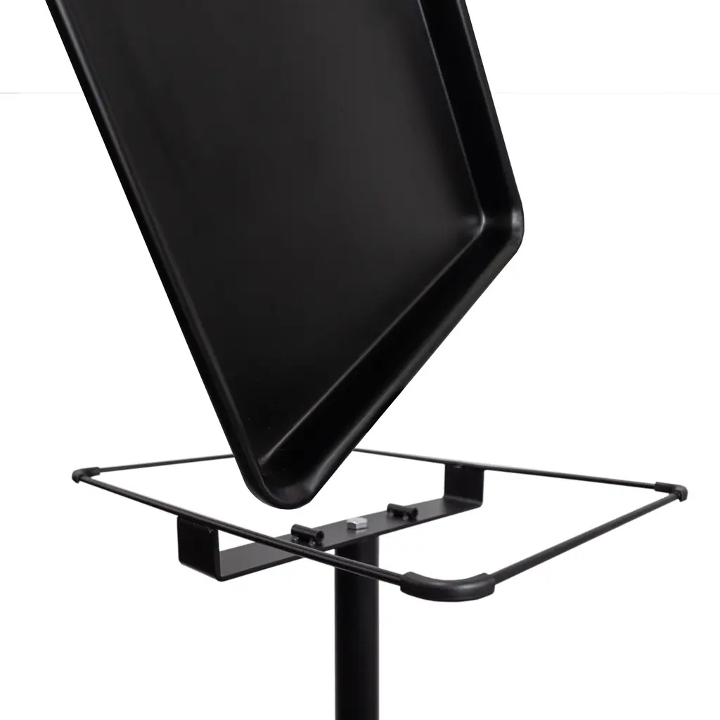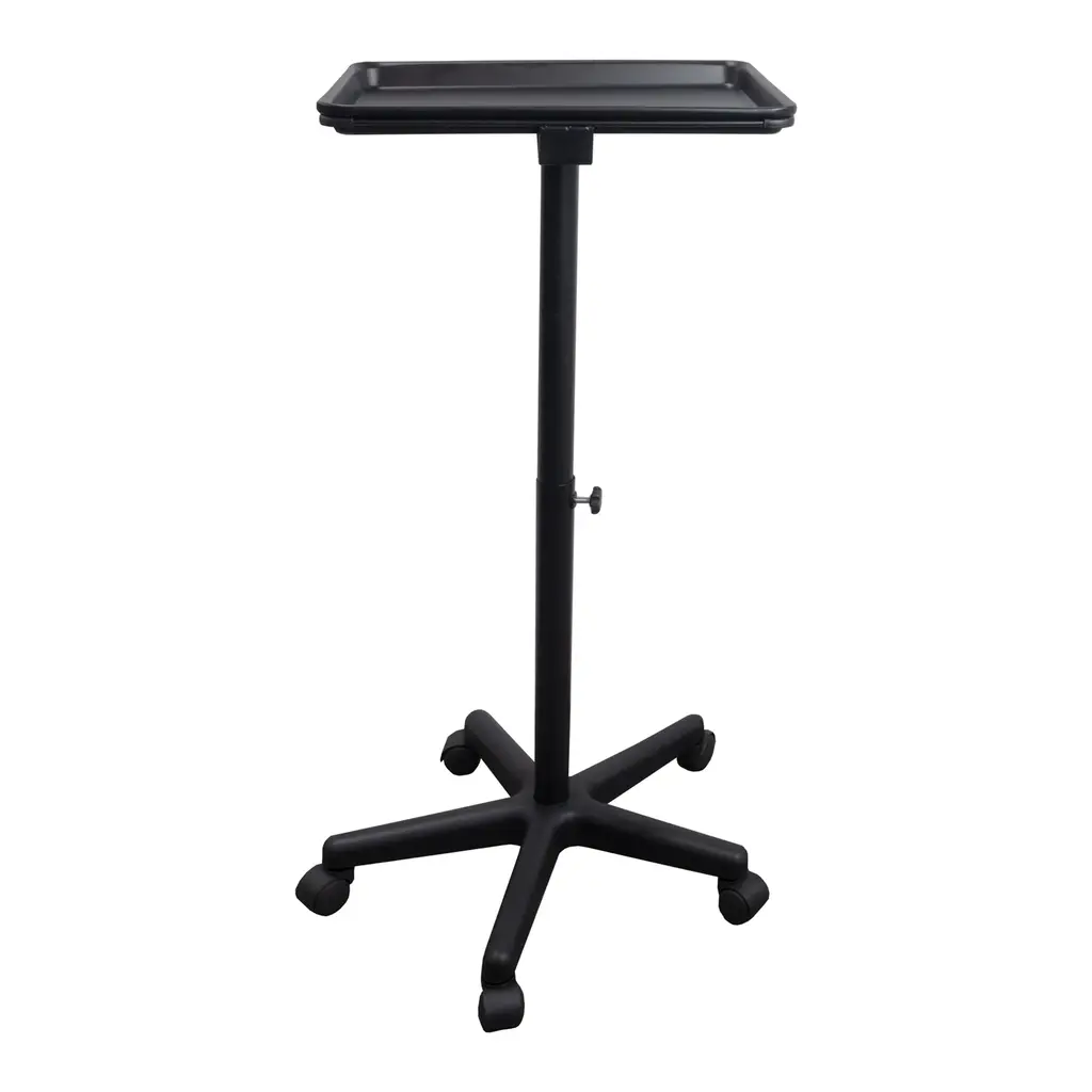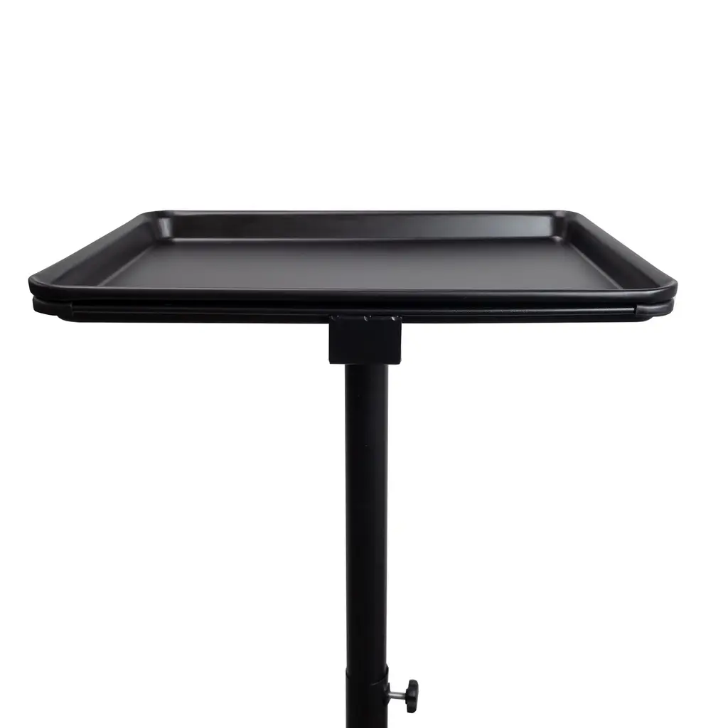 This is a perfect service tray to have for any salon. This well-crafted piece features a stain-resistant aluminum tray and sturdy steel stand. This combination of high-end materials is both functional and attractive; it will match any design scheme. The star-shaped base complete with five smooth rolling wheels enables you to migrate from one end of your space to the other with ease. The stand is also adjustable which lets you adapt to any situation. | ★Stain-resistant aluminium construction with Black Coating | ★Sturdy black steel stand with all-direction rolling casters | ★Removable Top easy to clean and replace | ★Tray surface: 13” x 18” x 1" | ★Adjustable height: 27”- 42.5”