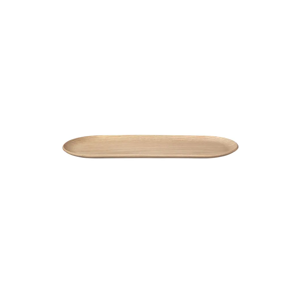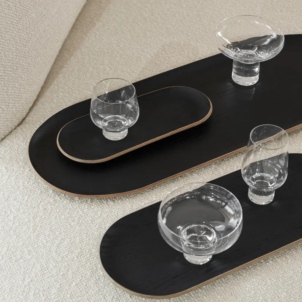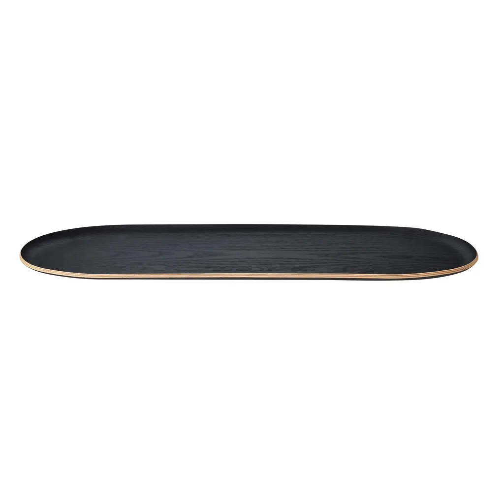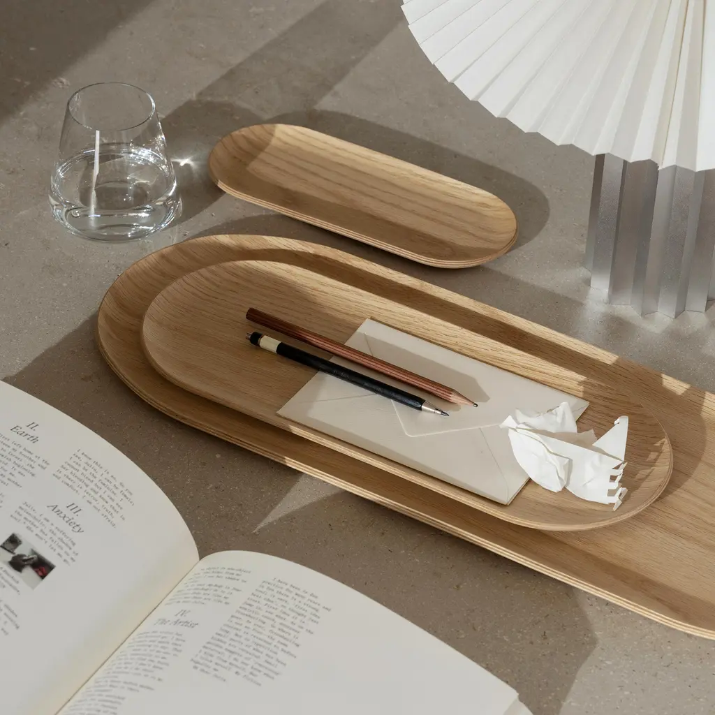 One slim lip, endless jobs—entry, bedside, desk, bath. BAKI is the quiet helper you move from room to room. In Natural Oak or Black lacquer, the shallow oval catches what tends to roam: keys and wallet by the door, jewelry and glasses on a nightstand, skincare on a vanity, remotes on a coffee table. On the desk it’s a tidy valet for pens, notes, and cards; in the kitchen it corrals oil and salt or carries a mug with a biscuit. Food-safe and anti-slip, it also serves nuts, charcuterie, or a line of canapés. The rim is low (about 0.6″), easy to lift and pass. Sizes nest neatly—small for everyday bits, medium for mail and accessories, large for coffee service or a centerpiece with candles.