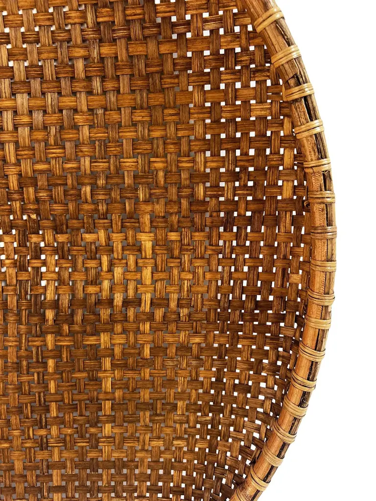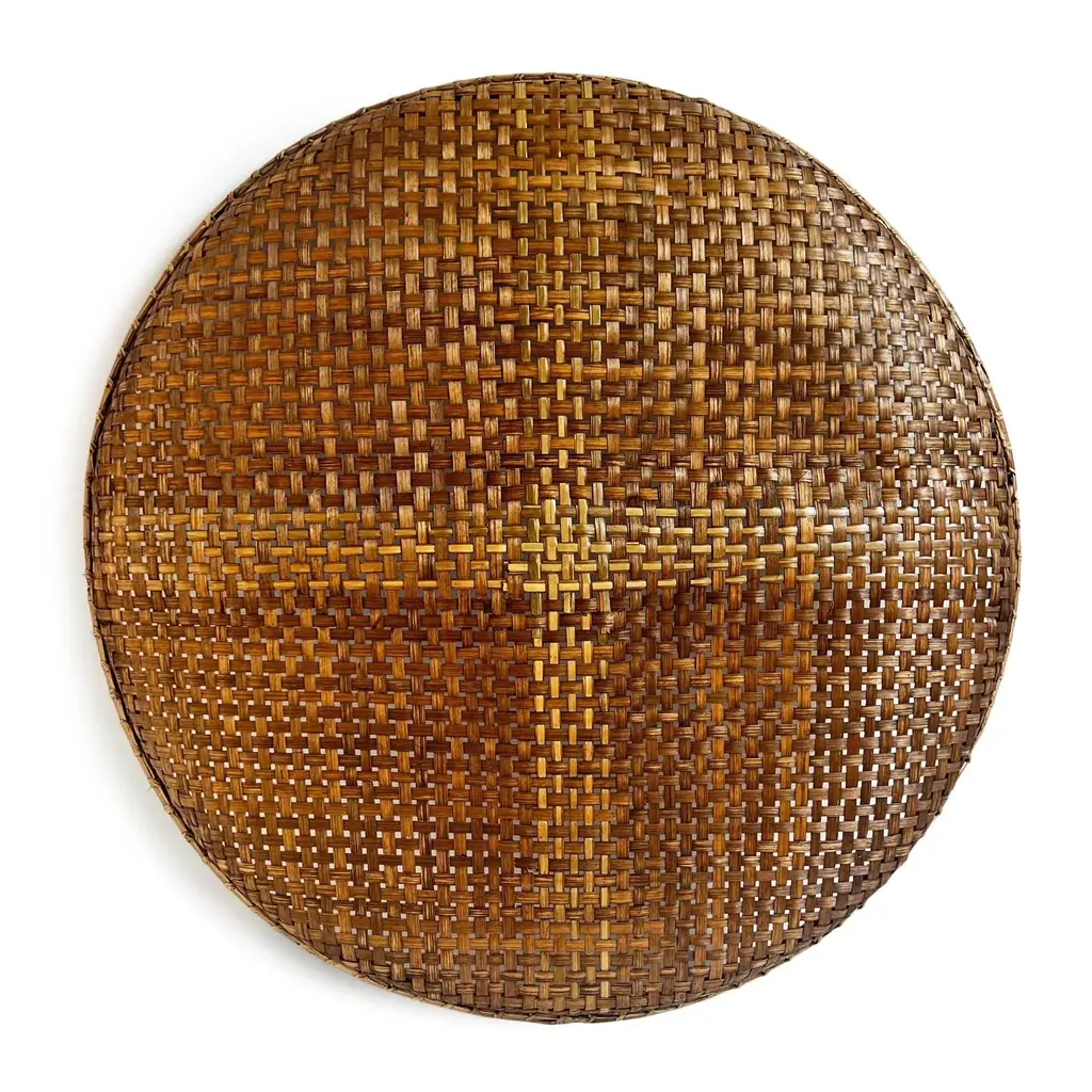 Original hand woven bamboo large round grain tray basket. Beautiful natural warm color and texture. Low profile and perfect used for storage, displaying items, or as a unique wall hanging. Each is beautifully hand crafted and therefore will have slight variations with each piece. Slight imperfections are inherent and to be cherished. Each is sold individually.