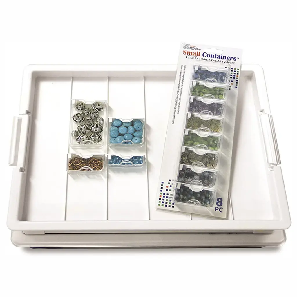Keep your beads, clasps, and other jewelry and craft supplies organized with the Bead Storage Solutions 2 Piece Plastic Organizer Tray with Lid and 48 Piece Container Set This bead storage tray comes with a clear plastic snap-on lid. The empty tray lets you decide which containers or divider to use to sort your jewelry-making supplies, beads, and more. The bead organizer box helps keep your workspace neat and clean. The clear, snap-shut lid makes it easy for you to see all of your beads and supplies without having to open the box. No matter what you like to create, keep small crafting supplies sorted and organized in 1 convenient spot with the Bead Storage Solutions 2 Piece Plastic Organizer Tray with Lid. Each of the included containers is constructed of durable clear plastic so you can easily see which beads are in which container. The lids snap shut, securing even the smallest beads, crystals, and fasteners. Take these containers with you to craft shows, studios, and more to continue working on your projects. Add labels to easily keep track of your different beads. Label them by color, size, or type.