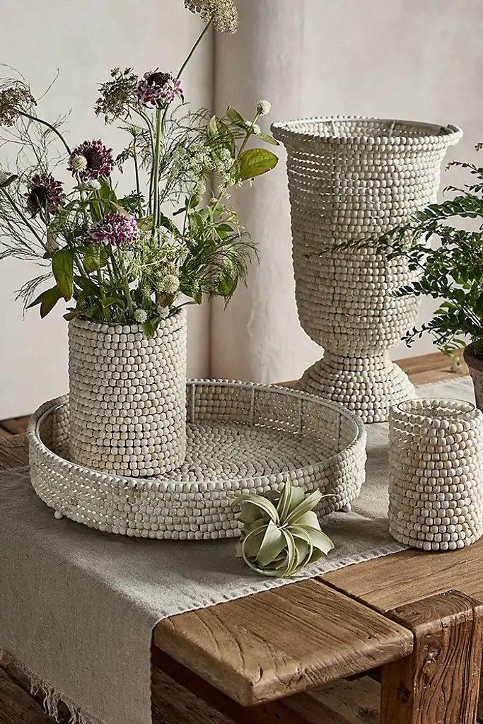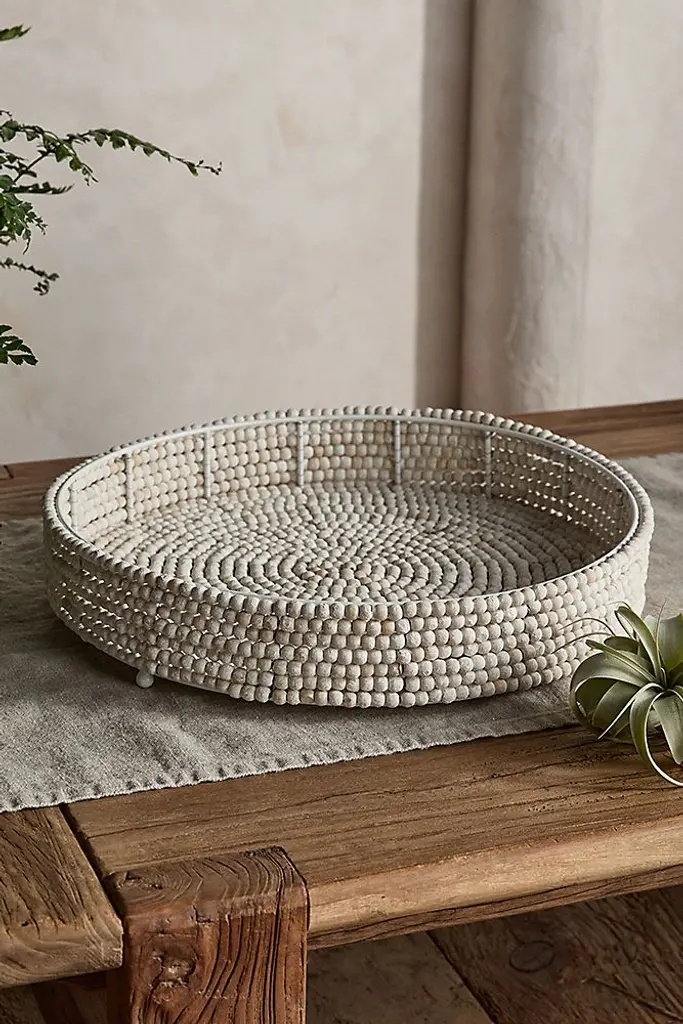 Finished with wood beads for an earthy look, this decorative tray adds a natural touch to your entryway table, dresser top, or nightstand.