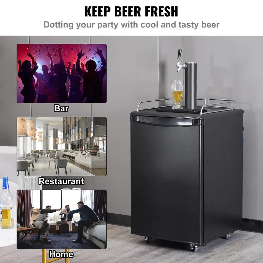 Taste the Perfect Beer: Are you ready to enjoy a refreshing beer? Our beer kegerator keeps your beer fresh at a low temperature, while efficiently chilling it. With its auto-defrosting design, it always maintains the best performance. The extended 9.8 ft long beer hose ensures proper foam, resulting in the best flavors and taste. Spacious and Reliable: We offer an external bracket for the CO₂ tank, which helps save space inside the kegerator. The kegerator itself is spacious enough to accommodate beer barrels of varying sizes, including US-standard full-size, quarter, and sixth barrels. Plus, there are two additional shelves provided, which allow you to use the kegerator as a refrigerator as well. Set the Right Temperature: The keg refrigerator has a knob that lets you easily adjust the inner temperature from 32 to 50℉. This allows you to chill your beer to your preferred temperature. Plus, if there is a power outage, the refrigerator will automatically restore the temperature you set once power is restored. Designed with You in Mind: Our kegerator fridge comes with four wheels, making it easy to move around. You can lock the two front wheels to prevent it from sliding. The drip tray catches spills and keeps things clean. Plus, the stainless steel guard rail provides extra safety. Everything You Deserve: Installing our beer tap kegerator is a breeze. It comes with all the necessary accessories, including a dual/single tap beer tower, a beer line, a CO₂ tank (empty), a tank bracket, and an installation kit. We also provide hose clamps and gaskets to prevent leaks. So, there's no need to worry about a thing! Package Content 1 x Beer Kegerator 1 x Dual Tap Beer Tower/1 x Single Tap Beer Tower 2 x Shelves 1 x Beer and Air Line 1 x D-type Sankey Keg Coupler 1 x CO₂ Tank Regulator 1 x 5 lbs CO₂ Tank(empty) 1 x Wrench 1 x User Manual