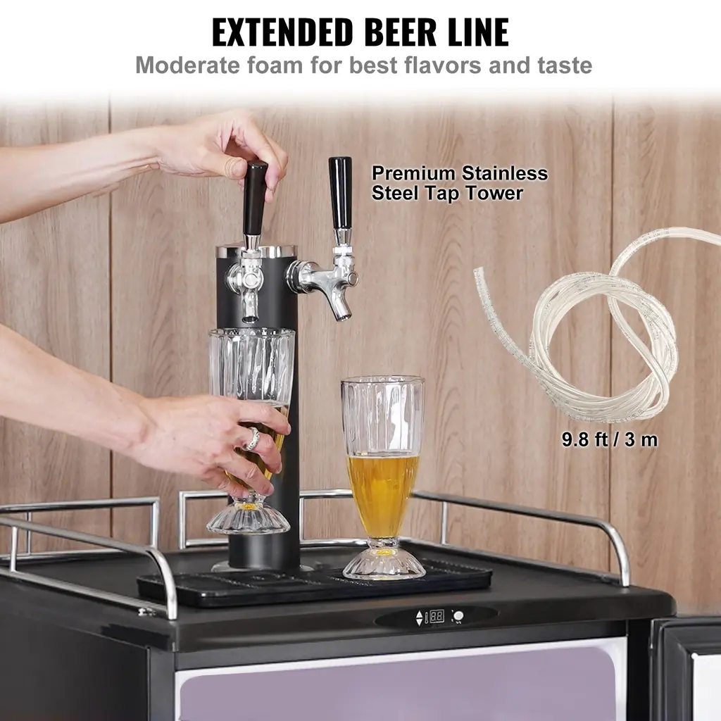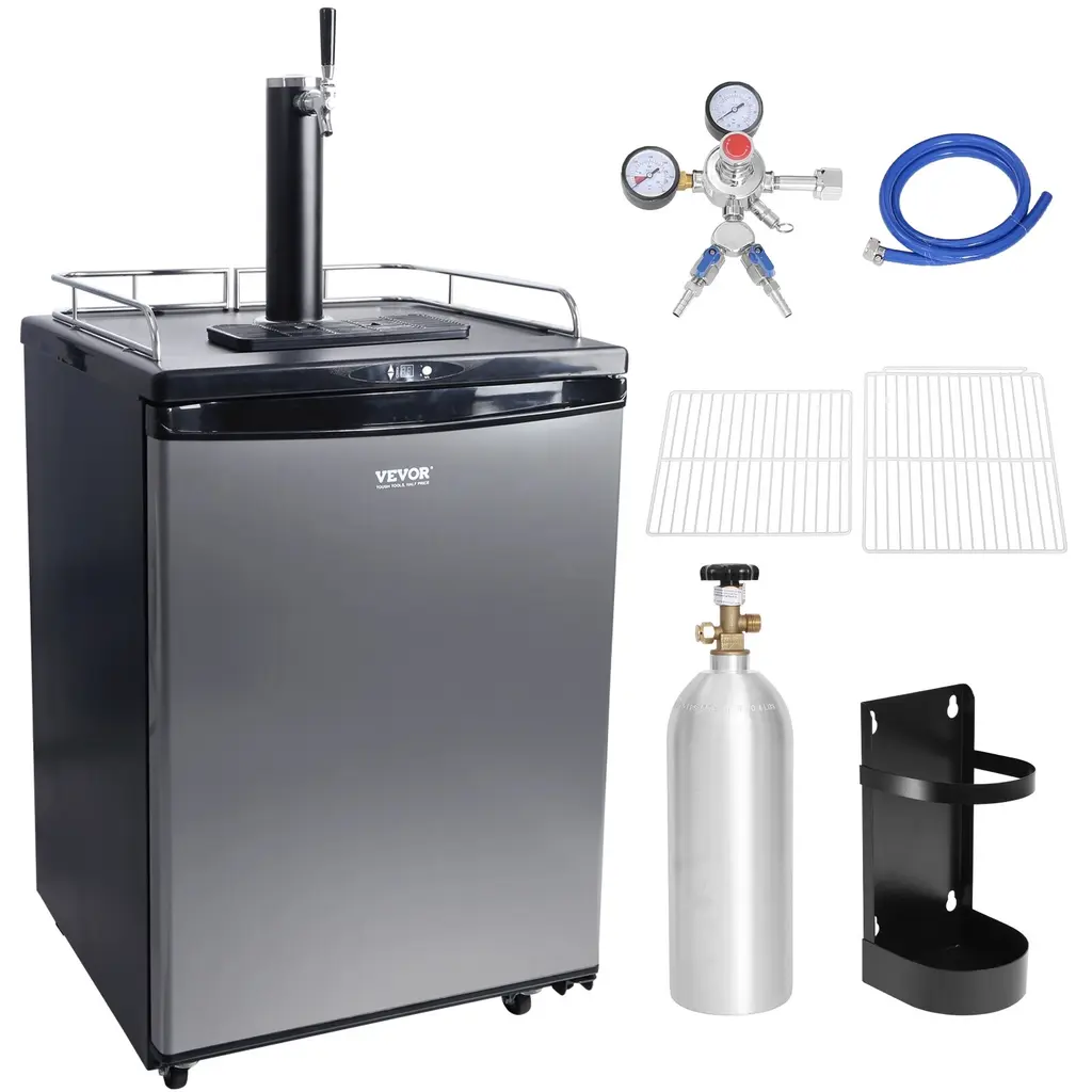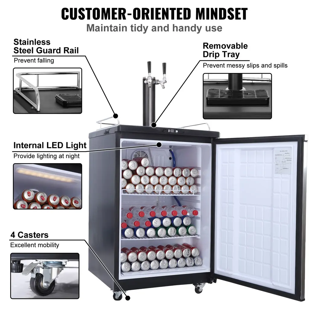 Taste the Perfect Beer: Are you ready to enjoy a refreshing beer? Our beer kegerator keeps your beer fresh at a low temperature, while quickly chilling it with the fan cooling system. With its auto-defrosting design, it always maintains the best performance. The extended 9.8 ft long beer hose ensures proper foam, resulting in the best flavors and taste. Spacious and Reliable: We offer an external bracket for the CO₂ tank, which helps save space inside the kegerator. The kegerator itself is spacious enough to accommodate beer barrels of varying sizes, including US-standard full-size, quarter, and sixth barrels. Plus, there are two additional shelves provided, which allow you to use the kegerator as a refrigerator as well. Set the Right Temperature: The keg refrigerator has a digital temperature control panel that lets you easily adjust the inner temperature from 32 to 75.2℉. This allows you to chill your beer to your preferred temperature. Plus, if there is a power outage, the refrigerator will automatically restore the temperature you set once power is restored. Designed with You in Mind: This LED light makes it easier to see and grab a cold drink at night. It also comes with four wheels, making it easy to move around. You can lock the two front wheels to prevent it from sliding. The drip tray catches spills and keeps things clean. Plus, the stainless steel guard rail provides extra safety. Everything You Deserve: Installing our beer tap kegerator is a breeze. It comes with all the necessary accessories, including a dual / single tap beer tower, a beer line, a CO₂ tank (empty), a tank bracket, and an installation kit. We also provide hose clamps and gaskets to prevent leaks. So, there's no need to worry about a thing! Package Content 1 x Beer Kegerator 1 x Dual / Single Tap Beer Tower 2 x Shelves 1 x Beer and Air Line 1 x D-type Sankey Keg Coupler 1 x CO₂ Tank Regulator 1 x 5 lbs CO₂ Tank(empty) 1 x Wrench 1 x User Manual
