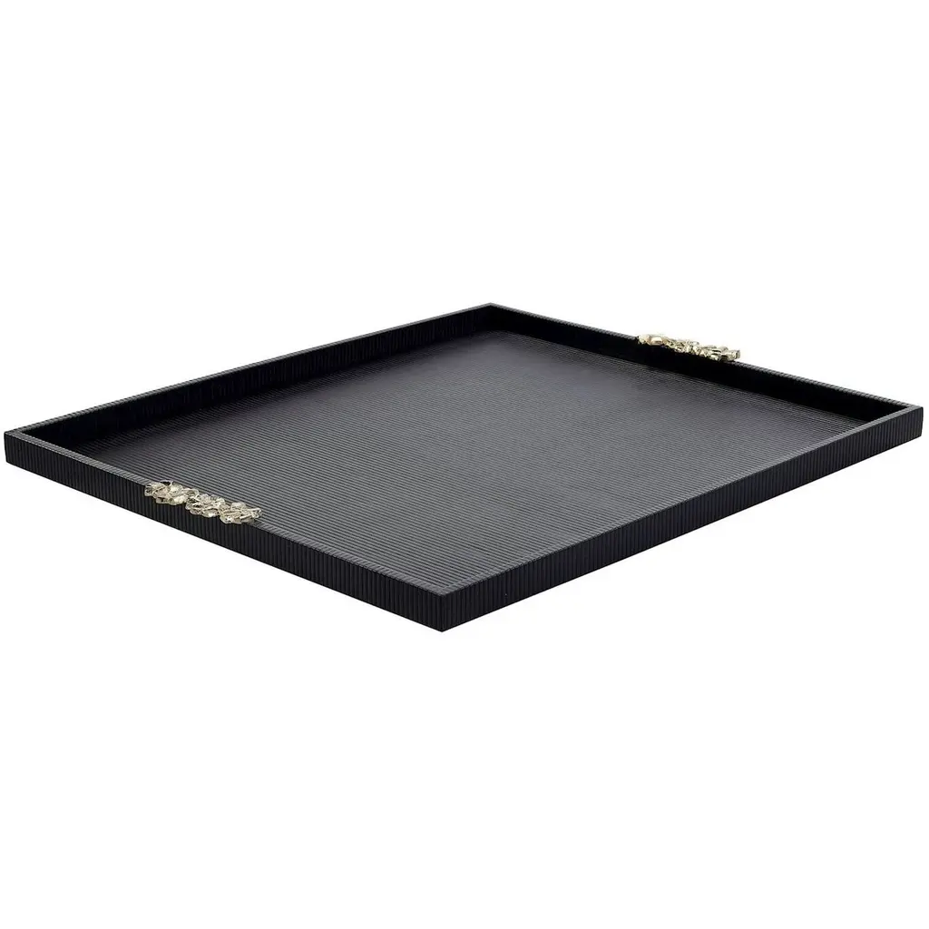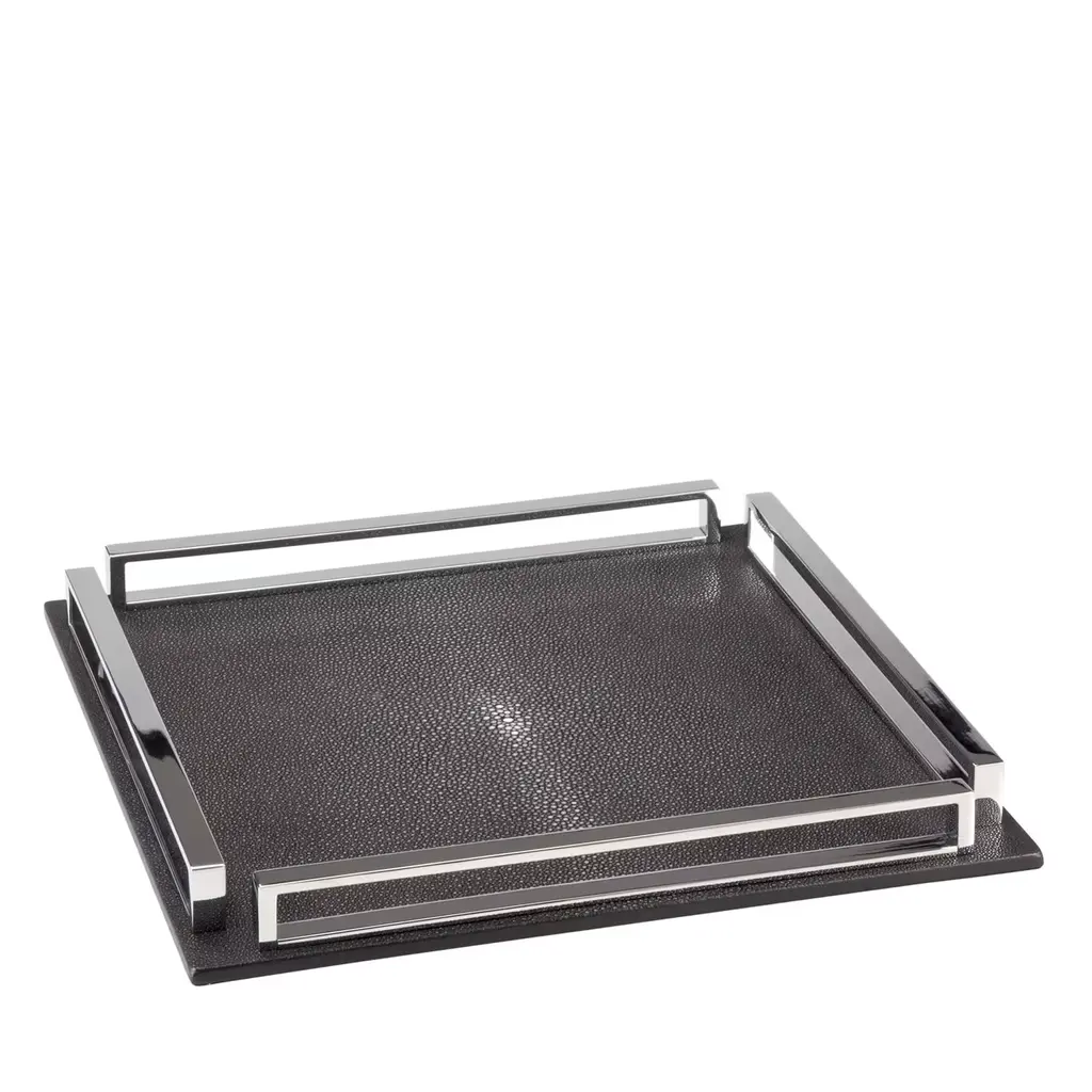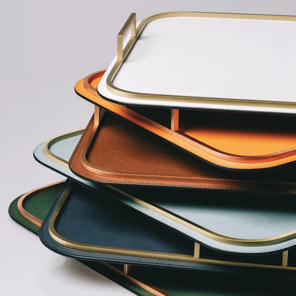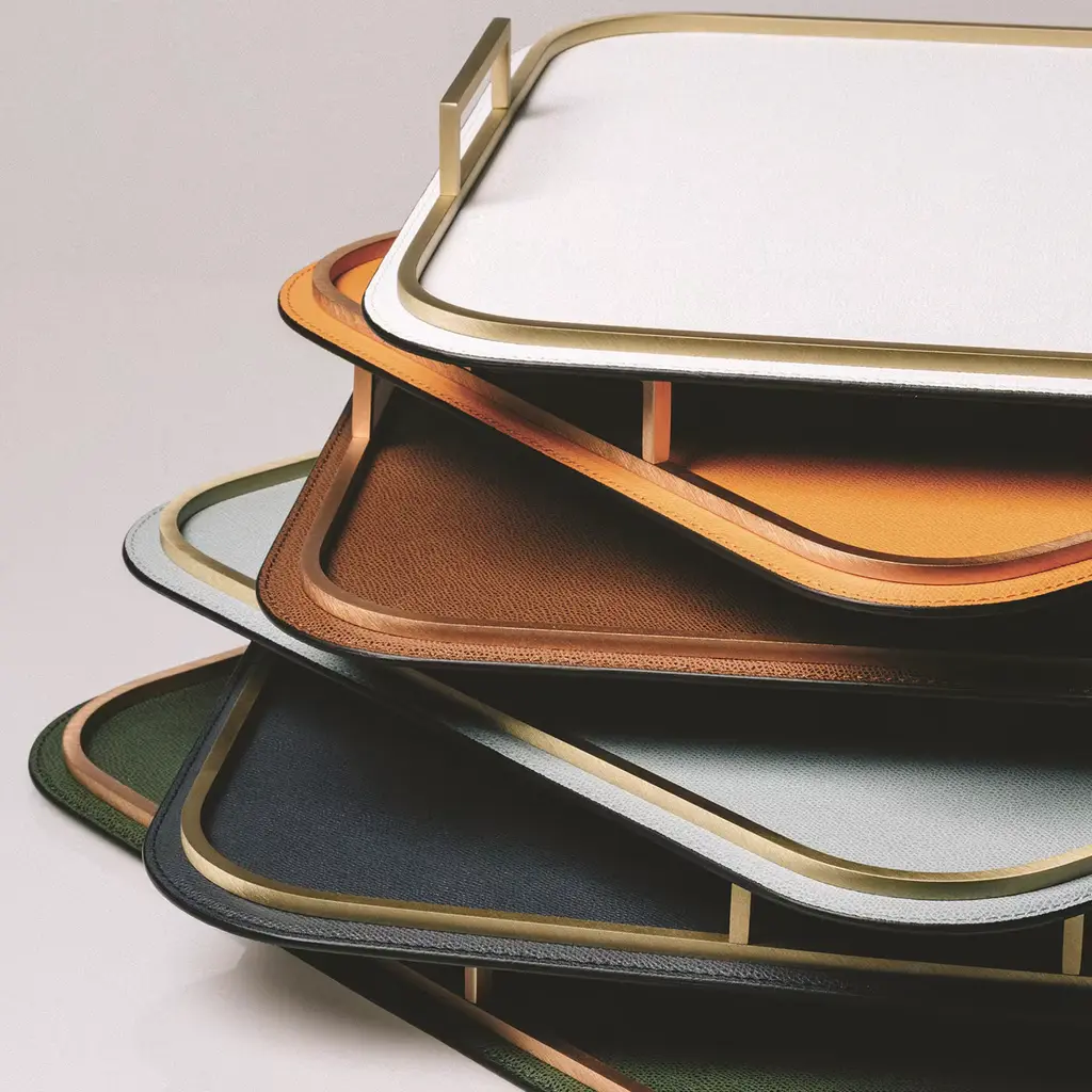 Part of the Bellini collection, this small rectangular tray has a charming allure thanks to its round corners, which strikingly contrasts with the straight angles of the two side handles. The structure is in metal with a brass finish, while the bottom is covered in leather dyed a bright shade of white. The color and type of leather can be changed, by choosing among the large selection in the brand's catalog, to create a truly unique and exquisite piece of functional decor. T