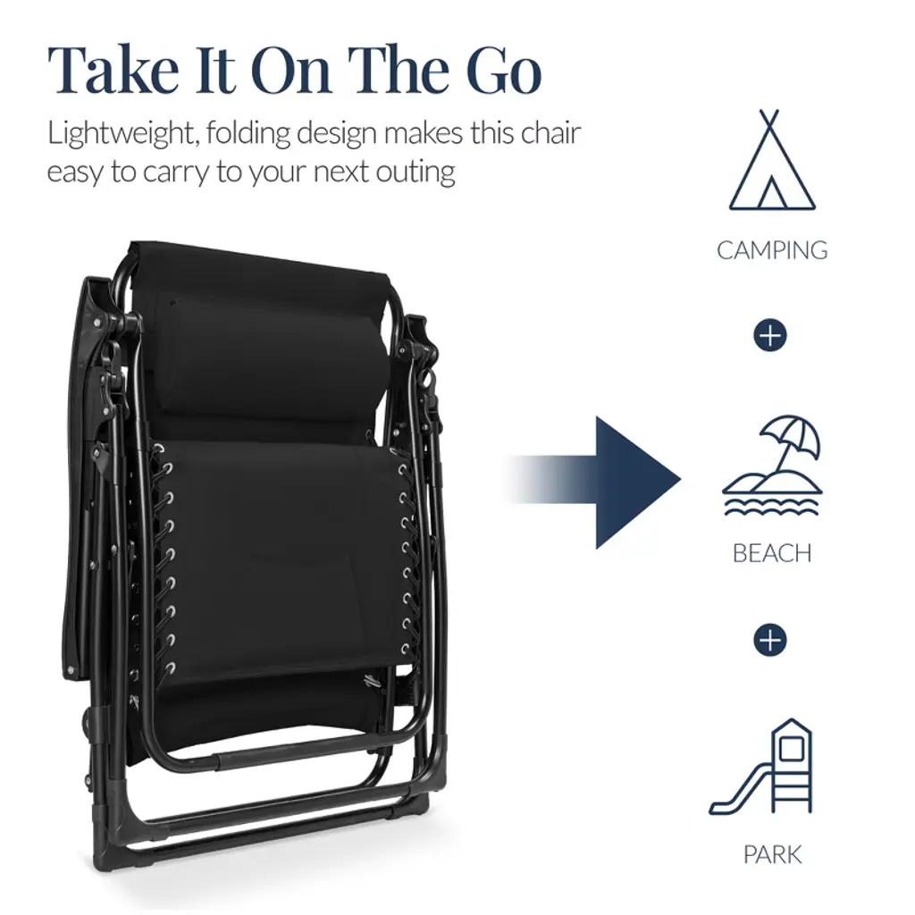 The ultimate seat is ready to take on all comers. An oversized steel frame features sturdy armrests for added support, while an extra-wide seat adds comfort and space for extended lounging. A combination of weather-resistant fabric, padded polyester, and a lightweight, folding design make this chair an easy addition to your next outing whether that's to the park, the beach, or a camping trip. Keep your favorite drinks and media devices close at hand for uninterrupted relaxation with a convenient tablet rest, 2 cup holders, and a phone mount. Most importantly, this chair is built with an adjustable lock system to freely move the back and footrests into the perfect angle (a full 160-degrees)
