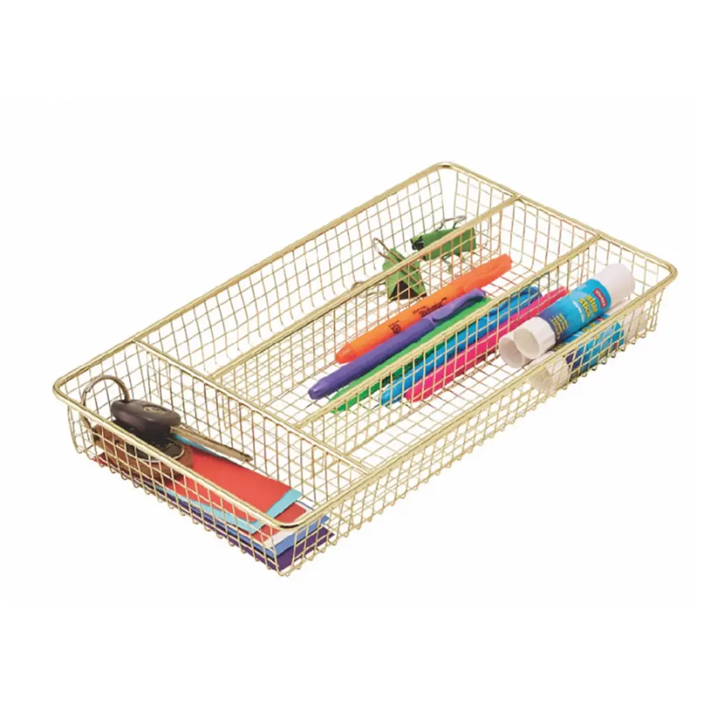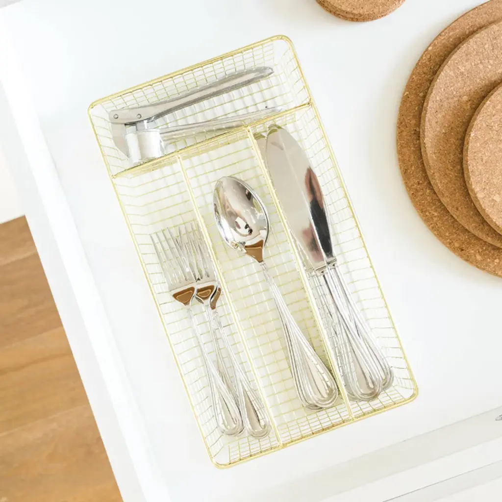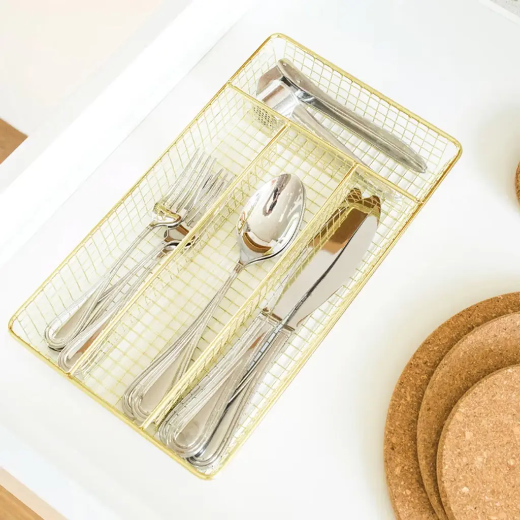 Keep your kitchen drawers organized with the Better Houseware Brass Cutlery Tray. With 4 compartments, you can keep all your utensils in order and stay stylish. Measuring 12.25 in. x 7 in. x 1.62 in., the tray fits most kitchen drawers. Even better, the tray can be used for more than just kitchen utensils. Organize your office, craft room, or any other space you need._