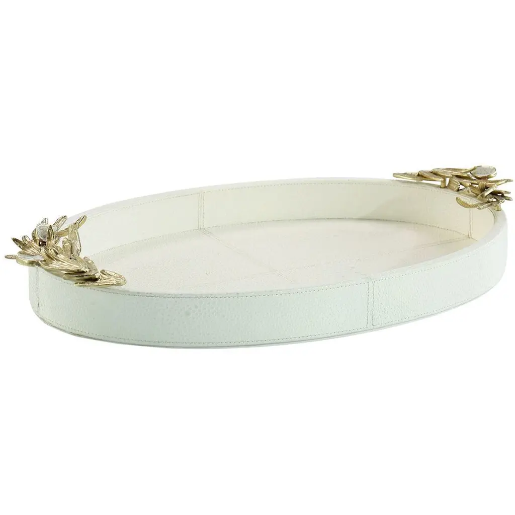 The Bianca Tray is a gorgeous home accessory that elevates chic neutral tones through opulent accents. Wrapped in textural white leather, the tray displays an oval shape with Polished Brass leaves adorning each end. The leaves are punctuated with enamel clusters, matching the trays white tone to complete the look.