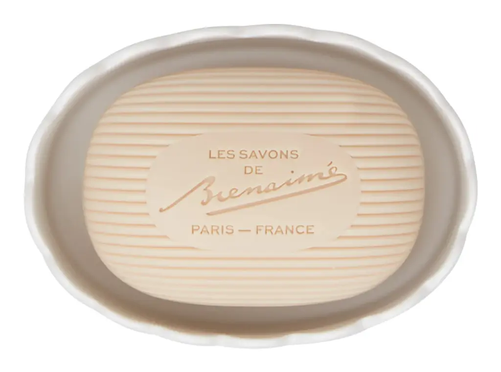 How charming is our Bienaimé Soap Tray. Handcrafted in Portugal, this chic ceramic dish pairs a class footed silhouette with delicate scalloped edges and a creamy white glaze. Designed by the illustrious French beauty brand for which its named, it would be perfect perched sinkside and paired with our Bienaimé Solid Soap or any other bar you like. Outside of the powder room, we also love it by the kitchen sink for an elegant spot to keep your dish sponge or on the vanity as a catchall for jewelry and other tiny trinkets. •4.75"W x 3.25"D x 2.5"H •ceramic •cream glaze •handmade in portugal