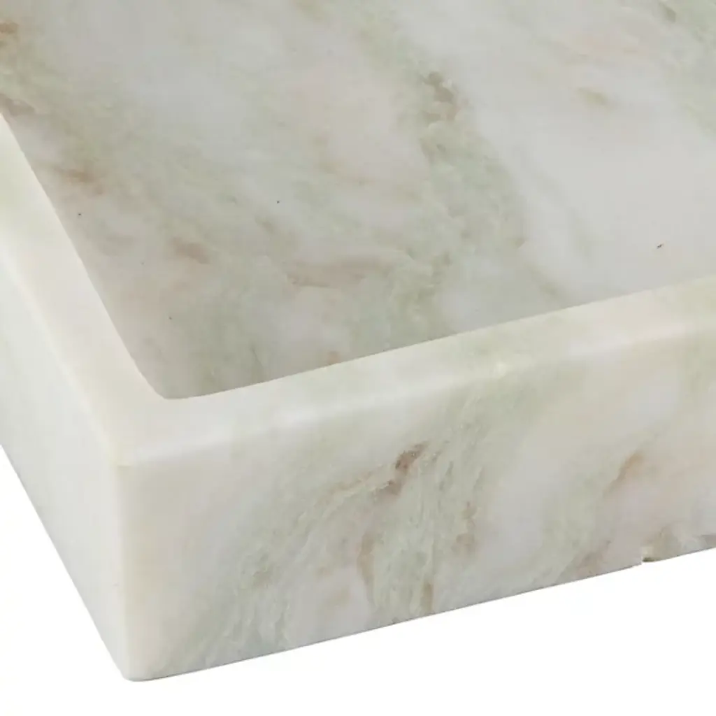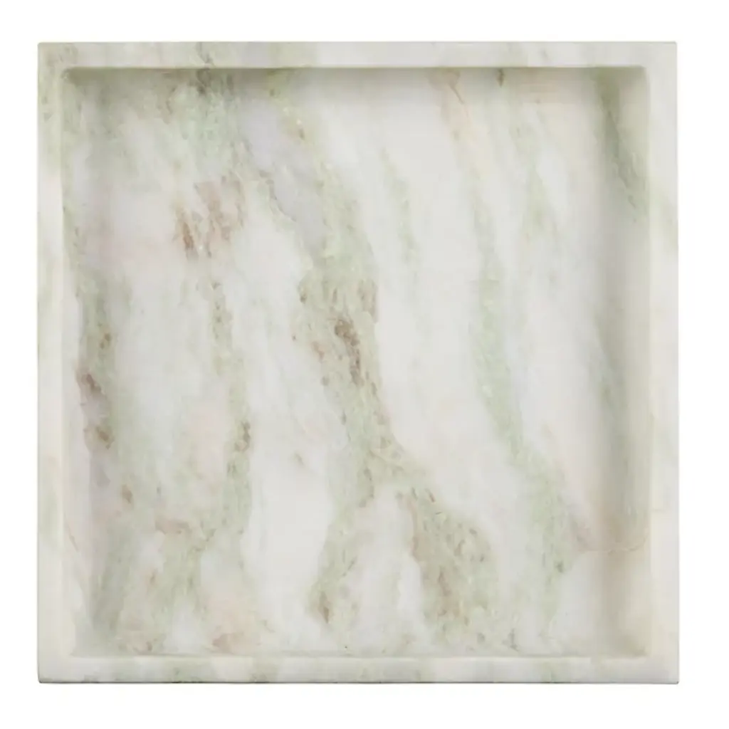 The Bilbao Square Tray from Currey & Company displays the same exquisite Aravali onyx found in the round version, with pastel pink and green veining that flows naturally across the rectangular form. Like its circular counterpart, this tray features a tapered base that connects to a narrow plinth, giving the piece architectural interest. The natural stone ensures that each tray has unique veining patterns, making it a one-of-a-kind decorative and functional piece.