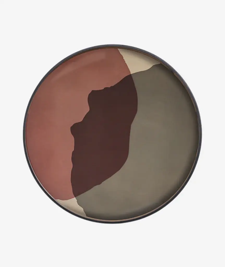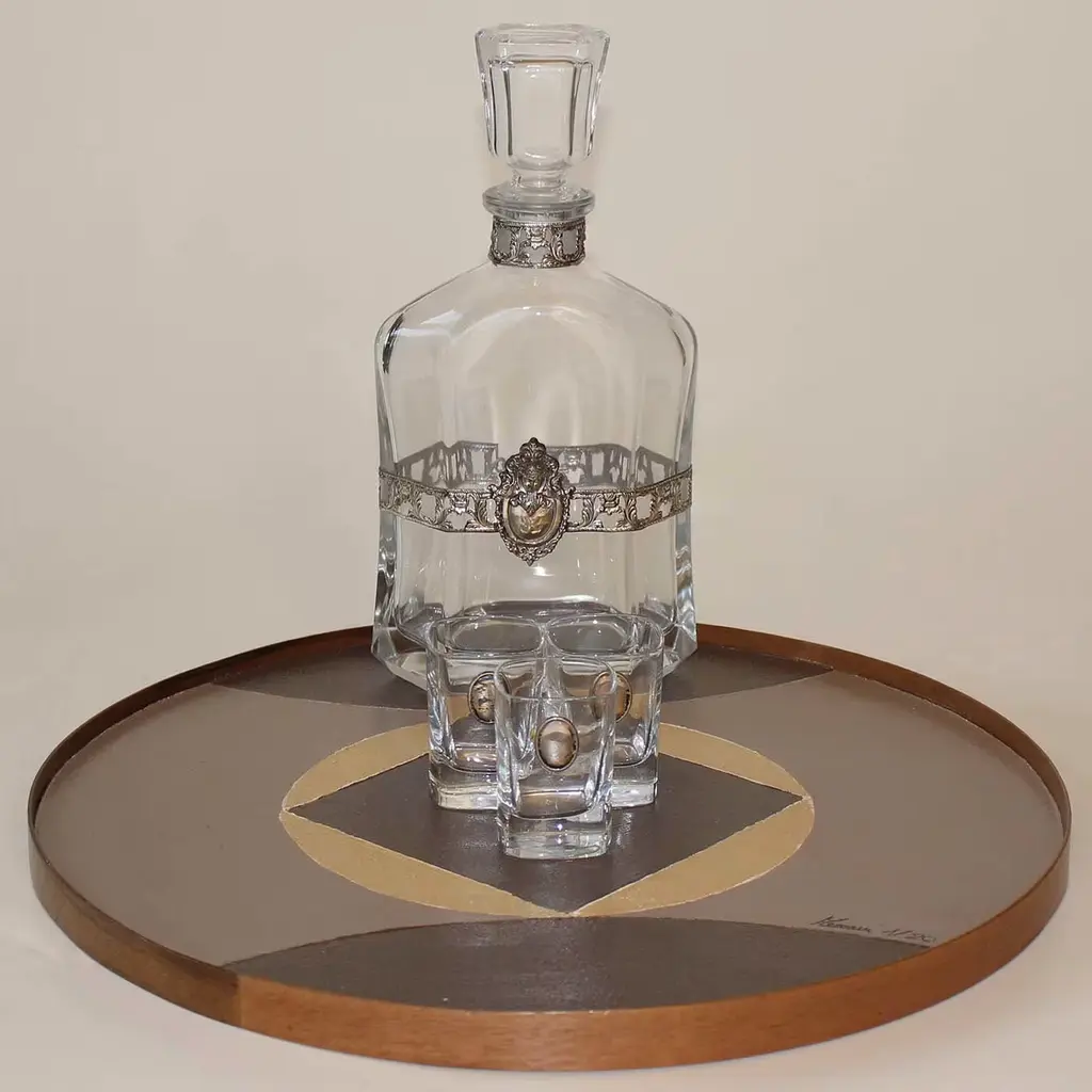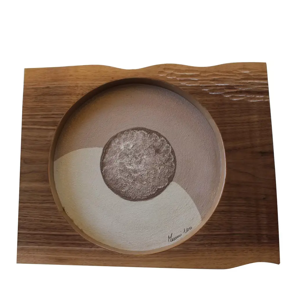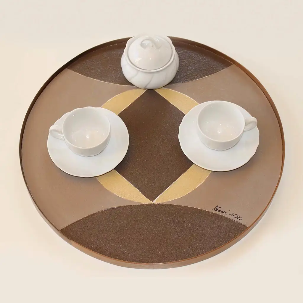 A true piece of art, this stunning round tray is handcrafted of walnut and decorated by hand using nuances of brown and coated with a protective water-based, non-toxic finish to prevent scratches. The design features a taupe background with a brown diamond shape on a cream-colored circle surrounded by a brown demi-lune on top and bottom. A sophisticated addition in any home, this captivating tray is part of a limited edition of 20 signed pieces that will stand out in a modern-styled kitchen, living room, or dining room.