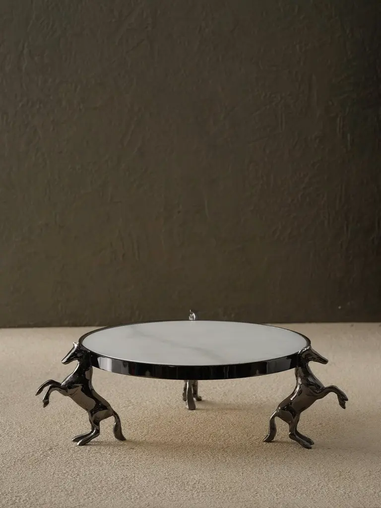 Bold, sculptural, and irresistibly distinctive — the Black Horse-Leg Footed White Marble Serving Tray is a true statement piece. This circular serving tray features a polished white marble surface framed in sleek black metal, elevated by three dynamic horse-leg figures in mid-rear, offering a dramatic twist on classical elegance.Ideal for serving desserts, hors d’oeuvres, or as a unique centerpiece, this tray exudes power and grace. A perfect blend of artistic expression and modern luxury, it’s designed to turn heads whether used functionally or as décor.