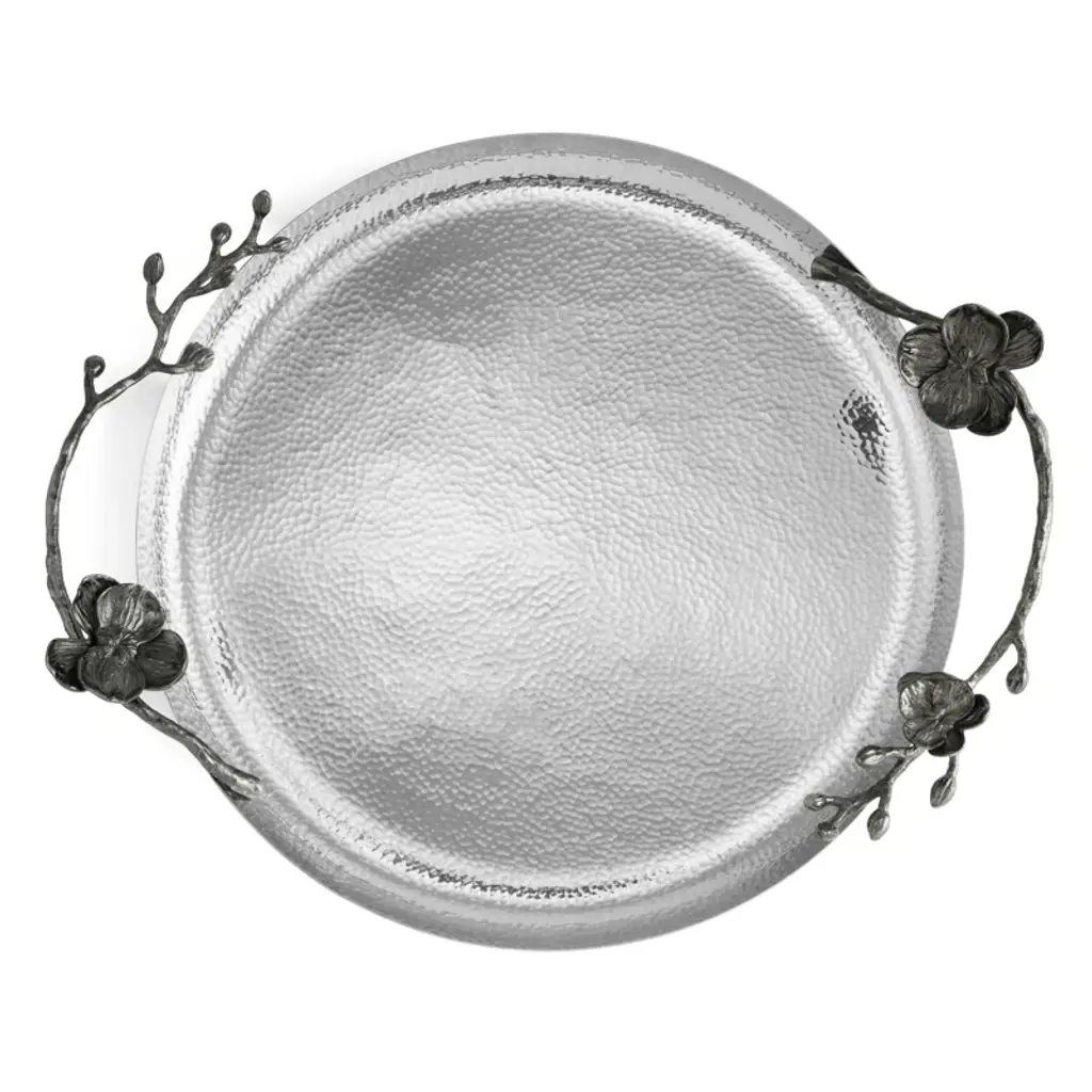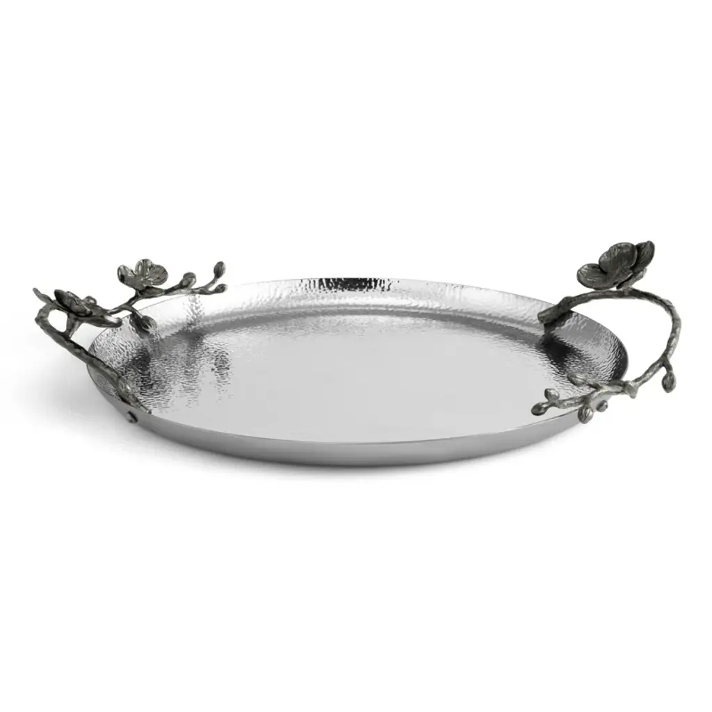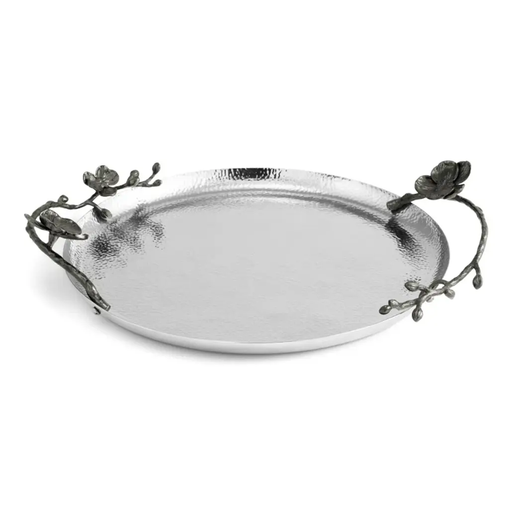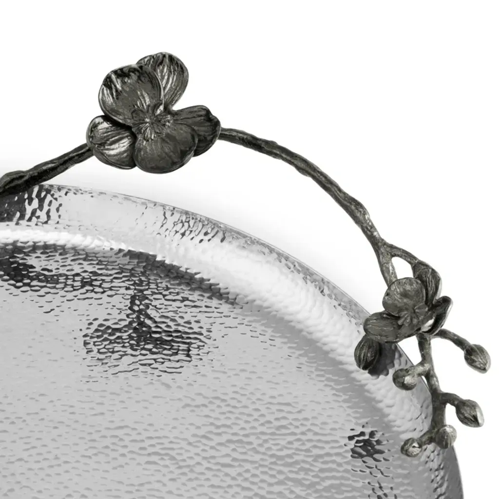 Footed clear glass tray with pewter floral patterned handles, inspired by the beautiful Rugosa Rose. Hand-set clear European crystals. Hand-wash only. Tarnish resistant. Signature luxury gift box included.