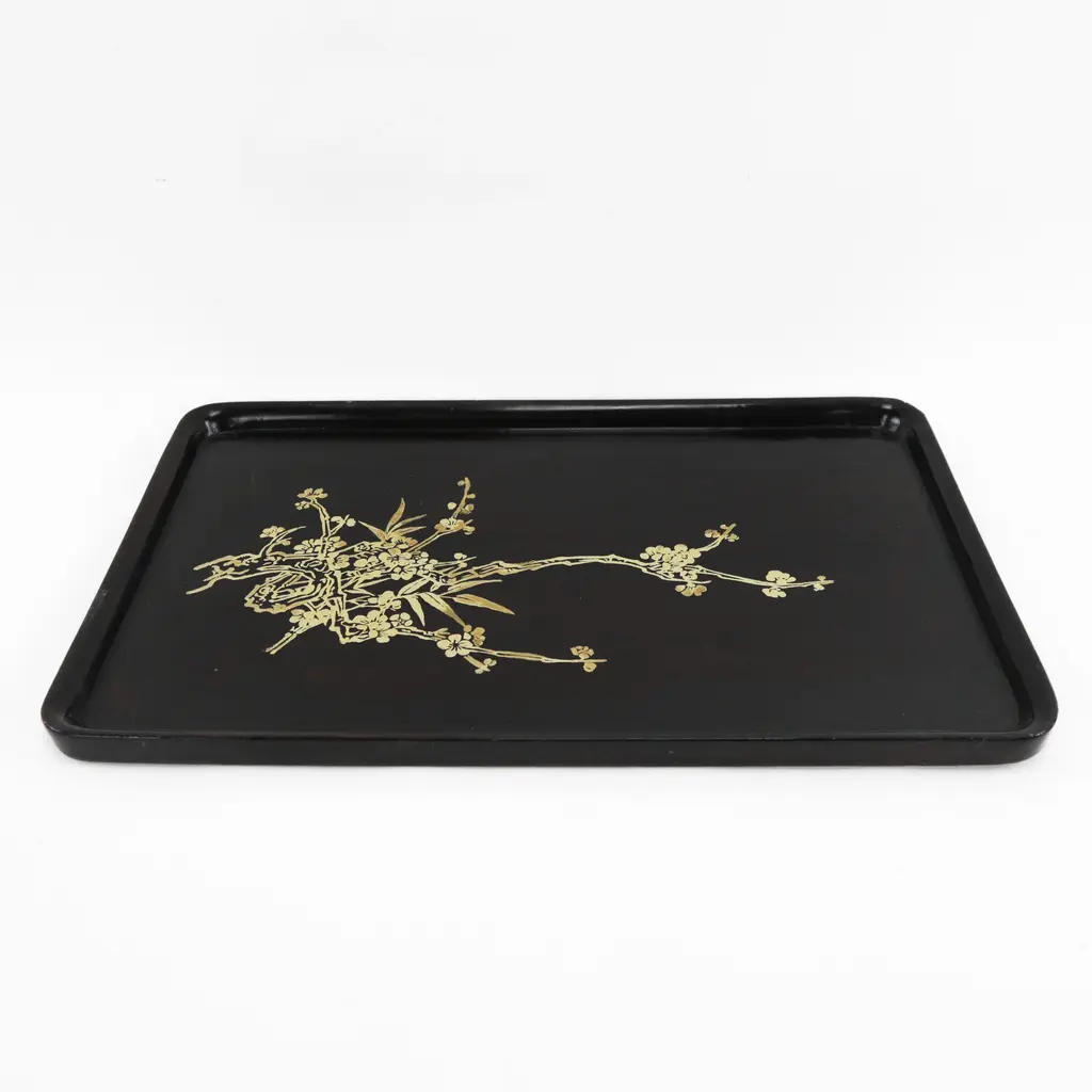Black Rectangle Lacquer Tray With Gold Floral Plum Blossom Design