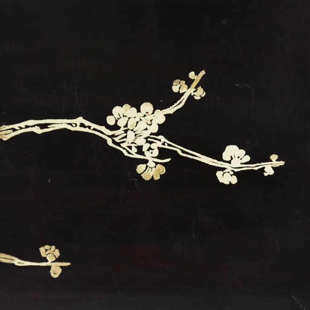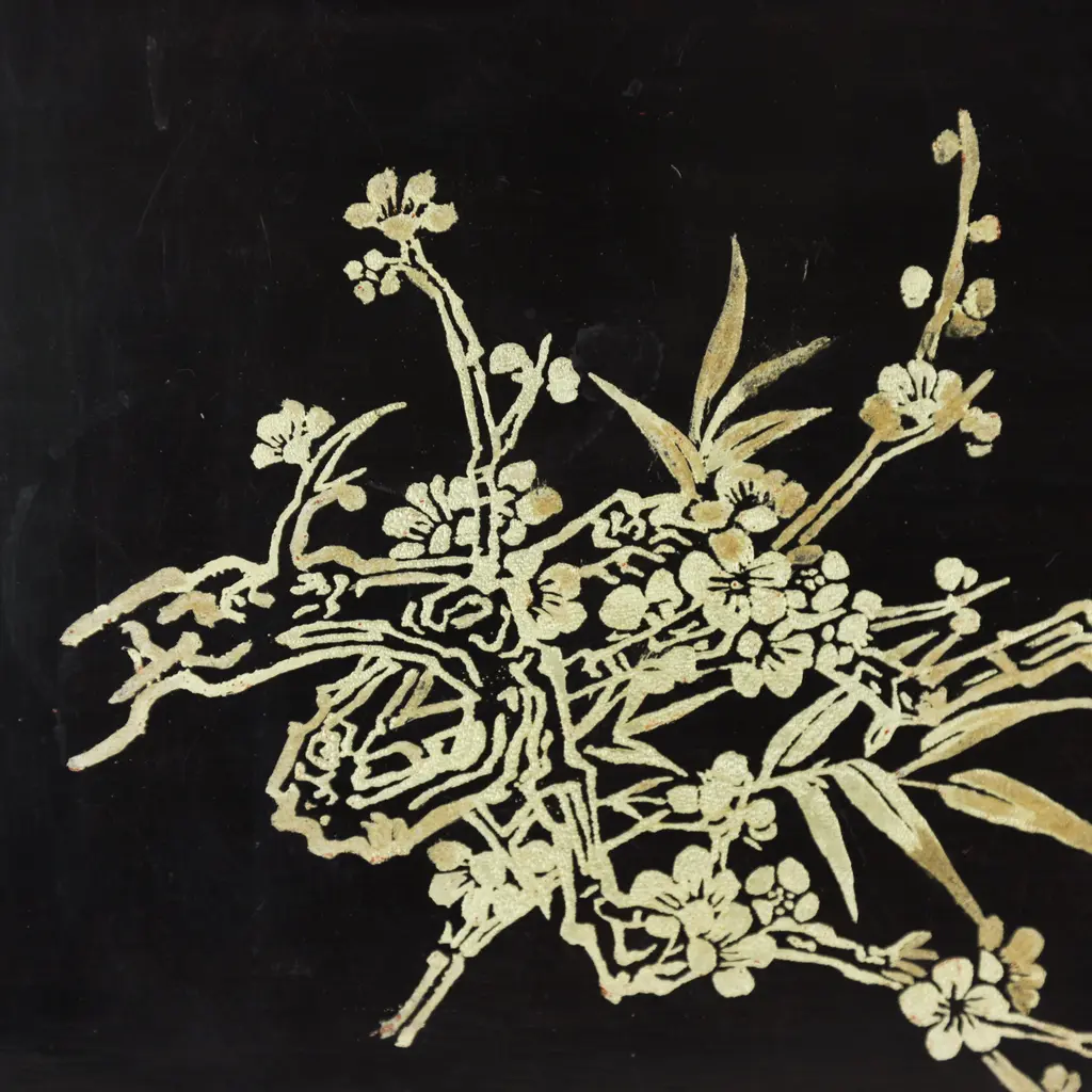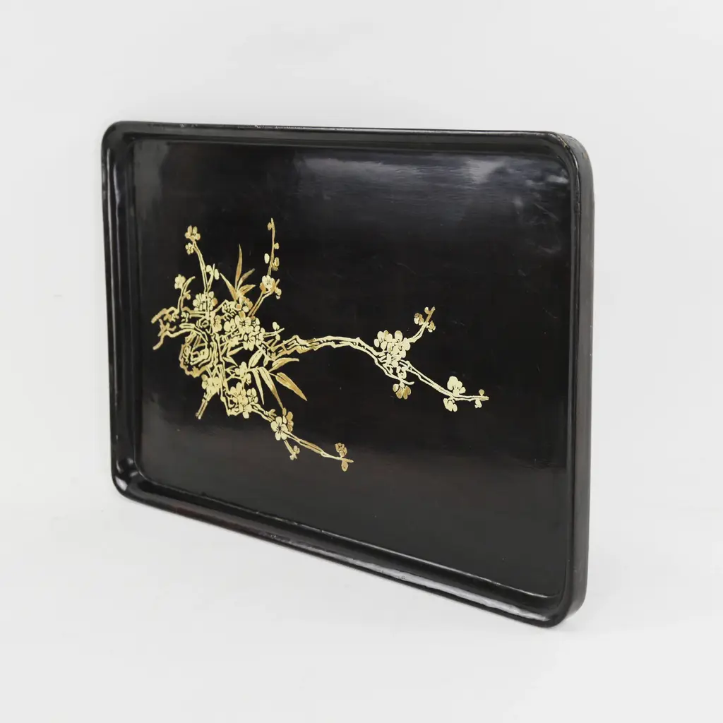 This vintage lacquer tray features a striking black finish adorned with an elegant gold plum blossom and bamboo branch motif. The finely detailed floral design is rendered in traditional maki-e style, showcasing delicate craftsmanship and timeless beauty. With gently curved corners and a smooth, high-gloss surface, this tray serves as both a functional piece and a refined decorative accent.