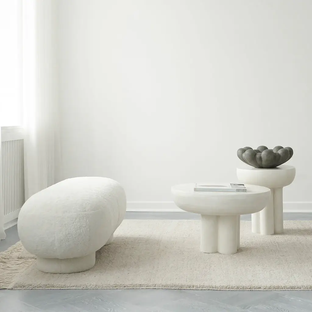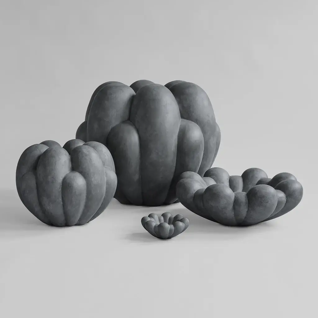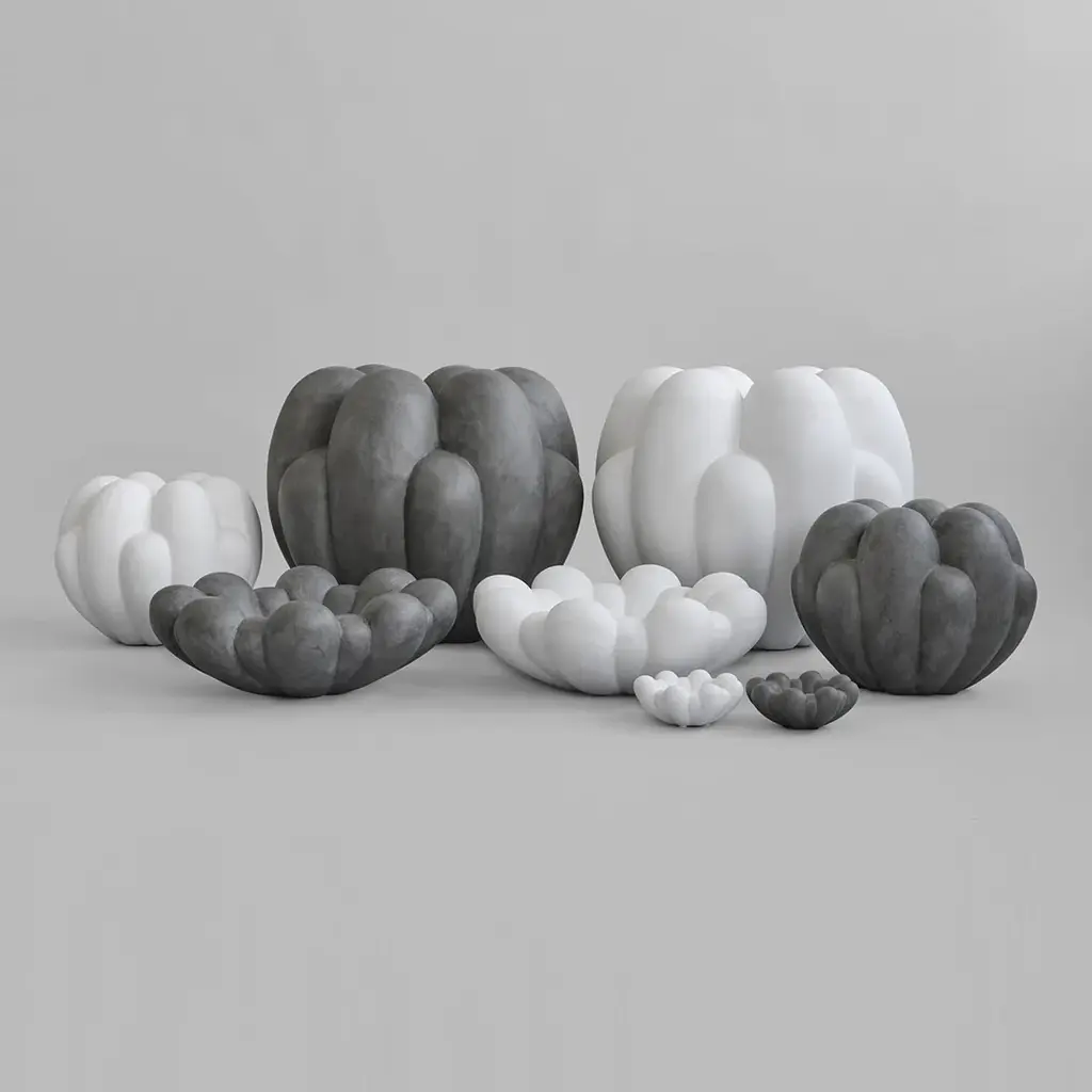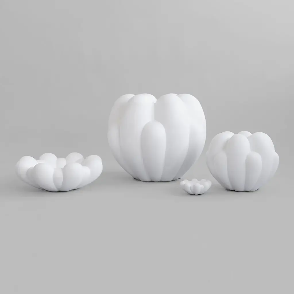 Inspired by floral shapes, Bloom emphasizes soft and organic shapes into a collection of sculptural ceramic vases and bowls. Elegantly sculpted, each Bloom ceramic is characterized by several flower leaves fading into each other, reminiscing the different stages of a flower from closed to open. Bloom is an interpretation of 70s floral inspired design. But with a more raw and clean expression. The smoothly curved surface is contrasted by a strong underlying geometry and is enriched by a beautiful play of shadows around the depths of the surface. Due to its expressive design, the Bloom vases changes experience throughout the day, according to the position of light and shadows. Bloom comes in both vases and bowls and is made from ceramic or fiber concrete. The surface is hand glazed in order to achieve the unique surface texture. The colours may vary slightly, due to that it is a handmade product. The vase is not 100% waterproof, therefore a bag for fresh flowers is included. Designed by Kristian Sofus Hansen & Tommy Hyldahl.