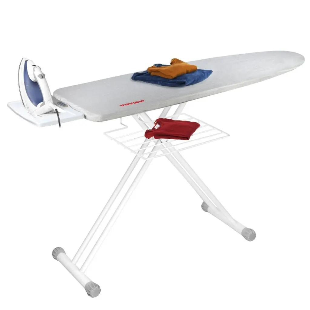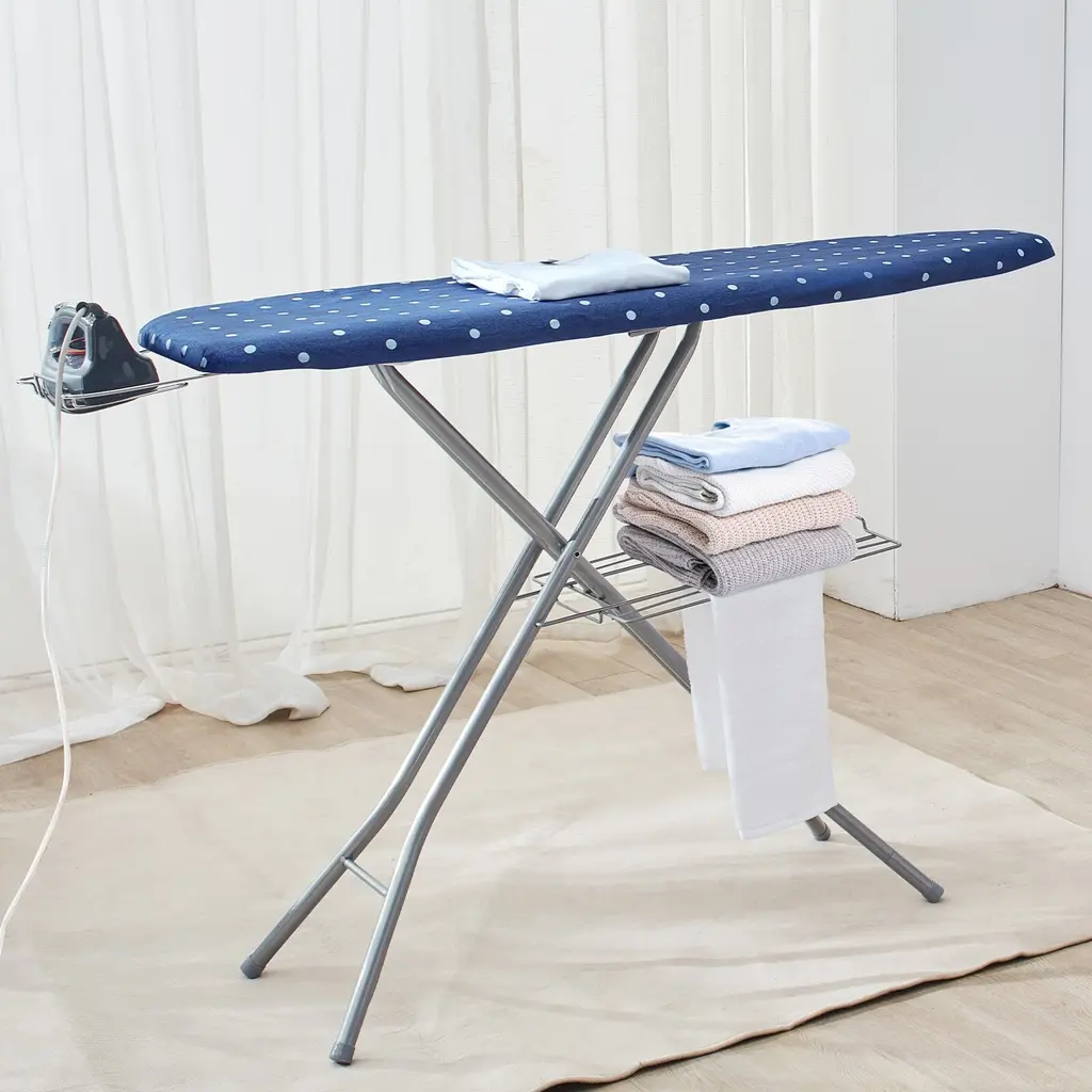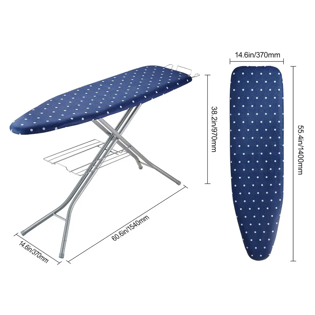 Specifications:Key Features:Heat-Resistant Cover: Our full size ironing board comes with a heat-resistant silver-plated cover for safer and resist scorching. This newly developed fabric adopts silver-plated process, allow a hot iron to sit on the surface without any damage or scorching, making your ironing process safer. In addition to the heat-resistant cover, we also provide you with a 100% cotton cover for replacement and washing.Thickened 4 Layers: The ironing board boasts a four-layer design, it includes a removable cover, a 7mm thickened sponge padding layer, a 7mm thickened needle cotton layer, and a heat-resistant breathable panel. Our needle cotton and sponge padding layer is 40% thicker than others, ensuring effective ironing and mark prevention.Optimized Storage Options: Iron board has both an unfolding storage tray at the bottom for stacking finished clothing to allow maximum space on the board. Iron rest zone also for hanging up slacks, suit jackets, or tops you don’t want to wrinkle.10 Adjustable Heights: Our ironing table is easily adjustable to the height that users find most comfortable. It provides 10 height levels ranging from 25.2 to 38.2 inches. You can always find the perfect height to iron your clothes with utmost comfort.Full Size & Space-Saving: This Ironing board’s ironing surface measures 55.4” ×14.6”, providing ample space for regular ironing, quilting, knitting, and even ironing tablecloths. The iron board can be conveniently folded for effortless storage, whether it's in the closet, behind a door, or in the laundry room, requiring minimal space.