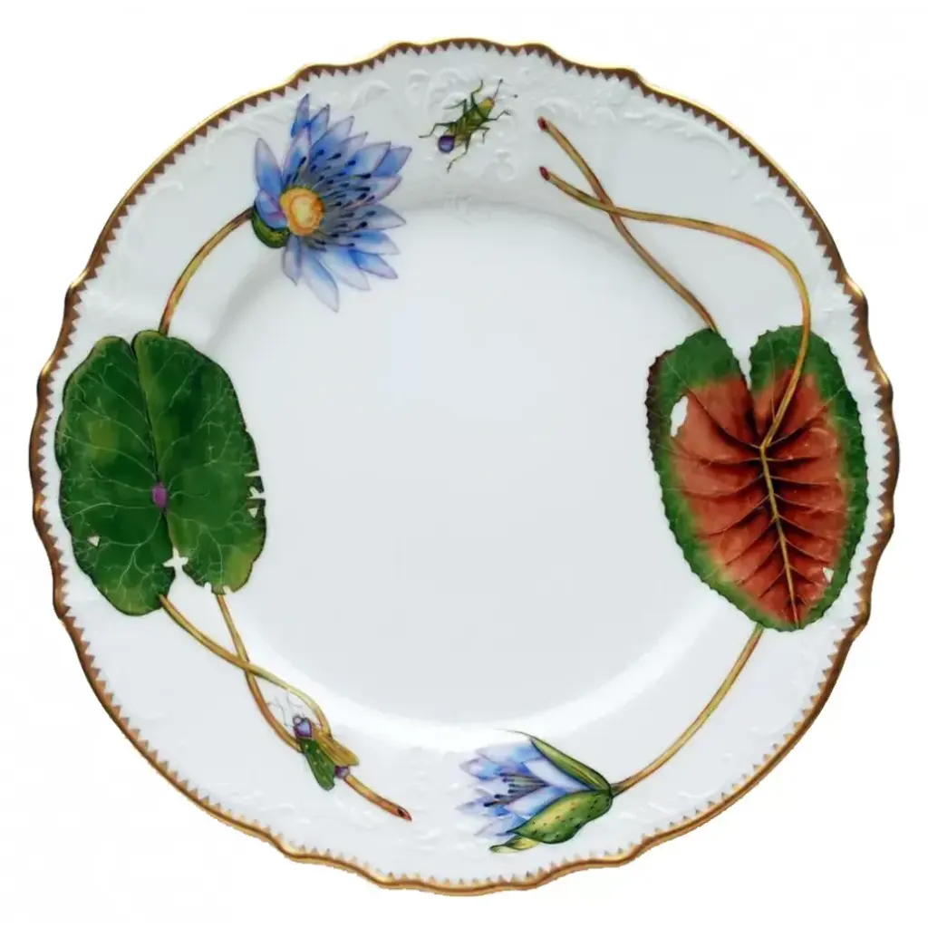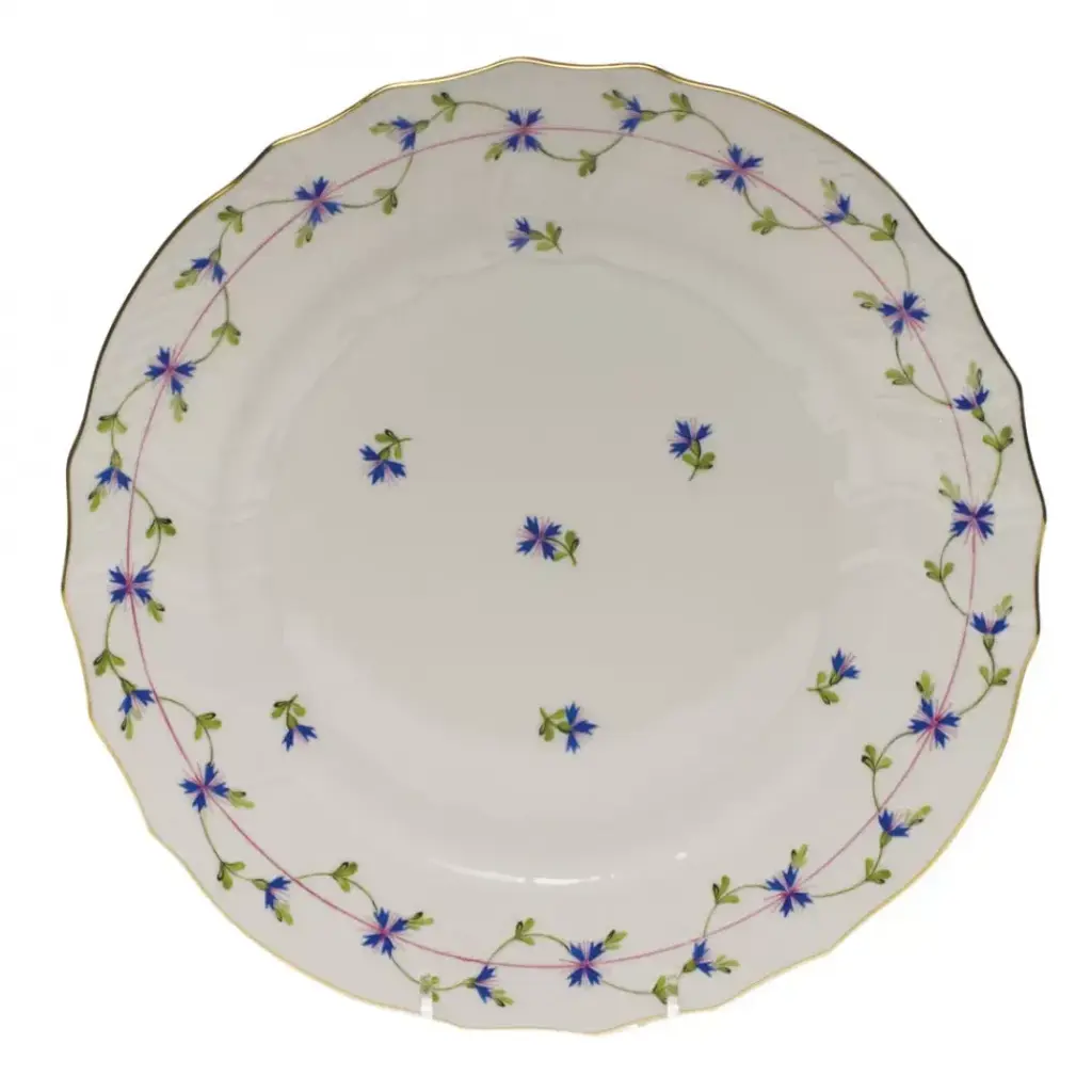 This design of a garland of bright blue cornflowers was introduced in 1890 by Jeno Farkashazy, grandson of the founder of Herend. The apparent French influence reflects the country where young Farkashazy was educated. Hand painted in Hungary. Now the biggest porcelain manufactory in Europe, Herend was founded in 1826 to produce earthenware in the small Hungarian village for which it was named. At the time, Hungary was flooded with low-cost pottery, but in 1839, Mor Fischer became the Manufactory’s new owner and he decided to focus on producing dinnerware replacement pieces for Europe’s royal families to complement their valuable porcelain patterns from Germany and the Far East. As his client base grew, Fischer commissioned his artists to begin designing dinnerware patterns of their own. Queen Victoria’s 1851 purchase of a large set for Windsor Castle was a milestone, setting the stage for aristocrats throughout Europe to clamor for Herend in their estates. In the 1850s, Herend added meticulously-crafted figurines to its creations. Herend’s trademark fishnet pattern, which is widely recognized and prized as Herend’s signature design, started in 1858 when an artist who was intrigued with a Chinese plate’s fish scale design painted it onto a rooster figurine to imitate feathers.