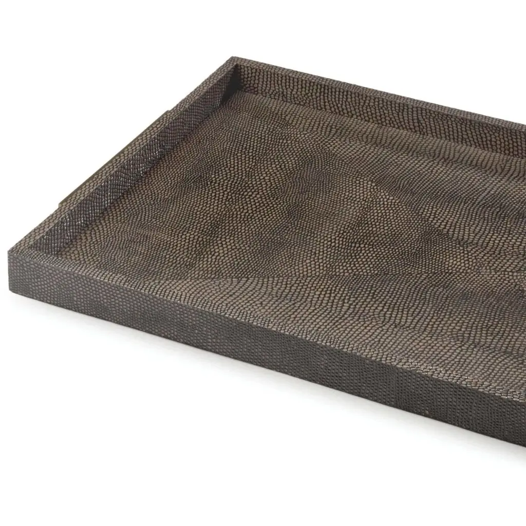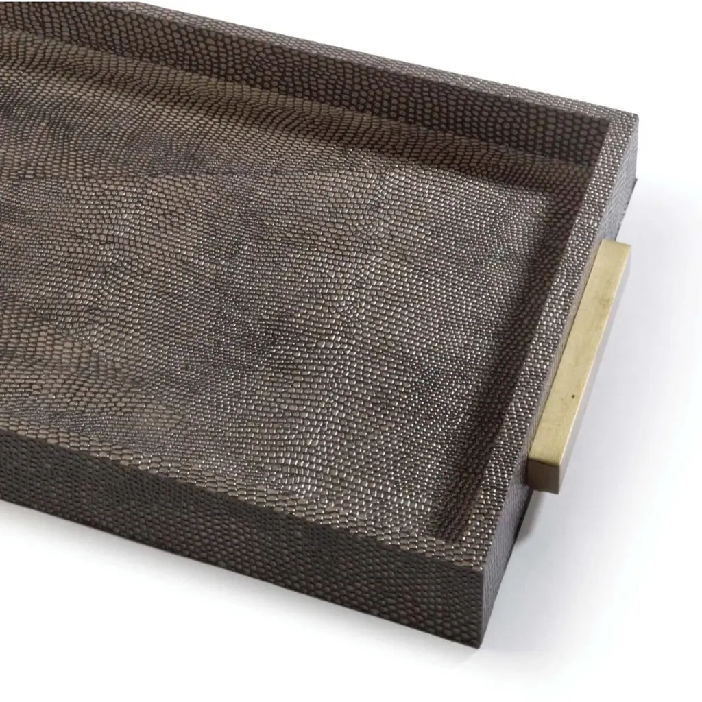 Wrapped in brown faux shagreen, this rectangular tray sports complementary natural brass finished handles. Perfect to display tabletop accessories in your living room or to organize your entryway.