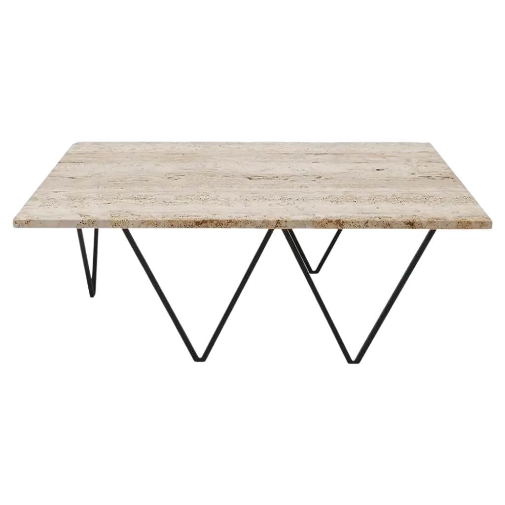 The Boyles Travertine Large Tray has a forged iron base in a black finish that holds a tray top made of solid, unpolished travertine. The personality of the surface stems from the fact that it is porous and has a variety of nooks and crannies in its pitting. The tray top is a challenge to make given the lip that rises above the edge of the frame. The Boyles Travertine pieces satisfy the desire for texture and natural materials in interiors.