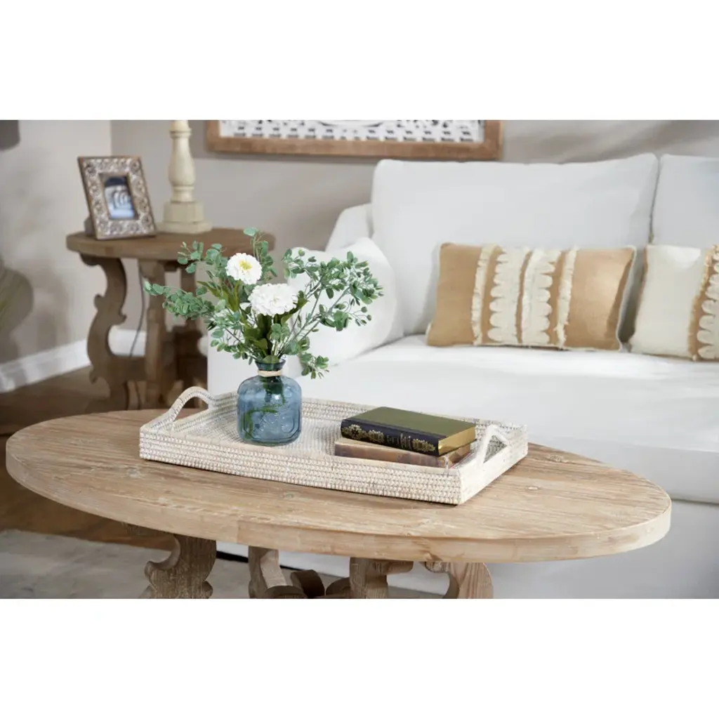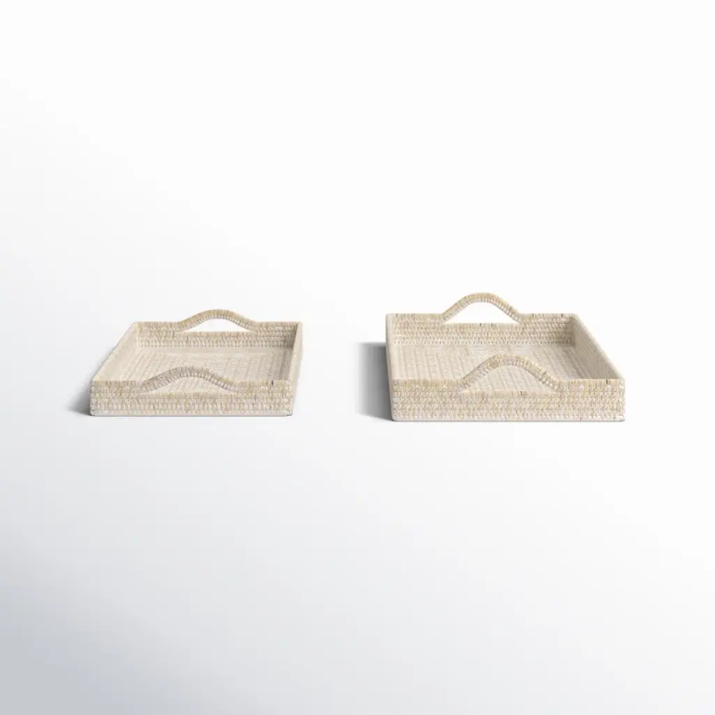 This 2-piece tray set adds a touch of boho charm to your décor, offering both style and function. Crafted from woven rattan in a warm, natural tone, the trays come in slightly different sizes for easy nesting. Each tray features convenient handles on both ends, perfect for serving light snacks or showcasing decorative items. Though not intended for heavy loads, these trays are a versatile addition to any home – and they make a thoughtful housewarming gift.