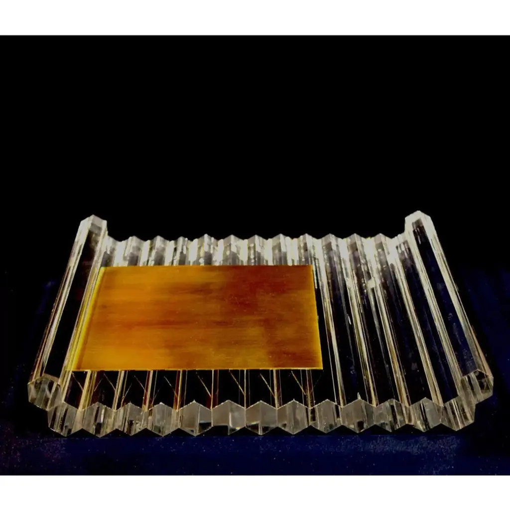 Brass Accented Crystal Prism Tray by DainteDimensions: D 26 x W 28 x H 4 cm.Materials: Crystal and brass.The decorative prism tray is designed to fascinate and delight. Creating beautiful displays of light and color, each exquisite piece is functional and aesthetically appealing. Simply adjust the position of the metal slide to create countless unimaginable refracations of light as art. Use it to hold fruits, cakes or whatever sparks your imagination.Founded in 2002, Dainte has steadily gained recognition for its new-wave designs and concept statements in lighting and office décor.Dainte’s core capability – transferring the power and design of crystal into uniquely-crafted lifestyle pieces – has placed the design company as one of the most prestigious brands in customized crystal innovations.Dainte debuted its innovative design offering at the ICFF Show at the Jacob K. Javits Convention Center in New York City in May 2019. The Dainte flagship line showcased the next step forward for luxury interior design, creating pieces that not only carried an identity but also told a story.The fashion-forward look and feel of Dainte’s innovations are rooted in the broad range of rich materials used. Each carefully-selected, one of a kind accessory contributes to each exceptional décor and inspired design. The finished product provides a luxury experience of high-caliber material expression.Dainte believes that each part should be contracted and selected as vital contributions to a compelling whole. One of the most essential components of Dainte designs is crystal. Crystals are known to have underlying powers, carrying a center energy capable of engaging the human senses. To elevate the interior design experience, Dainte has made crystal a central nuance of its design capabilities.Combining expertise in crystal with other complementary materials, Dainte has stepped forward to present the world with a completely redefined interior design experience when it comes to balancing the elegant powers that harmonize lifestyle.