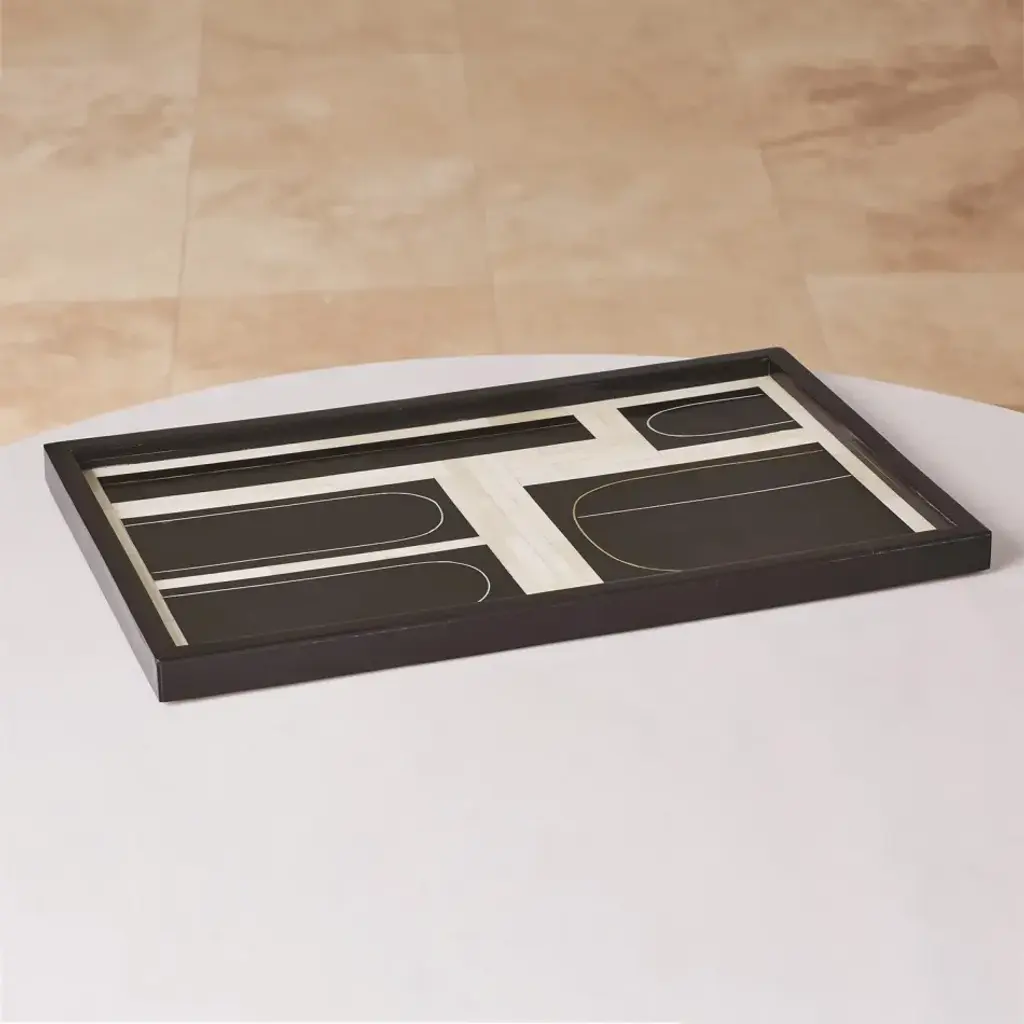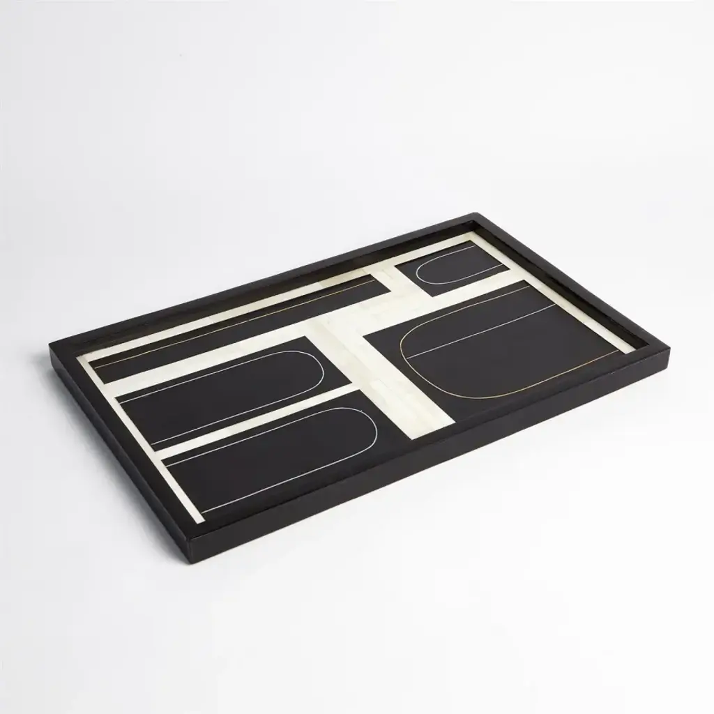 A resin and bone exterior features a brass filet loop that is inlaid. The substrate of MDF gives this tray strength and stability to hold up over time without warping or movement. From a fashion forward perspective, Global Views offers accessories, furniture, statement lighting, and an assortment of rugs and mirrors to add beauty and joy to your home.