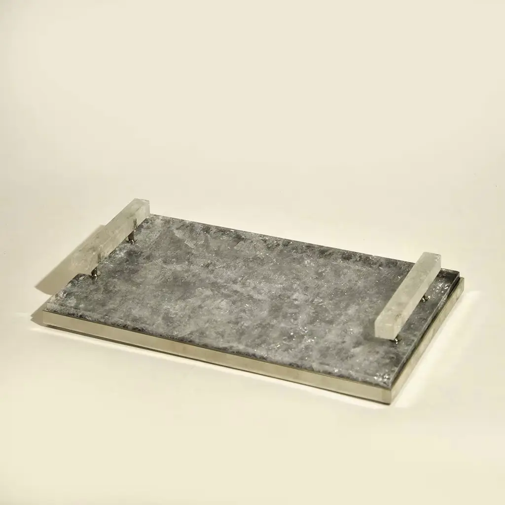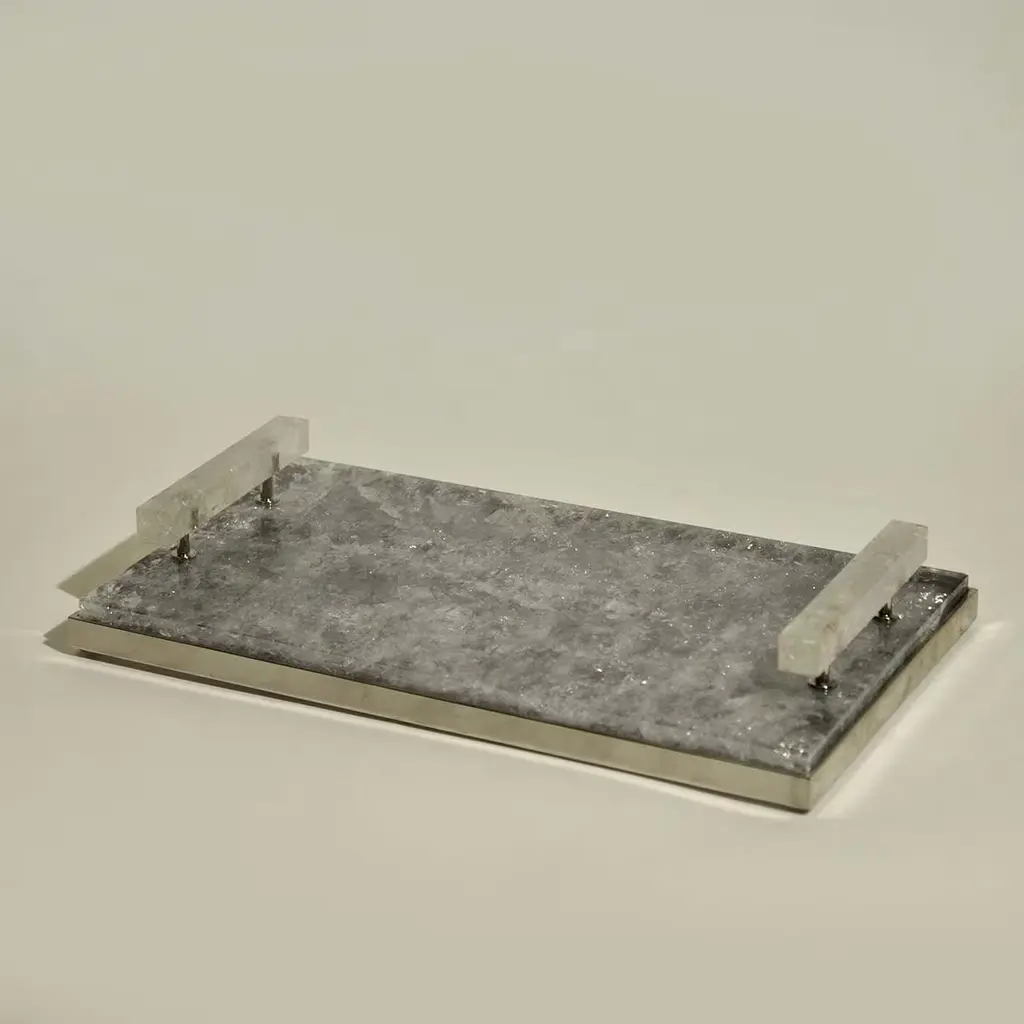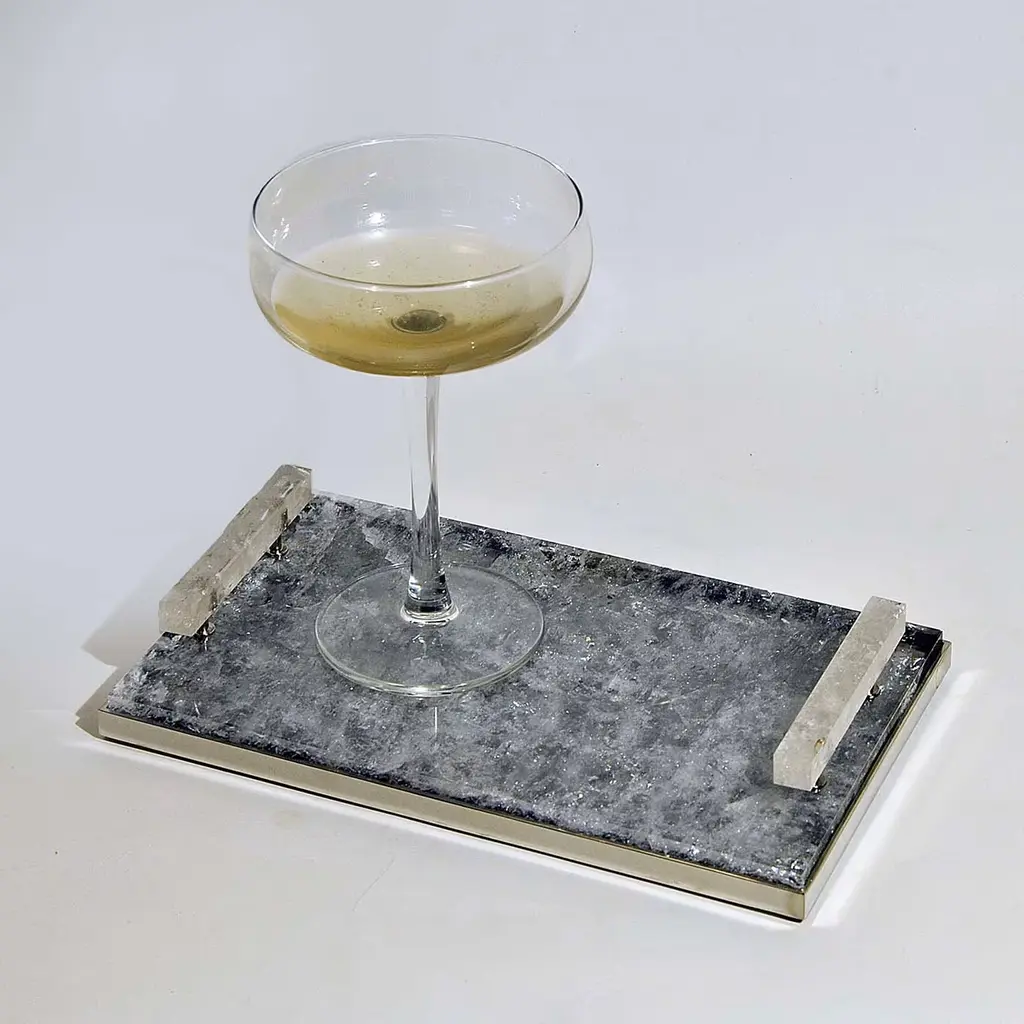 A classic silhouette with a modern twist, this rectangular tray is fashioned of bold black quartz and features exquisite hyaline quartz handles. A solid border in nickel-plated brass frames the crystal tray, this alluring juxtaposition of metallic and natural elements adds textural depth to the work. Elegantly chic, this timeless tray is a stunning surface for entertaining and fine dining.
