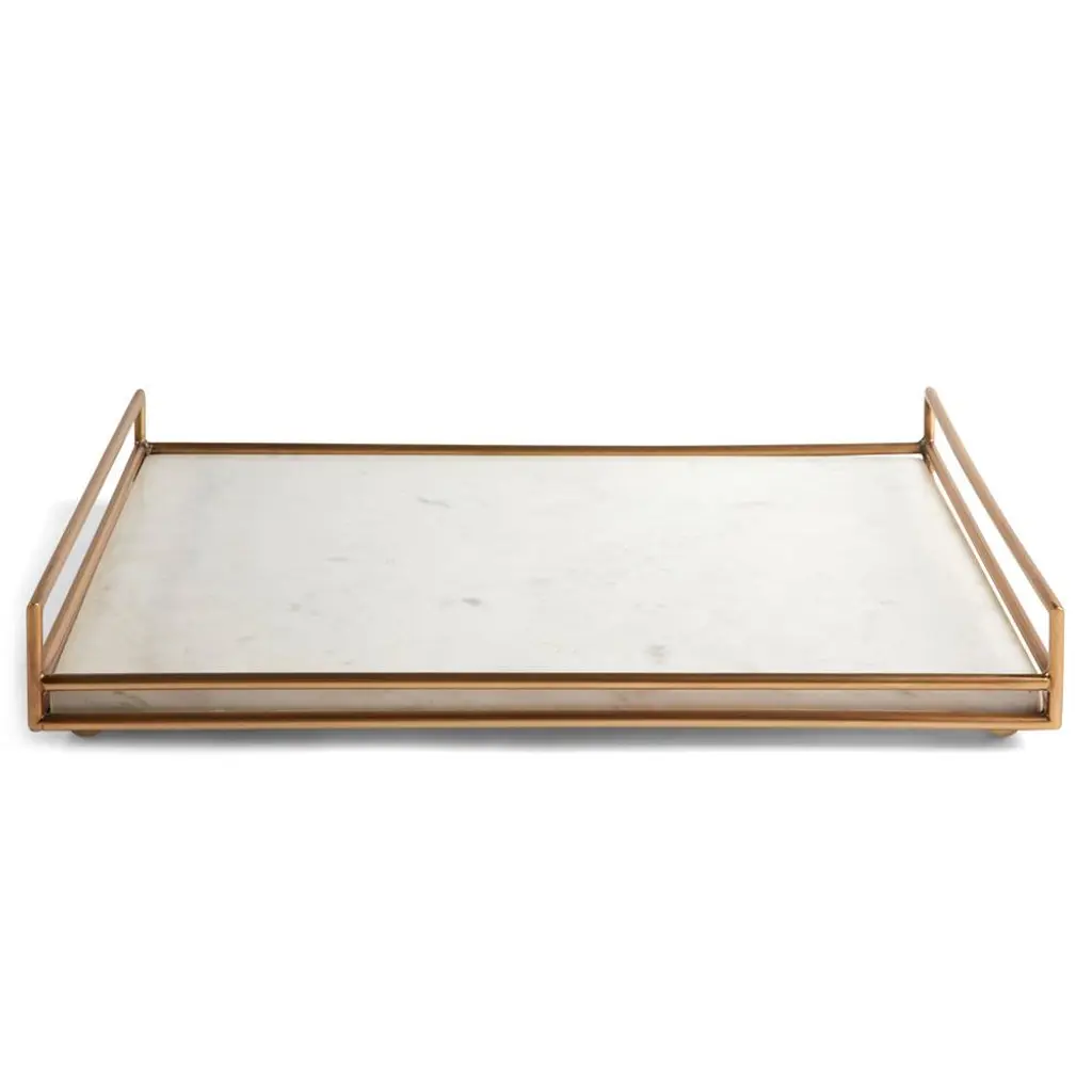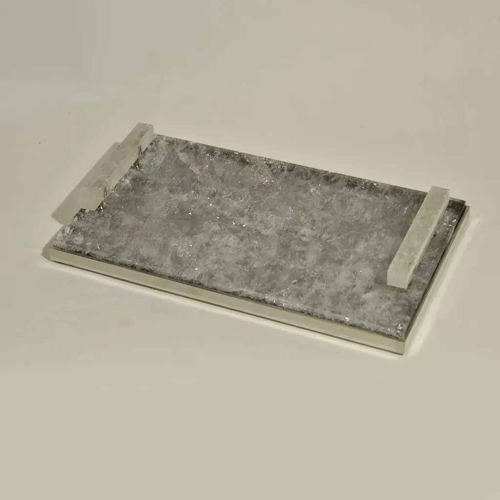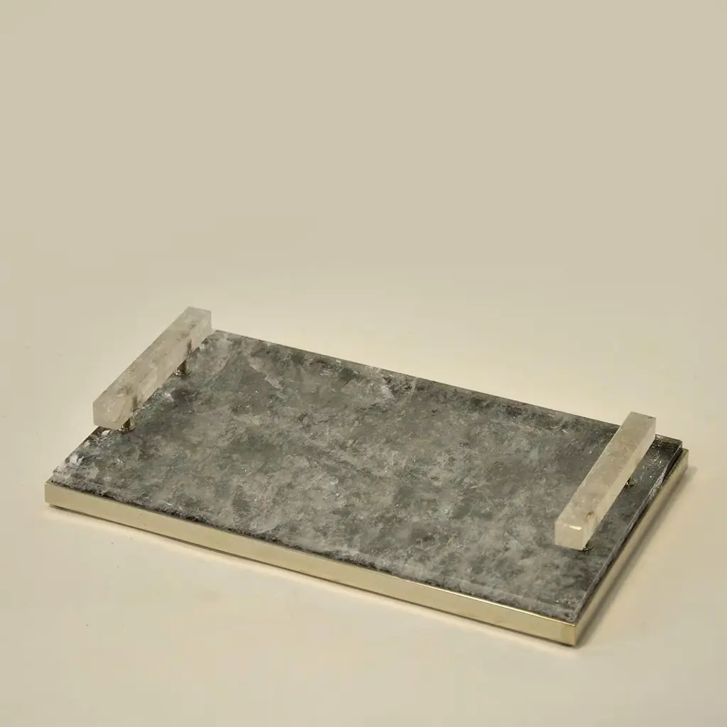 A classic silhouette with a modern twist, this rectangular tray is fashioned of bold black quartz and features exquisite hyaline quartz handles. A solid border in nickel-plated brass frames the crystal tray, this alluring juxtaposition of metallic and natural elements adds textural depth to the work. Elegantly chic, this timeless tray is a stunning surface for entertaining and fine dining.