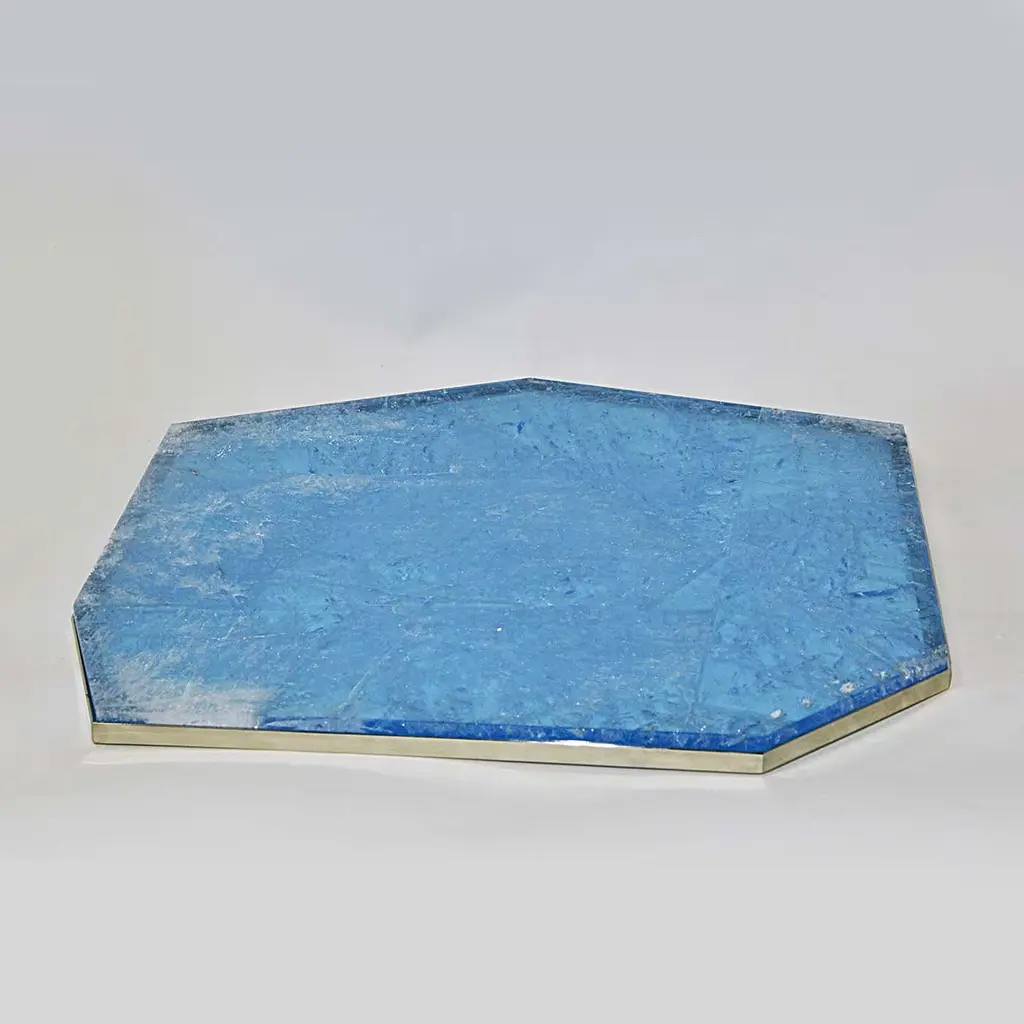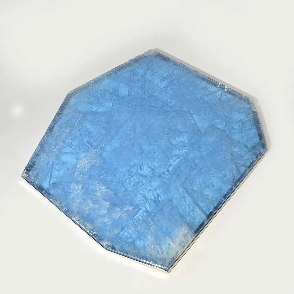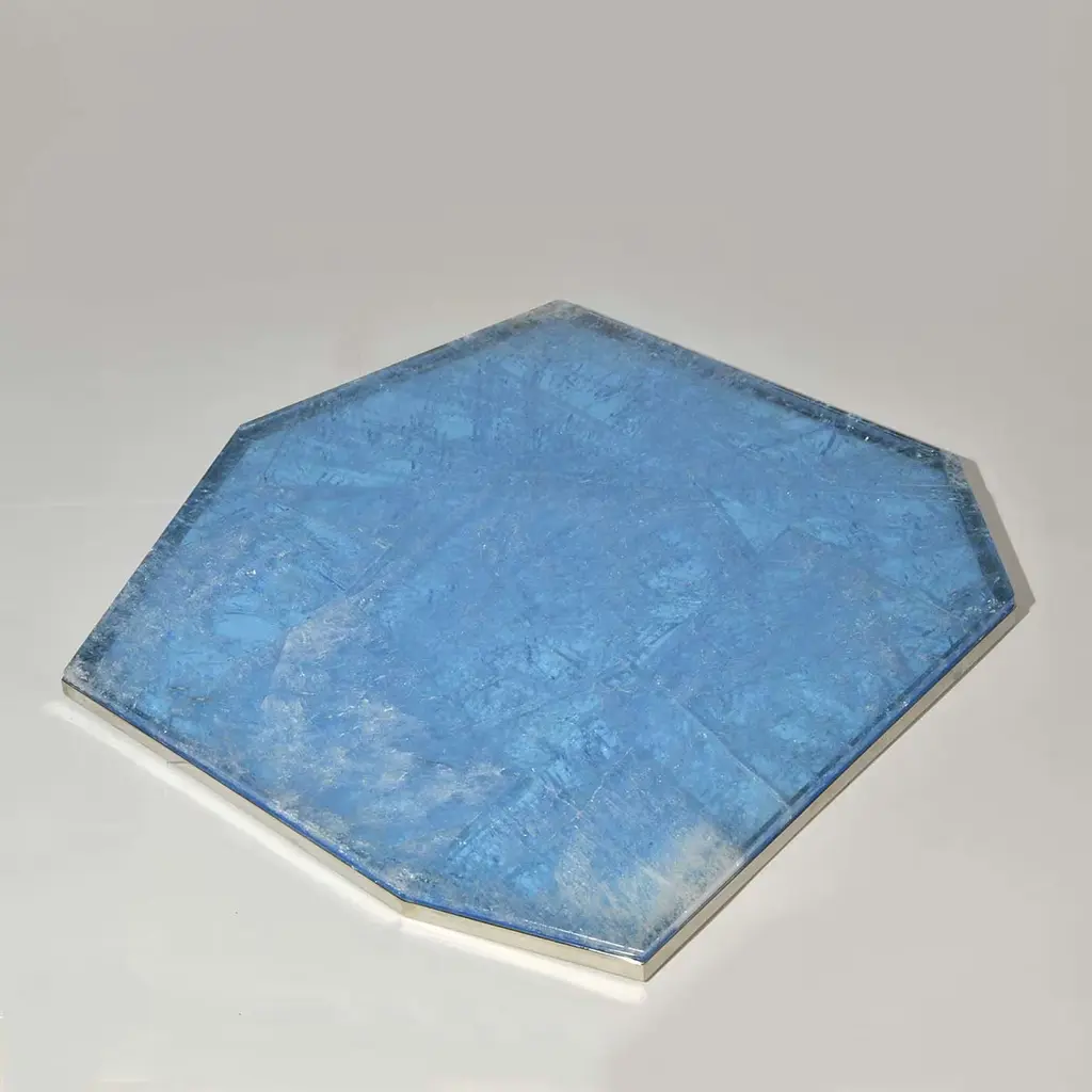 A dynamic and original composition, this geometric tray merges modern design aesthetic with limitless creativity. Crafted of rich light blue quartz, the distinctive, irregular silhouette is sleek and expressive. The sinuous white striations and blue flecks in the crystal elegantly complement the angular edges, a visually striking design detail. A subtle frame in nickel-plated brass supports the composition. A whimsical work of art, this will be a stunning centerpiece in an entryway or living room.