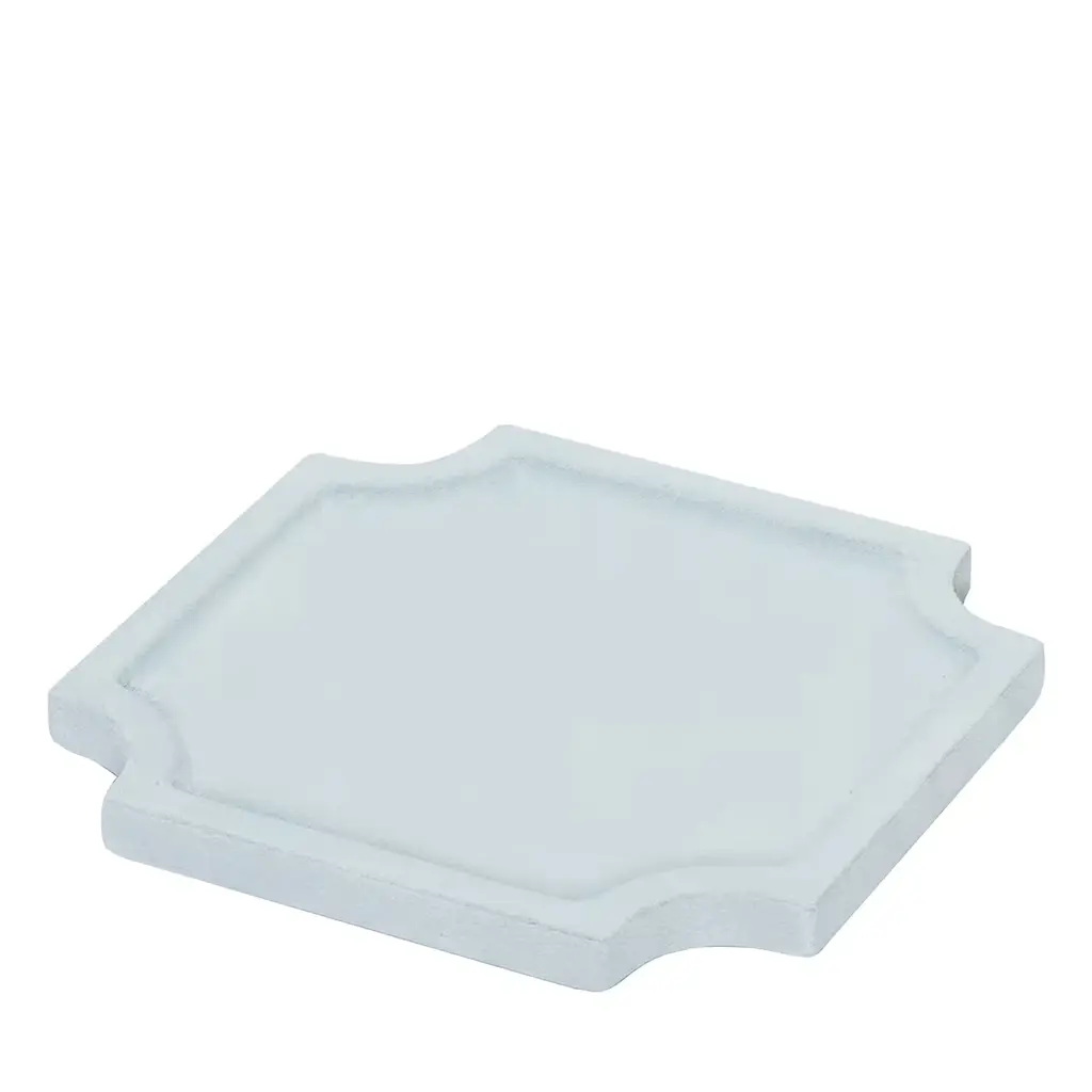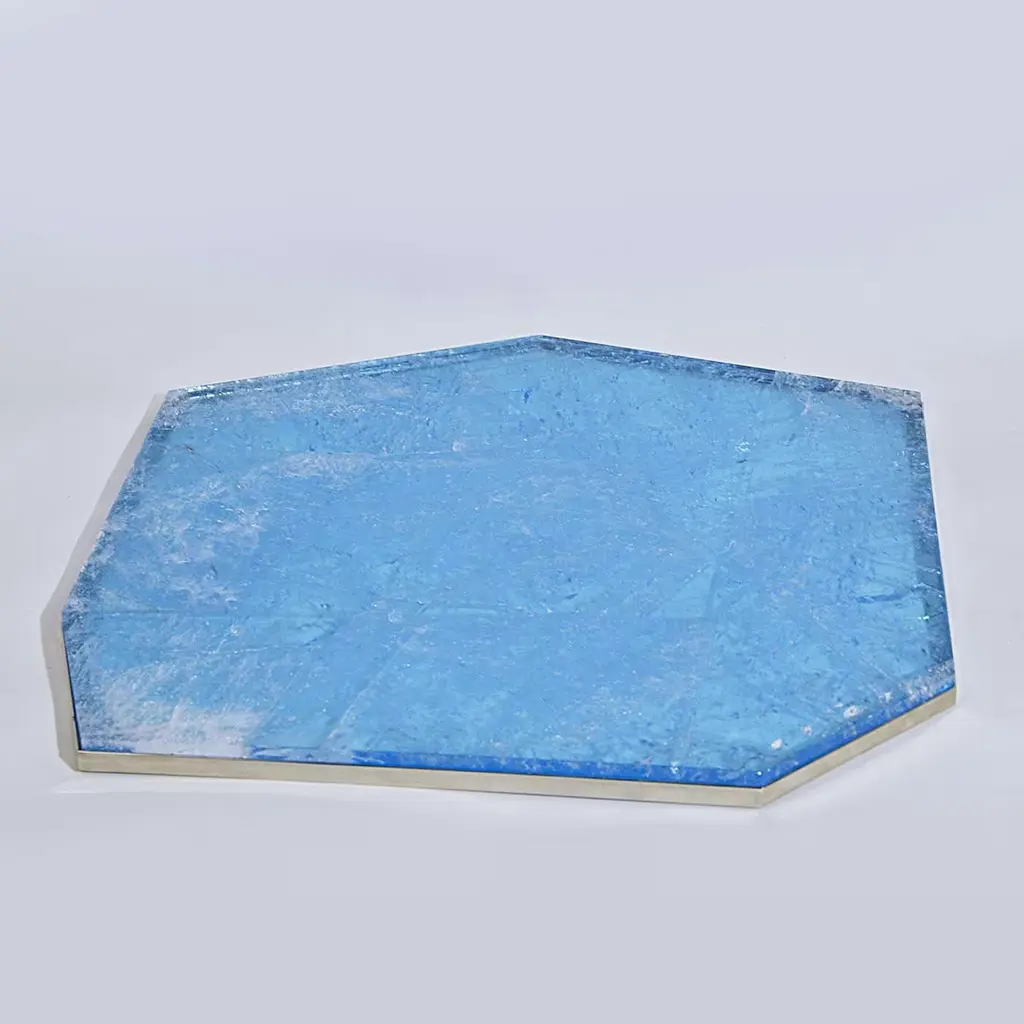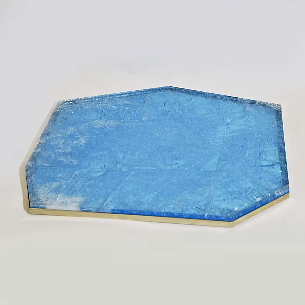 A dynamic and original composition, this geometric tray merges modern design aesthetic with limitless creativity. Crafted of rich light blue quartz, the distinctive, irregular silhouette is sleek and expressive. The sinuous white striations and blue flecks in the crystal elegantly complement the angular edges, a visually striking design detail. A subtle frame in nickel-plated brass supports the composition. A whimsical work of art, this will be a stunning centerpiece in an entryway or living room.