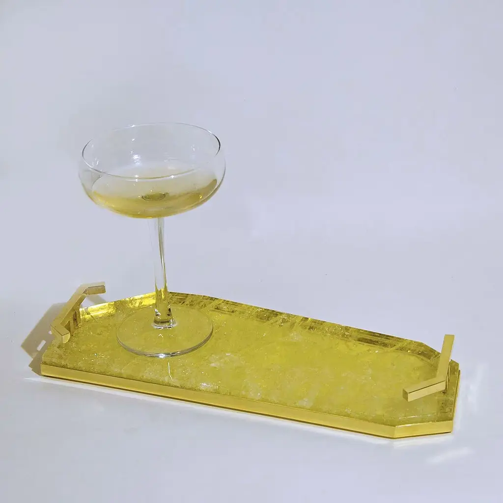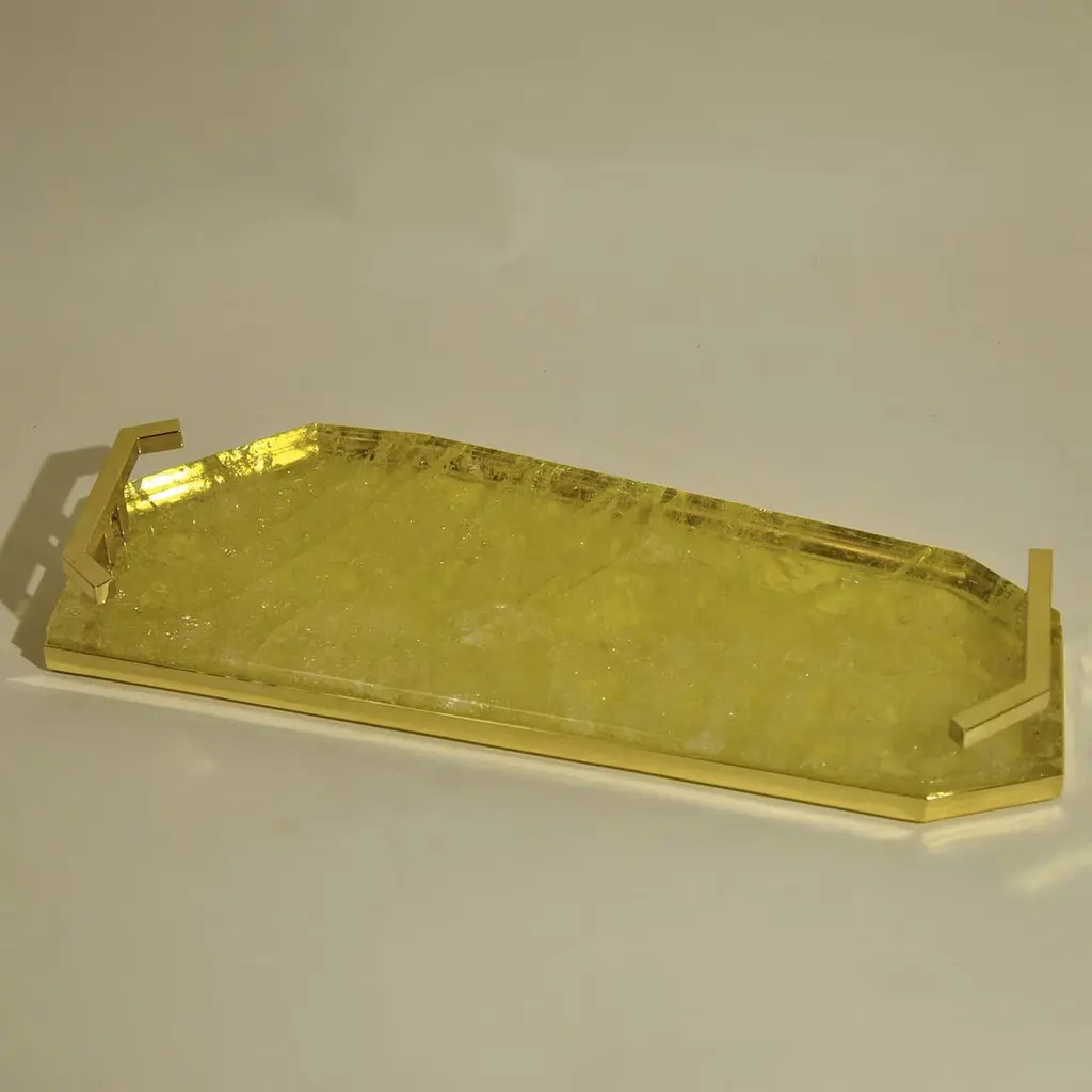 Inspired by the natural contours of crystals, this abstractly shaped tray will add elegance to any decor. Made of yellow quartz, this radiant crystal infuses breathtaking lightness and luxury into the piece. The daring, irregular silhouette is framed with yellow gold-plated brass, effortlessly complementing the rich color of the crystal. Sinuous white striations contrast with the geometric handles, adding balance and textural harmony to this piece of functional decor.