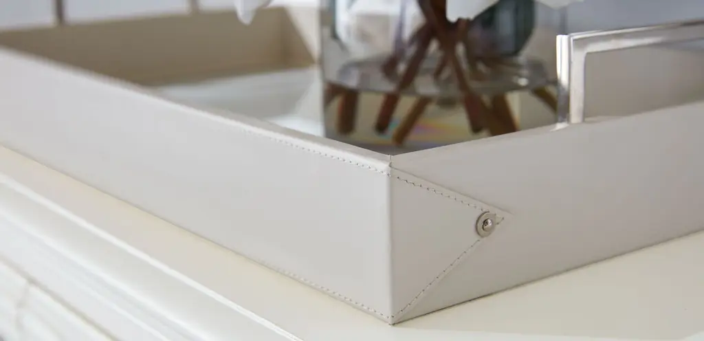 Covered in boot leather and adorned with angular metal handles, our Brewster leather tray feels right at home on dining tables, coffee tables, dressers, and vanity tops—anywhere you may need a handsome stage for décor or a luxe way to keep your essentials in order.