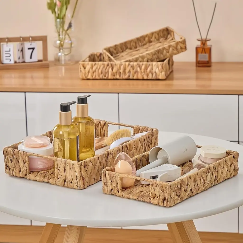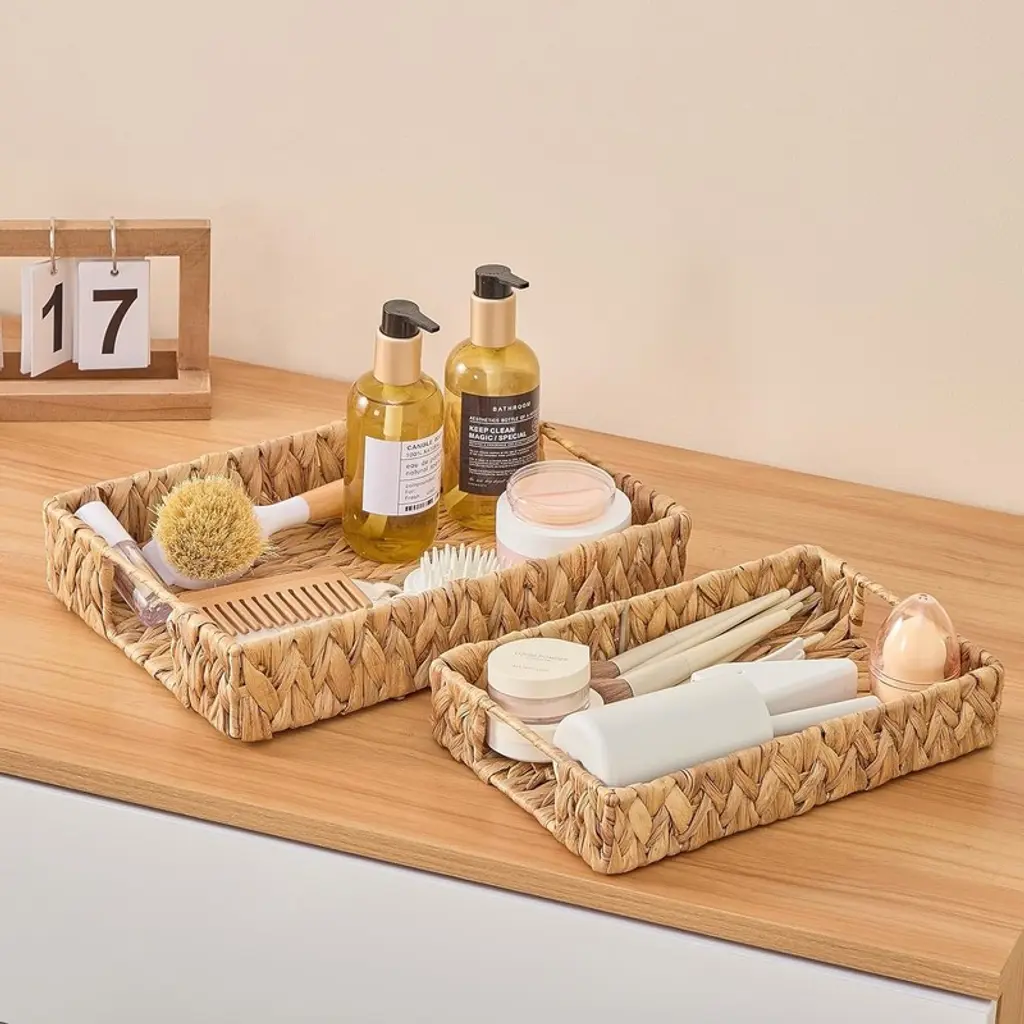 Brinjoy 2-piece Water Hyacinth Tray Set - Handwoven Storage Trays With Handles (12.6" & 11" Rectangular Organizer)