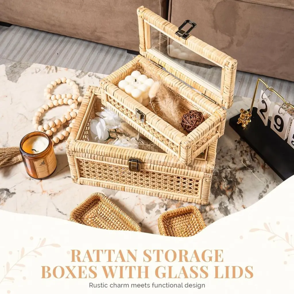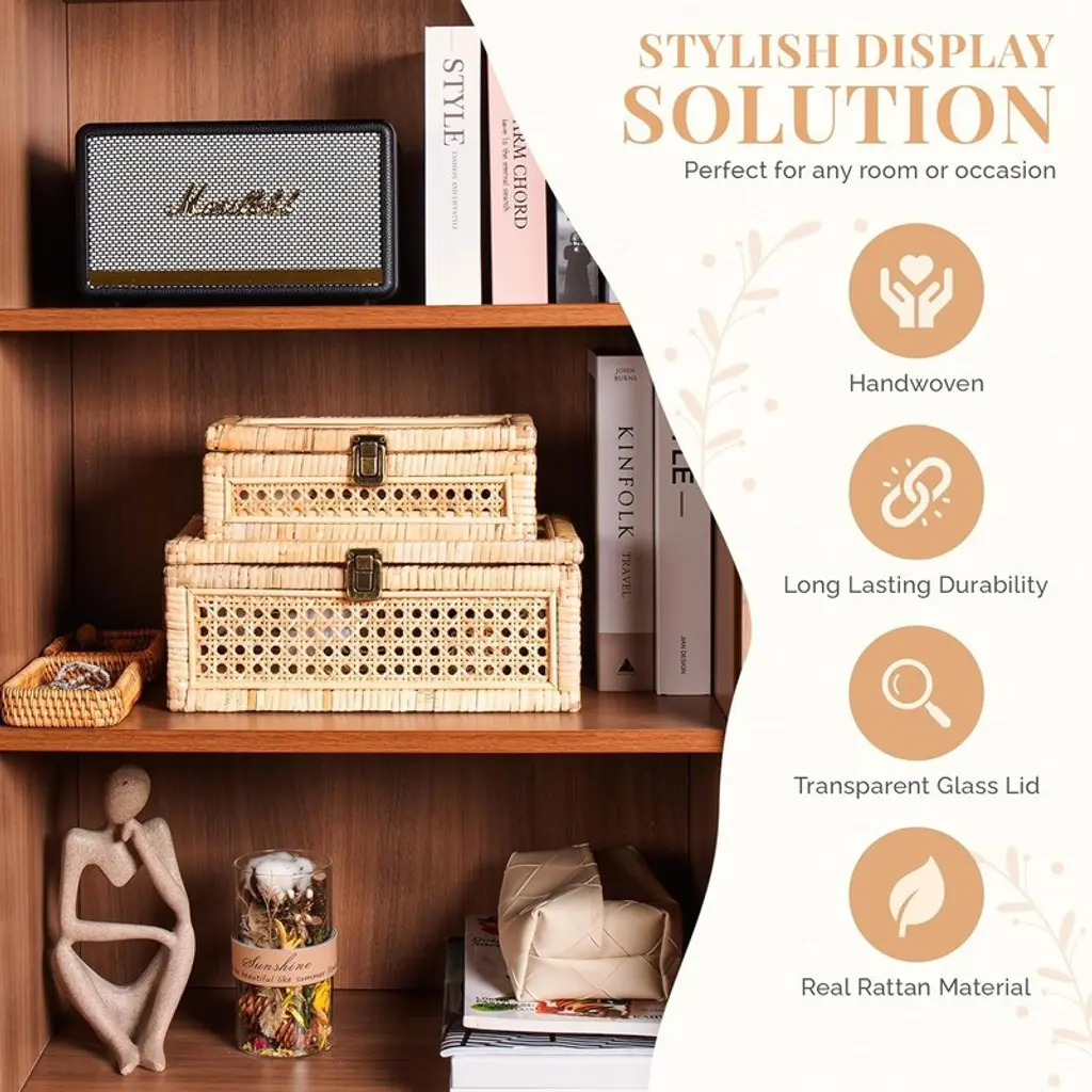 Brinjoy Bohemian Woven Rattan Display Boxes Set Of 2 With Glass Lids - Rectangular Storage Boxes With Removable Tray For Home Decor