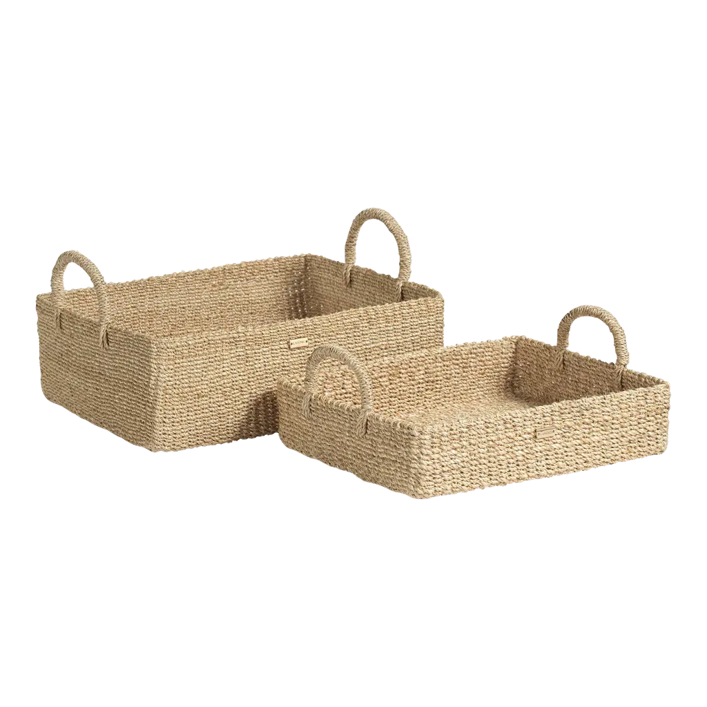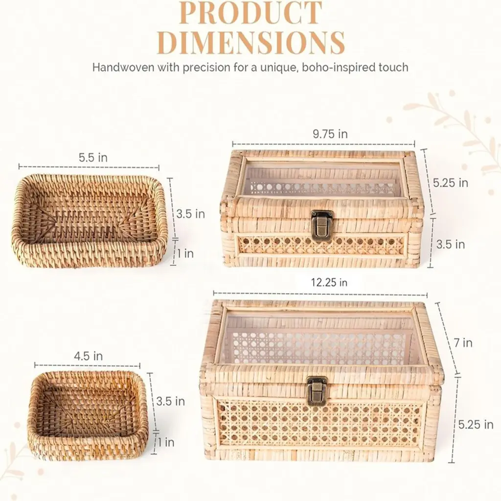 This exquisite two-piece bohemian display box set combines artisanal craftsmanship with functional elegance, featuring handwoven rattan construction with hinged glass lids and removable organizing trays. The set includes a large box (12.25"L x 7"W x 5.25"H) and a smaller box (9.75"L x 5.25"W x 3.5"H), both meticulously crafted with durable wooden frames and intricate rattan weaving. The transparent glass lids protect cherished items like photos, jewelry, and memorabilia from dust while allowing clear visibility. Enhanced with two removable trays (5.5"L x 3.5"W x 1"H and 4.5"L x 3.5"W x 1"H) for small item organization, this set offers versatile storage solutions while adding rustic bohemian charm to shelves, desktops, or floor displays. Product Selling Points: Dual-Size Display Boxes Includes large (12.25") and small (9.75") boxes with hinged glass lids, providing flexible storage for diverse items while maintaining visual accessibility. Removable Organizing Trays Features two handmade trays (5.5" and 4.5") for compartmentalized storage of small items like jewelry, keepsakes, or trinkets within the main boxes. Handwoven Rattan with Wood Frame Crafted from natural rattan with sturdy wooden frames, showcasing intricate bohemian patterns and artisanal durability. Dust-Protected Glass Lids The hinged glass lids protect contents from dust and damage while allowing continuous display without opening the boxes. Bohemian Decor Versatility Adds instant rustic elegance to any space with its boho-chic design, suitable for shelves, consoles, or as standalone decorative pieces.