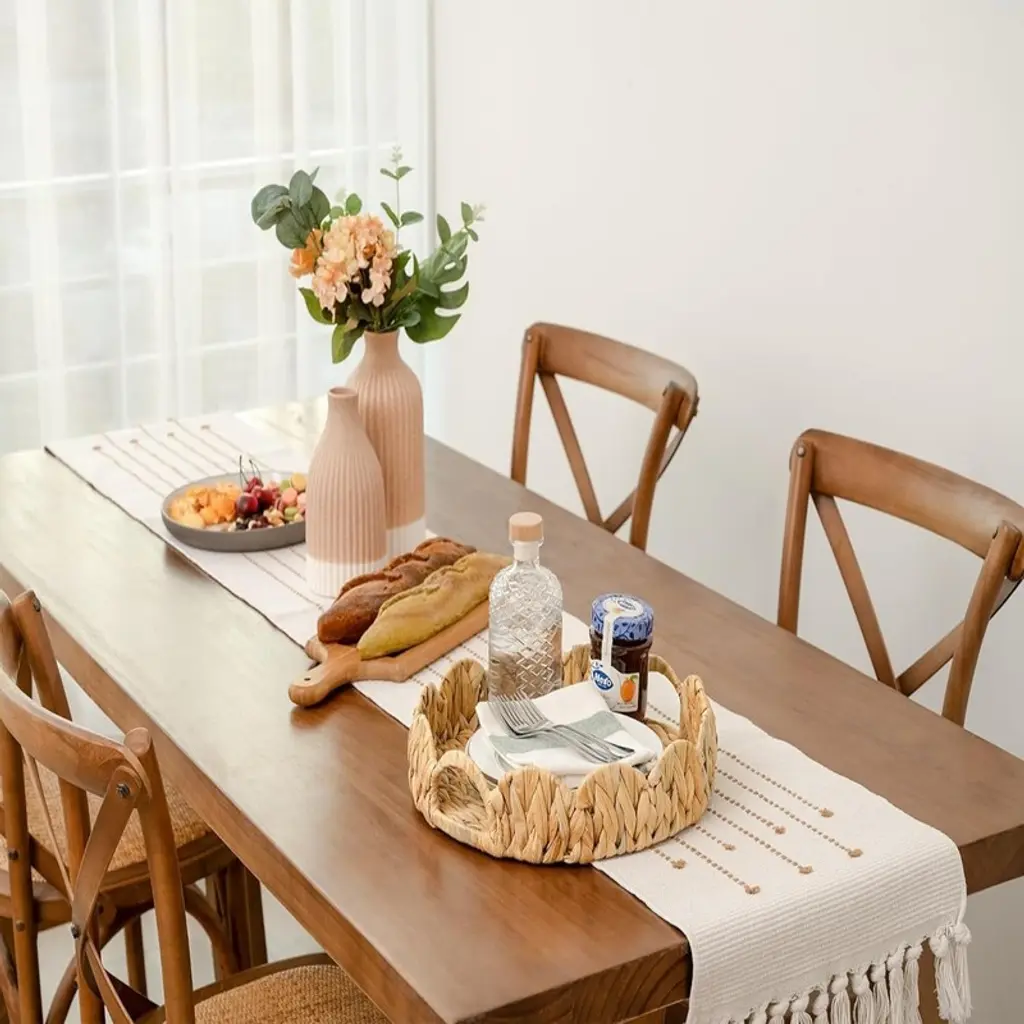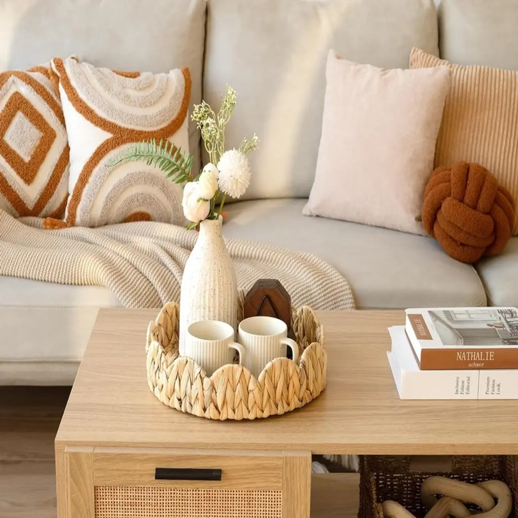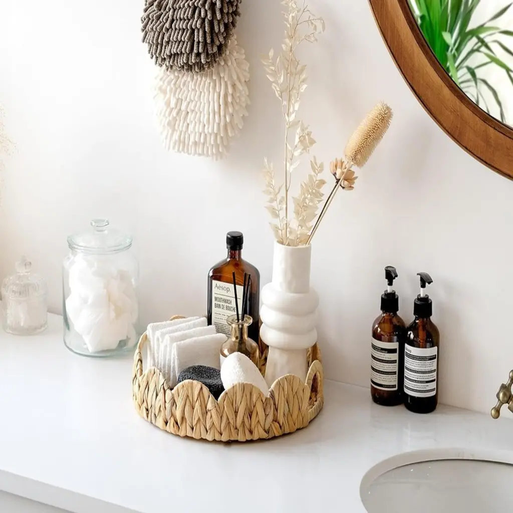This unique scalloped round tray features exquisite water hyacinth construction with a sturdy iron frame, creating a distinctive piece that combines traditional craftsmanship with contemporary design. The shell-inspired shape with scalloped edges offers a unique aesthetic that stands out as both functional organizer and decorative accent. Made from natural water hyacinth by skilled artisans, this tray brings organic elegance to any space. Perfect as a centerpiece or decorative accent, this tray offers both visual interest and practical functionality. The lightweight construction with built-in handles ensures easy portability, while the natural materials create warm, organic appeal. Whether used on dining tables, vanities, or kitchen islands, this handcrafted piece adds artistic flair and organization to your home. Unique Scalloped Design Features distinctive shell-inspired shape with scalloped edges that create artistic visual interest and unique aesthetic appeal. Natural Water Hyacinth Construction Crafted from premium water hyacinth with sturdy iron frame, combining natural materials with durable support structure. Integrated Handles for Carrying Built-in handles provide comfortable grip and easy transport between different locations and uses. Artistic Centerpiece Potential The unique design makes it perfect as a decorative centerpiece that adds artistic flair to tables and surfaces. Versatile Decorative Use Suitable for various locations including dining tables, vanities, kitchen islands, and as general decorative accent pieces.