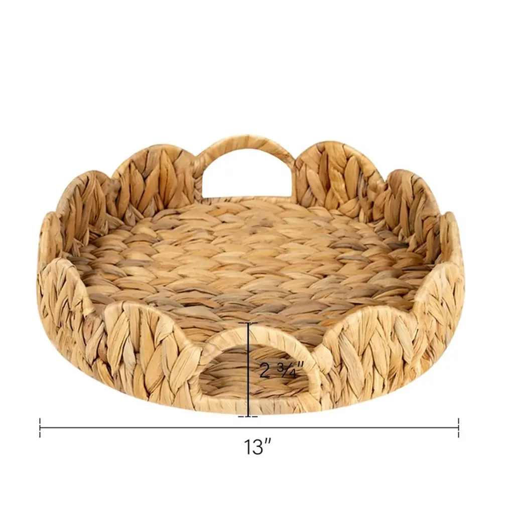 Brinjoy Scalloped Round Water Hyacinth Tray - Handwoven Rattan Tray With Handles