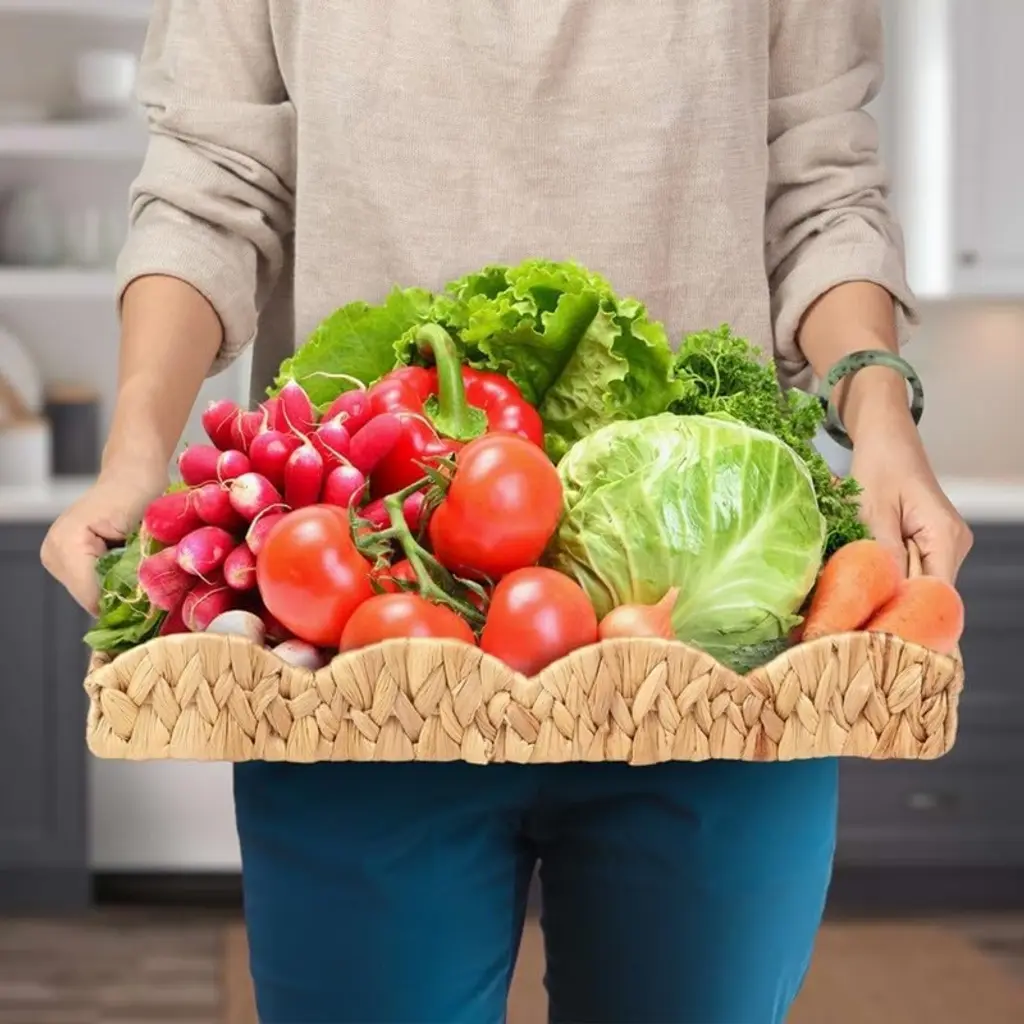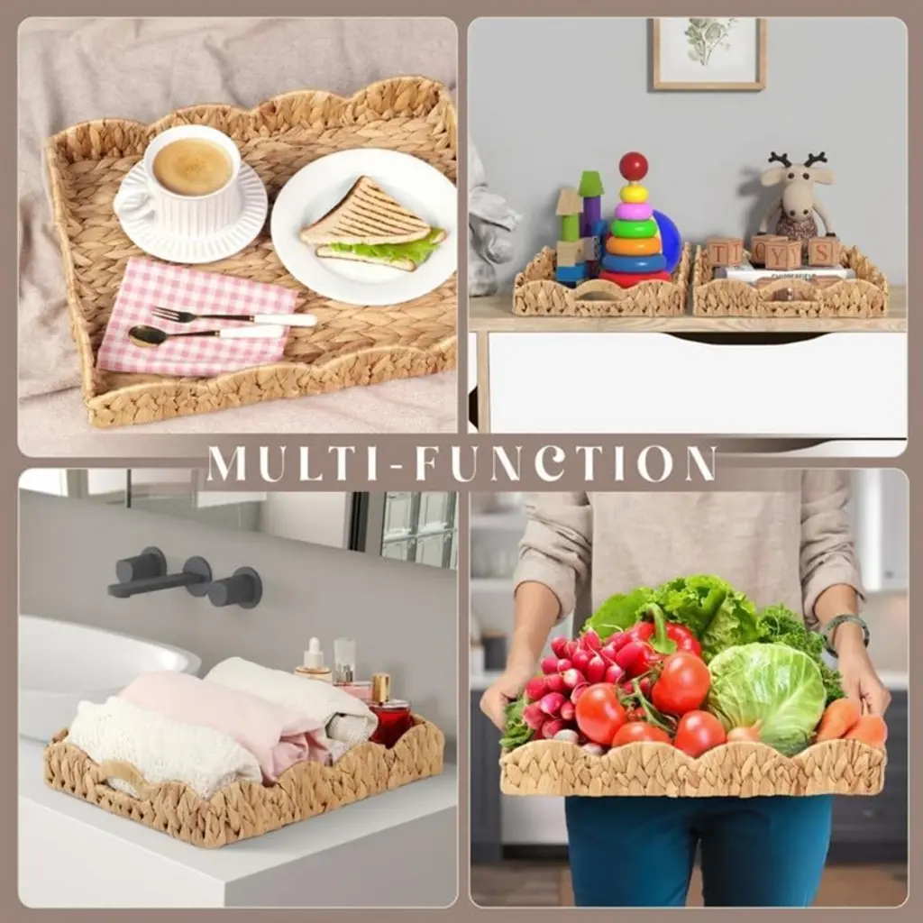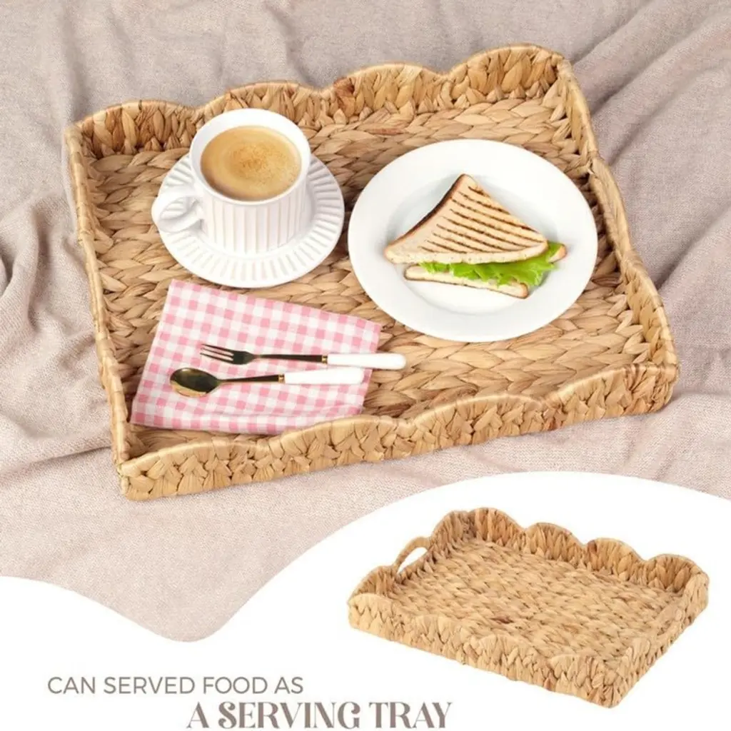 This exquisitely handcrafted water hyacinth tray combines artisanal elegance with exceptional functionality. Measuring 17" L x 13" W x 3" H, this rectangular tray features beautiful scalloped edges and integrated handles, crafted from natural water hyacinth with reinforced metal framing. The traditional weaving techniques showcase meticulous craftsmanship while providing durable, everyday usability. Perfect for organizing kitchen condiments, dining essentials, or office supplies, this tray brings organic warmth and practical organization to any space. Designed for both aesthetic appeal and practical use, this versatile tray serves multiple purposes¡ªfrom kitchen organization to desktop storage. The natural water hyacinth material offers sustainable durability while the scalloped edges add distinctive decorative appeal. Whether used for storing bottles and utensils or as a decorative accent, this handcrafted piece combines rustic charm with functional design. Product Selling Points: Artisanal Handwoven Craftsmanship Each tray is meticulously handcrafted by skilled artisans using traditional techniques, ensuring exceptional attention to detail and unique character in every piece. Scalloped Edge Design with Handles Features beautifully crafted scalloped edges and integrated handles that combine decorative appeal with practical carrying functionality. Natural Water Hyacinth & Metal Frame Constructed from durable water hyacinth with reinforced metal framing, offering both structural strength and sustainable material benefits. Spacious 17x13 Inch Organization Generous dimensions provide ample space for organizing condiment bottles, utensils, napkins, office supplies, or decorative items. Eco-Friendly Sustainable Material Made from renewable water hyacinth that promotes sustainable living while offering natural durability and aesthetic appeal.