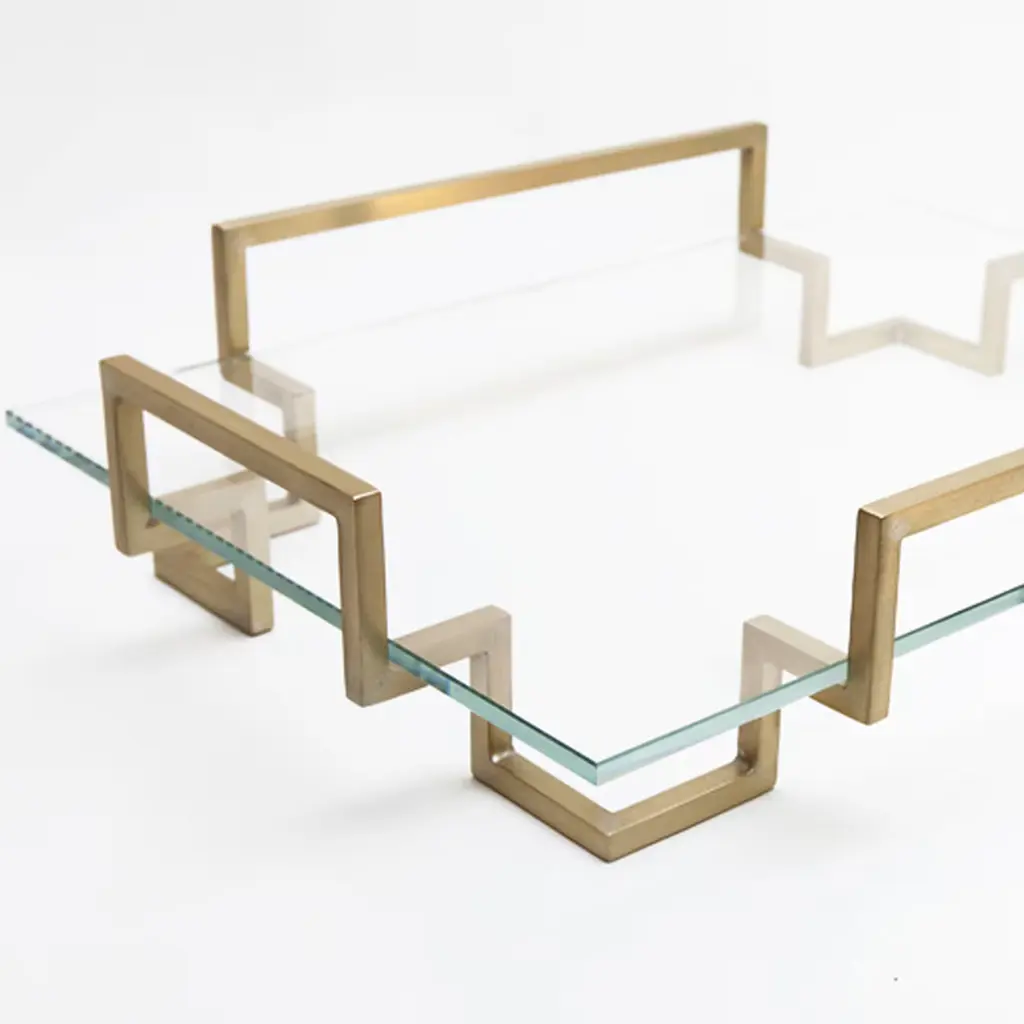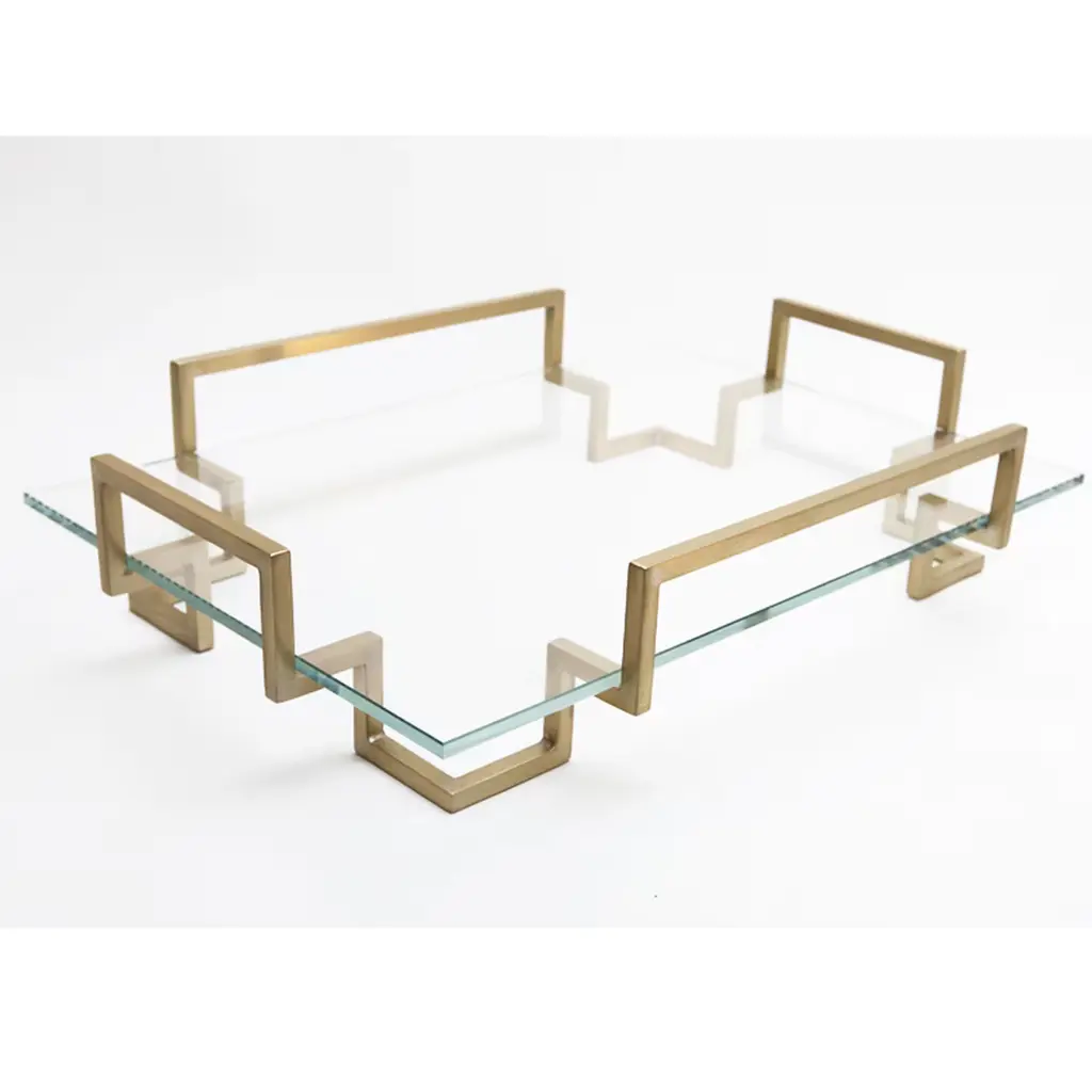 The geometric design and slimline symmetry of this serving tray make a statement with its brushed brass structure and fine cut glass bottom. This stylish piece is available in different metals and finishes and can be custom made to size if necessary.
