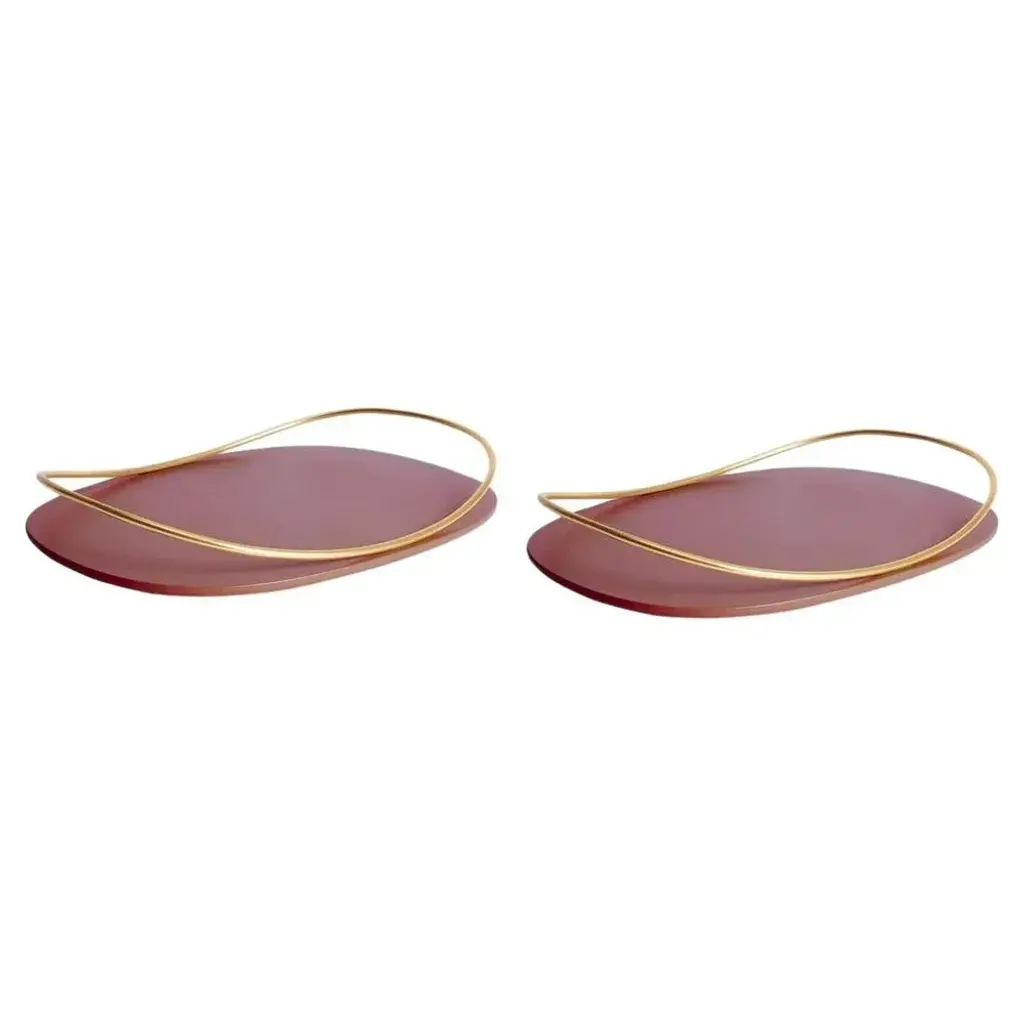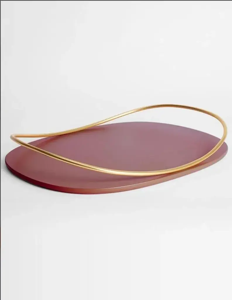 Burgundy touché c tray by mason editions dimensions: 36 × 48 × 6.4 cm materials: iron and mdf colours: taupe, cotto, burgundy, sage green, petrol green a light metal rod that rests on the surface and then lifts up, almost touching the surface with a quick tap, a movement that defines the handles of touché trays. The organic shape of the oval base communicates with the thin tubular, giving the impression of a perpetual undulatory motion, which seems to vanish when the trays are looked at from above. This oval tray with an oval handle won’t go unnoticed in the eyes of your party and dinner guests. The round mdf base is available in several colours, with a slim handle in galvanized 24k gold. A versatile design object, used to serve food and drinks as well as display jewellery and bedroom vanity.