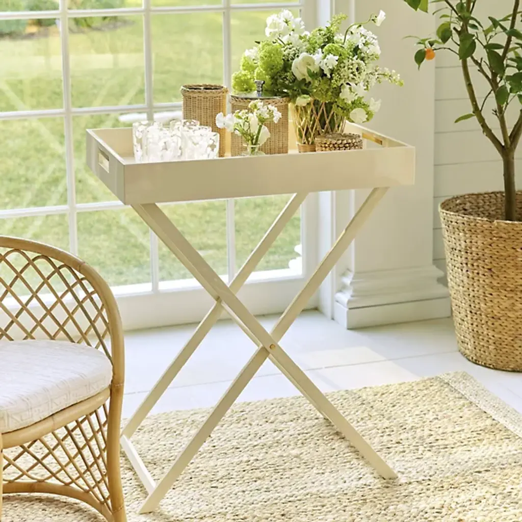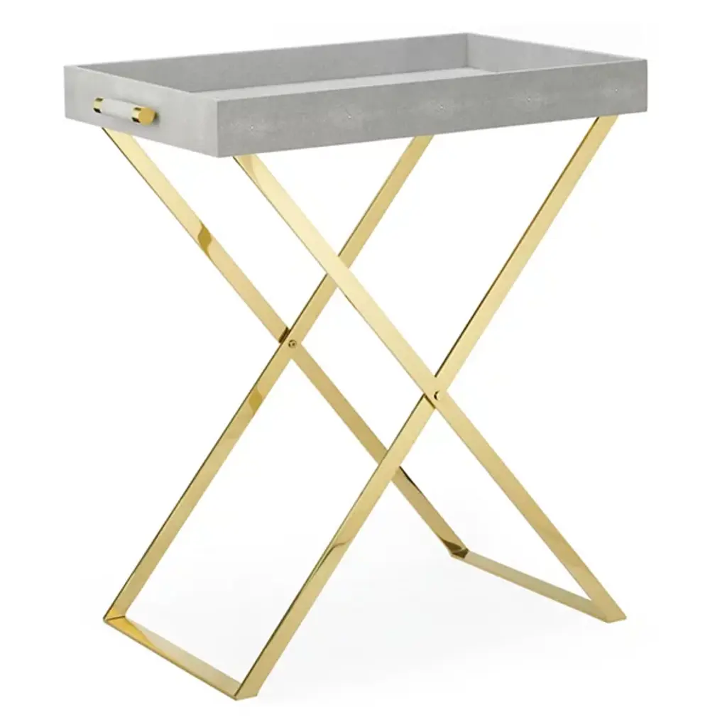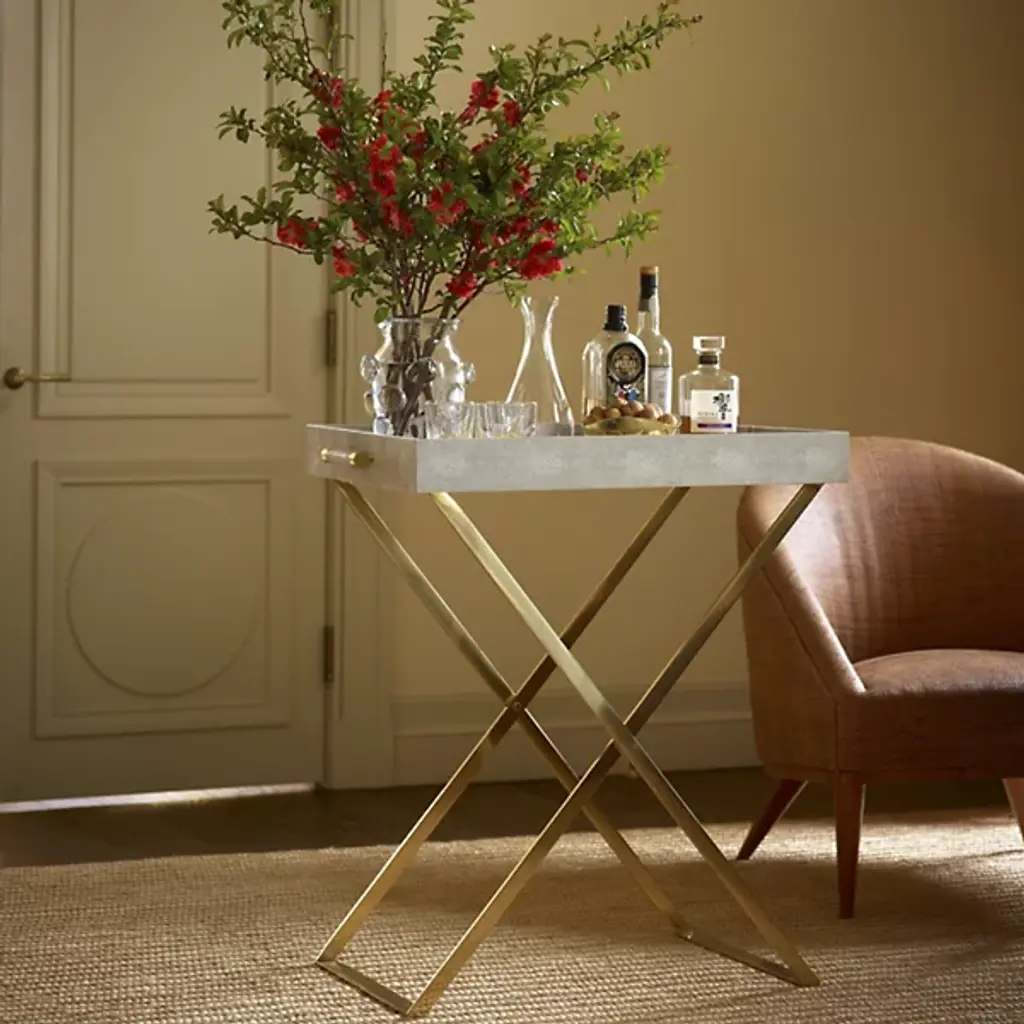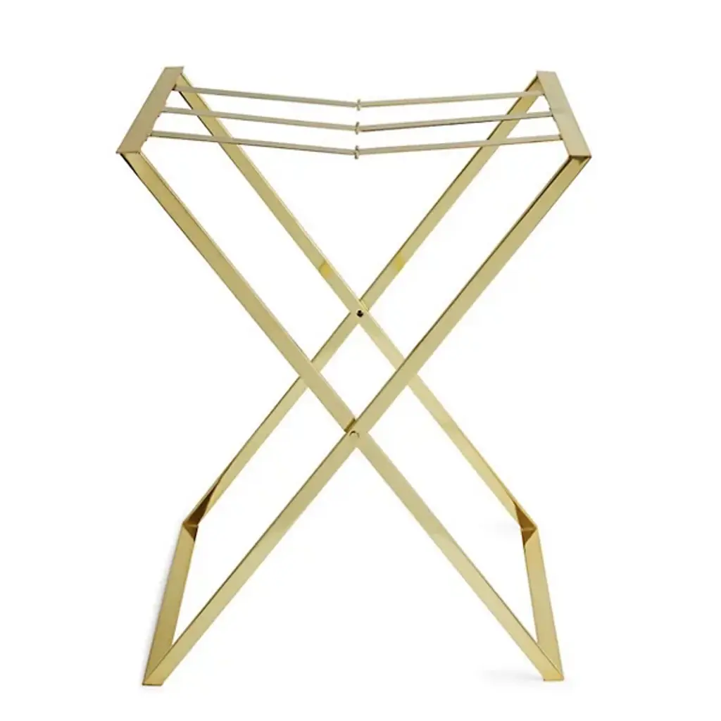 The Butler Tray Stand from AERIN becomes a flexible, fold-out base for the AERIN Butler Tray when placed beside a chair or bed. This X-shaped frame can easily be used near a table or within larger living spaces as a pop-up bar. Three cotton strips stretched across its bold brass structure lock it in place and balance the tray. The strong metal structure offers long-lasting service, while its folding form stows away in compact spaces until it is needed.