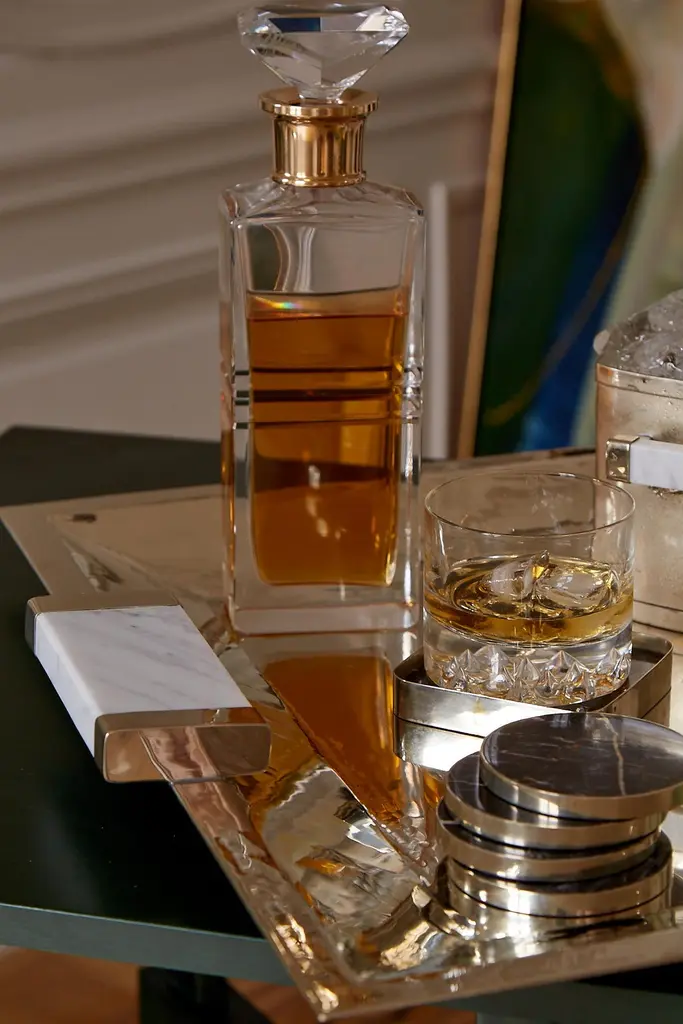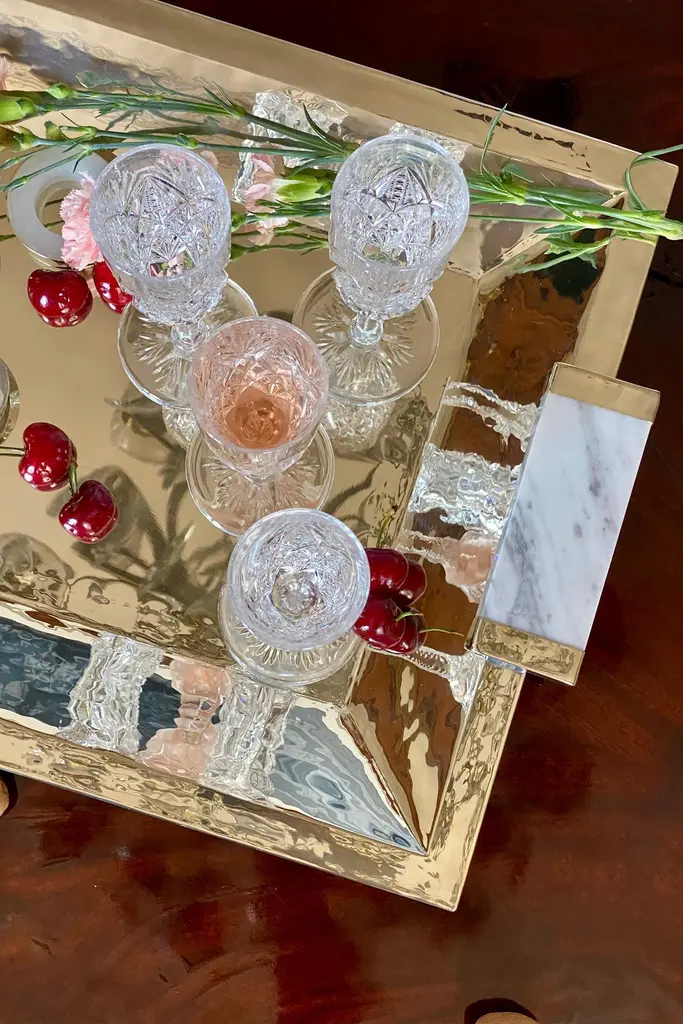 With the concept of intermingle materials from our earth, soft marbles and manually hammered alpaca, this sophisticated and elegant line is created, and it includes trays, champagne buckets and pitchers in different forms and sizes.Our pieces are made by hand. One of a kind.All natural stones may vary in color.