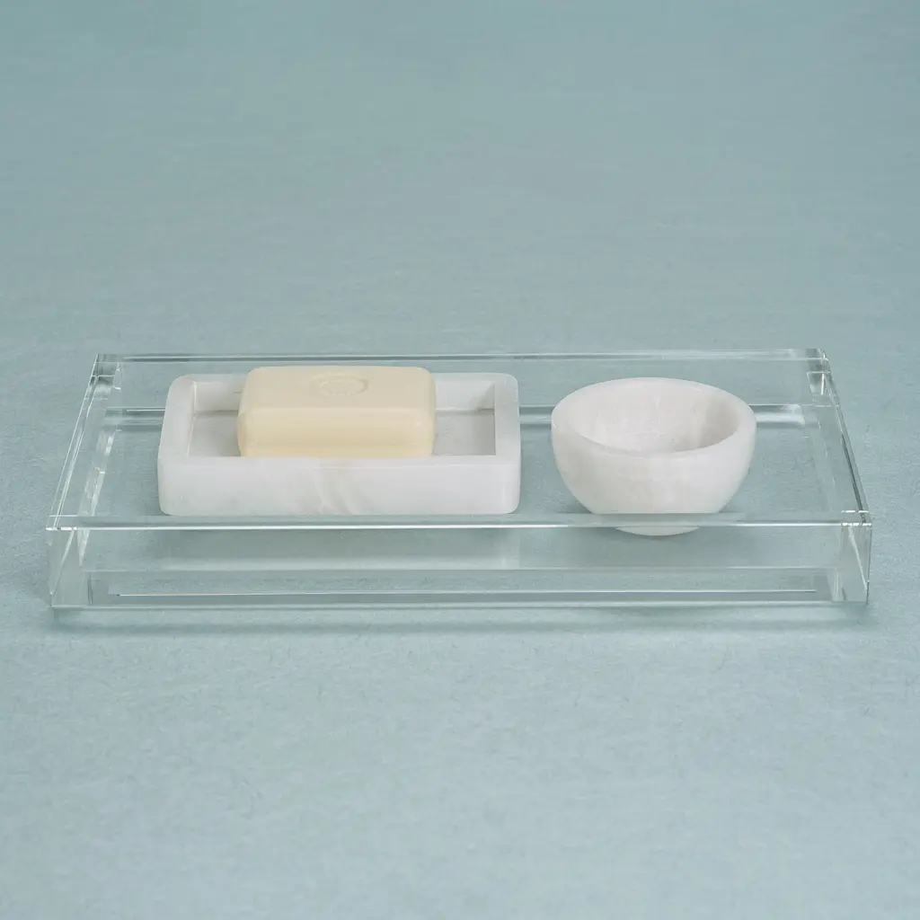 Designed with both elegance and functionality in mind, this rectangular tray boasts a stunning clear transparent finish, allowing the beauty of your displayed items to shine through. The straight clean lines of its design offer a timeless and sophisticated aesthetic, making it a perfect addition to any dressing table or bathroom counter. Features: Rectangular shape for a classic and versatile look Clear transparent finish Straight clean lines for a timeless and elegant design Heavy-duty construction for stability and durability Keeps counter tops clean and tidy with its minimalist design Weighty and elegant