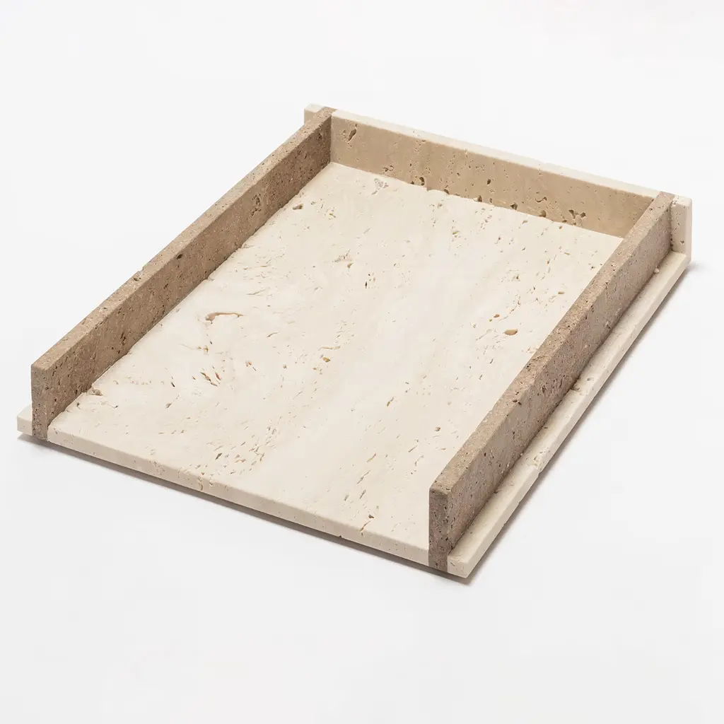 With its monolithic, purely geometric volumes, this collection for the office is characterized by graphic details born from the juxtaposition of two nuances of travertine, which creates a distinctive visual contrast with the material and porous aspect of such marble. Design by Simone Fanciullacci.