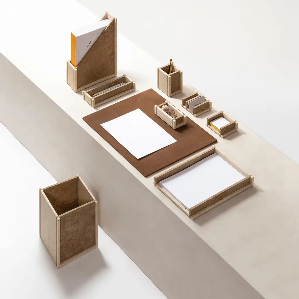 With its monolithic, purely geometric volumes, this collection for the office is characterized by graphic details born from the juxtaposition of two nuances of travertine, which creates a distinctive visual contrast with the material and porous aspect of such marble. Design by Simone Fanciullacci.