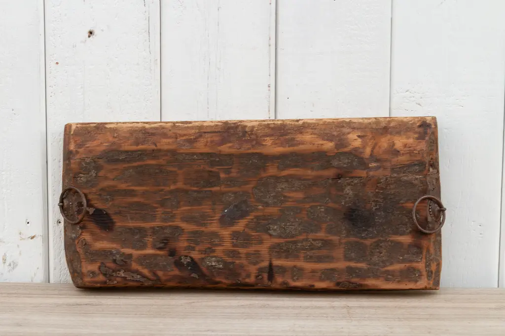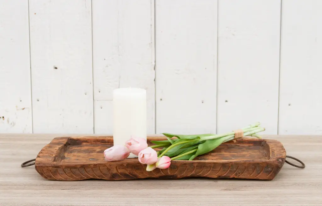 An old oval shape wood bowl originally used for kneading dough. Found in the Swat Valley. This antique dough bowl was made from a single log of wood. This rustic bowl has two iron ring carrying handles with tribal motif carvings.
