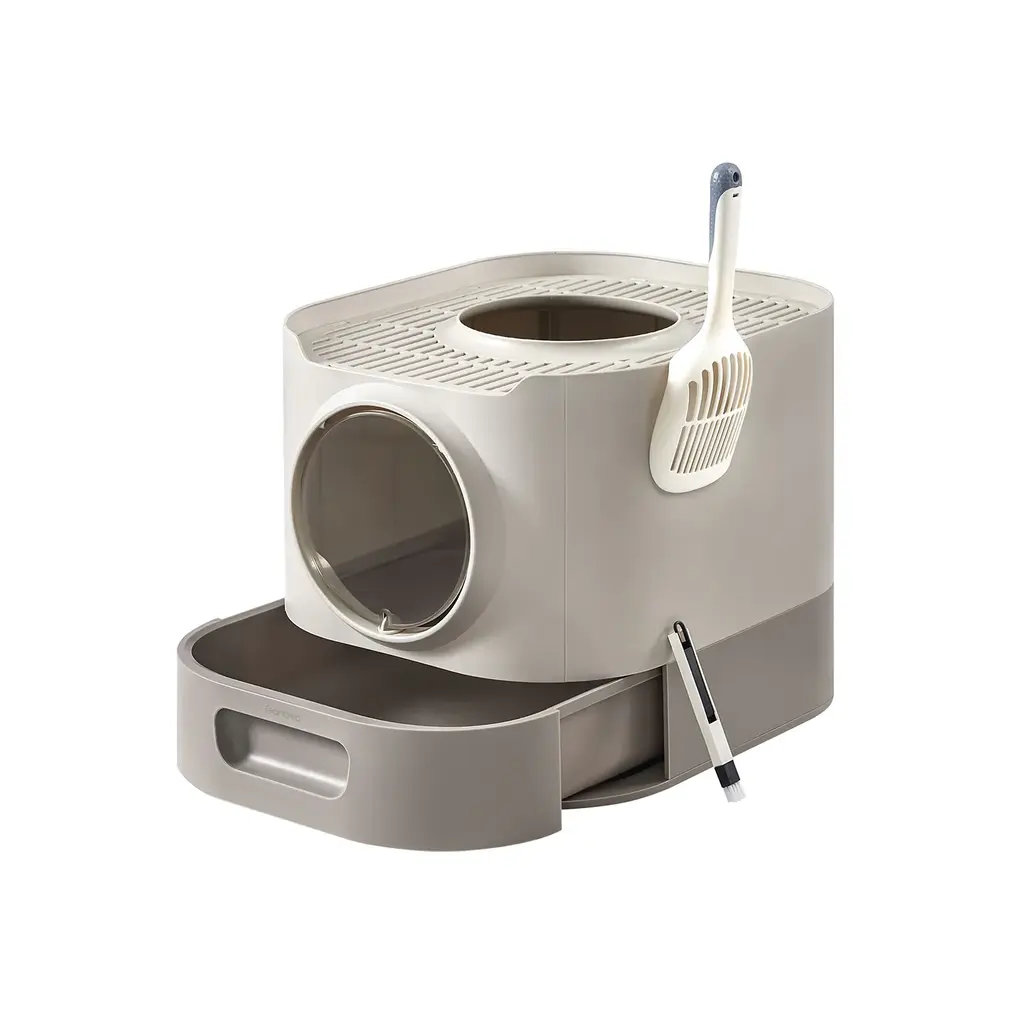 No More Smell: Enclosed design provide cats a privacy and security space to do their”business”. And the doors keep smell inside and won’t make strange smell in everywhere of your home. Come with filter foam to filter the odorAnti-splashing: The litter box with front and top 5.7mm litter holes, helping remove litter particles in cat's paws, they will drop into the litter box and leave seldom tracking. Make your home tidy and neat, no more messSpacious Enough: Large space size : 40.5x43x37.5cm, spacious enough allow cat comfortably to use it. Suitable for all cats with 6kg/13.2lbs, durable plastic will not wobble when assemble itThoughtful Designs: This cat litter pan is made of eco-friendly material which without odor or toxic. Provide reliable and safe to your furry friends. Come with scoop makes cleaning more faster and handy, just hang it to the box sides when no use it. Cats and owners will love itHandy Cleaning: It is super convenient to pull out the litter tray to clean and change litter, doing regular wash to keep the box neat and no odor with water, it will fresh as new. Must-have to facilitate for cat ownersSpecifications:Type: Cat Litter BoxFeature: Easy Clean, With Drawer, With ScoopAnimals: For small cats and kittensMaterial: PP PlasticColor: Grey & WhiteNet Weight: 2.3kg/ 5.07 lbsFit kittens and full-grown cats within 15kg/ 33.07 lbsProduct Dimension: L * W * H 48.3x35.8x38.8cm/ 19.01x14.09x15.27 inchTop Entry: L * W 21x18.9cm/ 8.26x7.44 inchFront Entry: L * W 22.7x22.5cm/ 8.93x8.85 inchPackage Included: 1x Cat Litter Box 1 x Scoop 1 x Instructions 1x Filter Foam