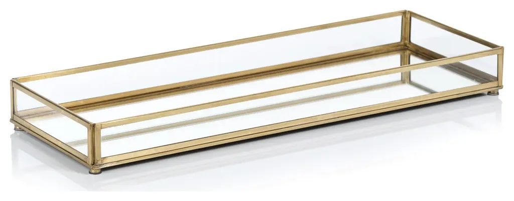 Straight lines and a gold finish give this rectangular mirrored tray its elegant, sleek appearance. Featuring polished gold hue metal sides and a mirrored bottom, this tray makes an ideal addition to contemporary decor. Display it on a coffee table to hold candles and bouquets of flowers or set it on a bathroom vanity to hold jewelry or perfume.� Rectangular tray� Polished metal frame� Mirrored glass surface� Open sided for easy carrying