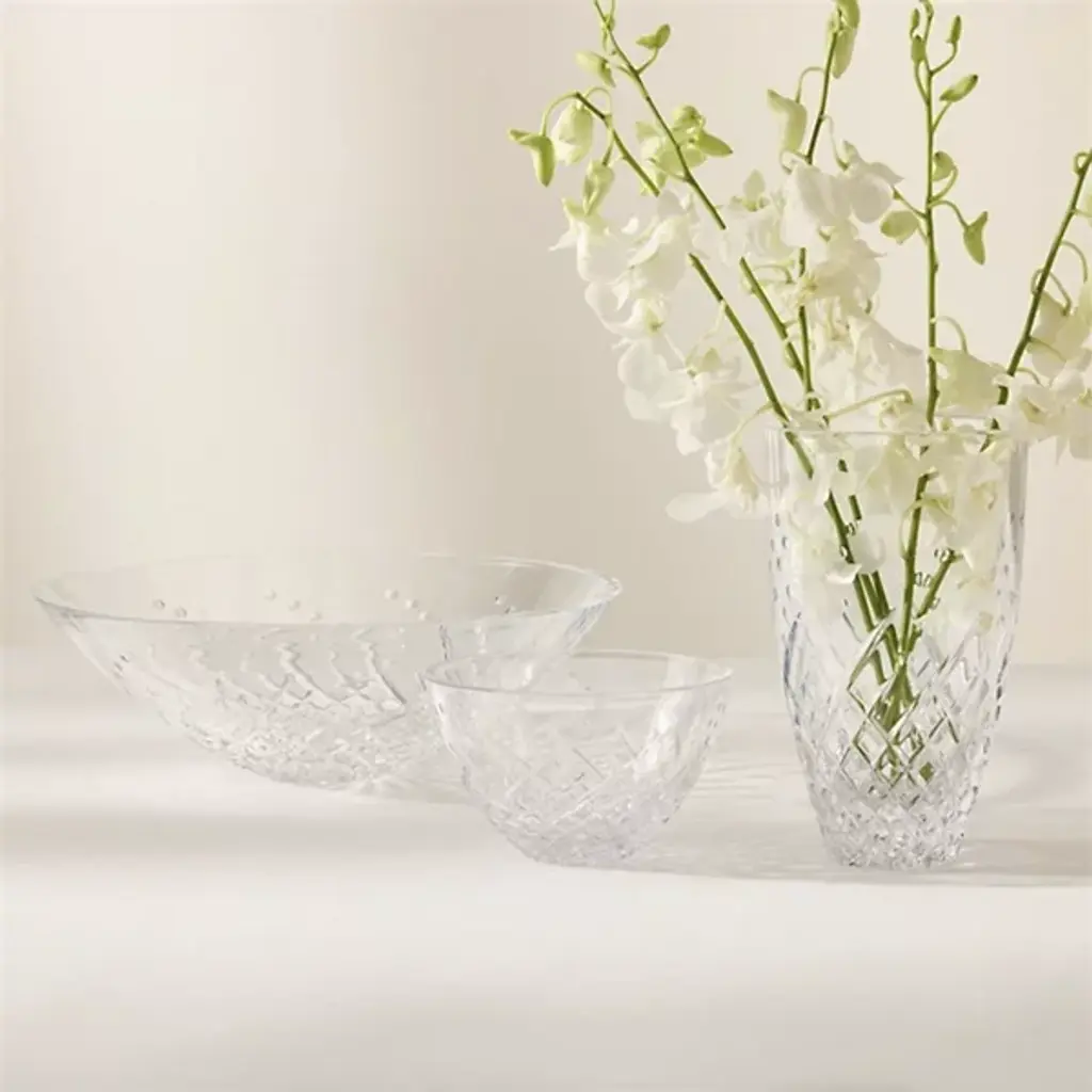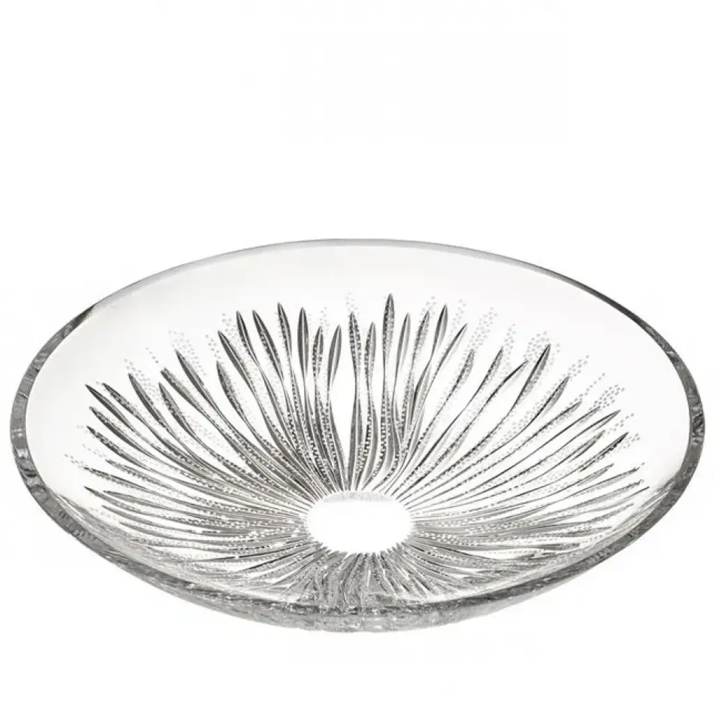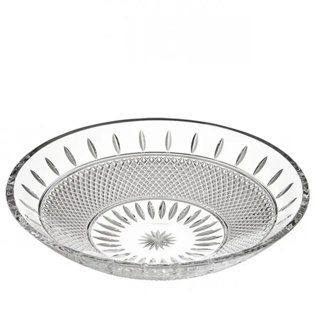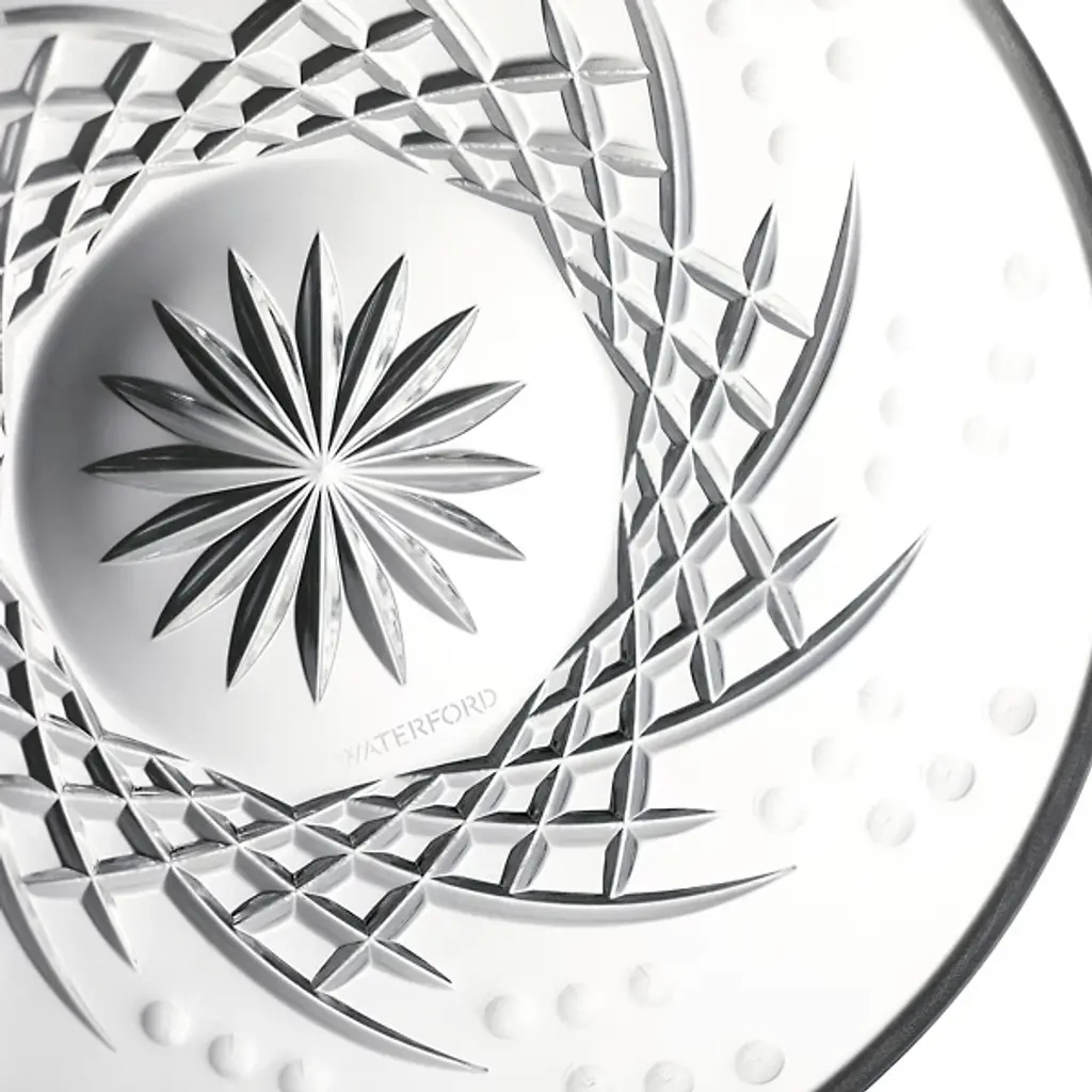 The Celebration Tray from Waterford showcases shallow-dish styling with refined geometric detailing across its surface. The crystal tray's broad, flat surface provides an ideal canvas for deep karo and olive patterns that catch and redirect ambient light. These intricate details turn functional storage into visual interest while the tray’s lead-free crystal construction ensures lasting clarity and durability.